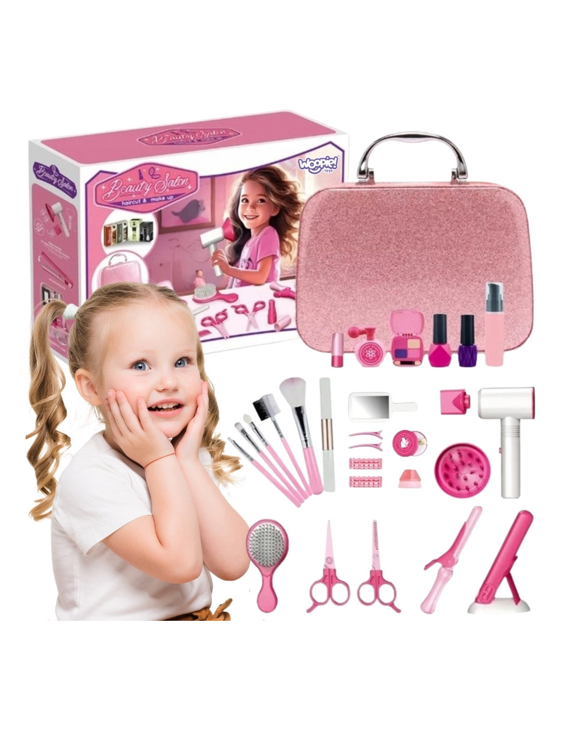 The Beauty Salon cosmetics set from Woopie is the perfect choice for any little styling, hair, and makeup enthusiast. Packed with 43 pieces , this set provides hours of creative play and lets your child experience the thrill of a real beauty salon. Each accessory has been carefully designed with children in mind – they are safe, lightweight, comfortable to use , and made of durable materials . The entire set is packaged in a charming pink suitcase with a glittery finish , which not only adds charm but also makes storage and portability easy. It's the perfect gift that will spark any girl's imagination and inspire their creativity.