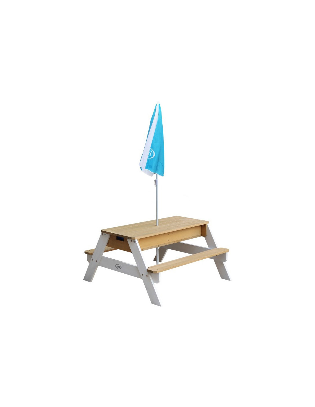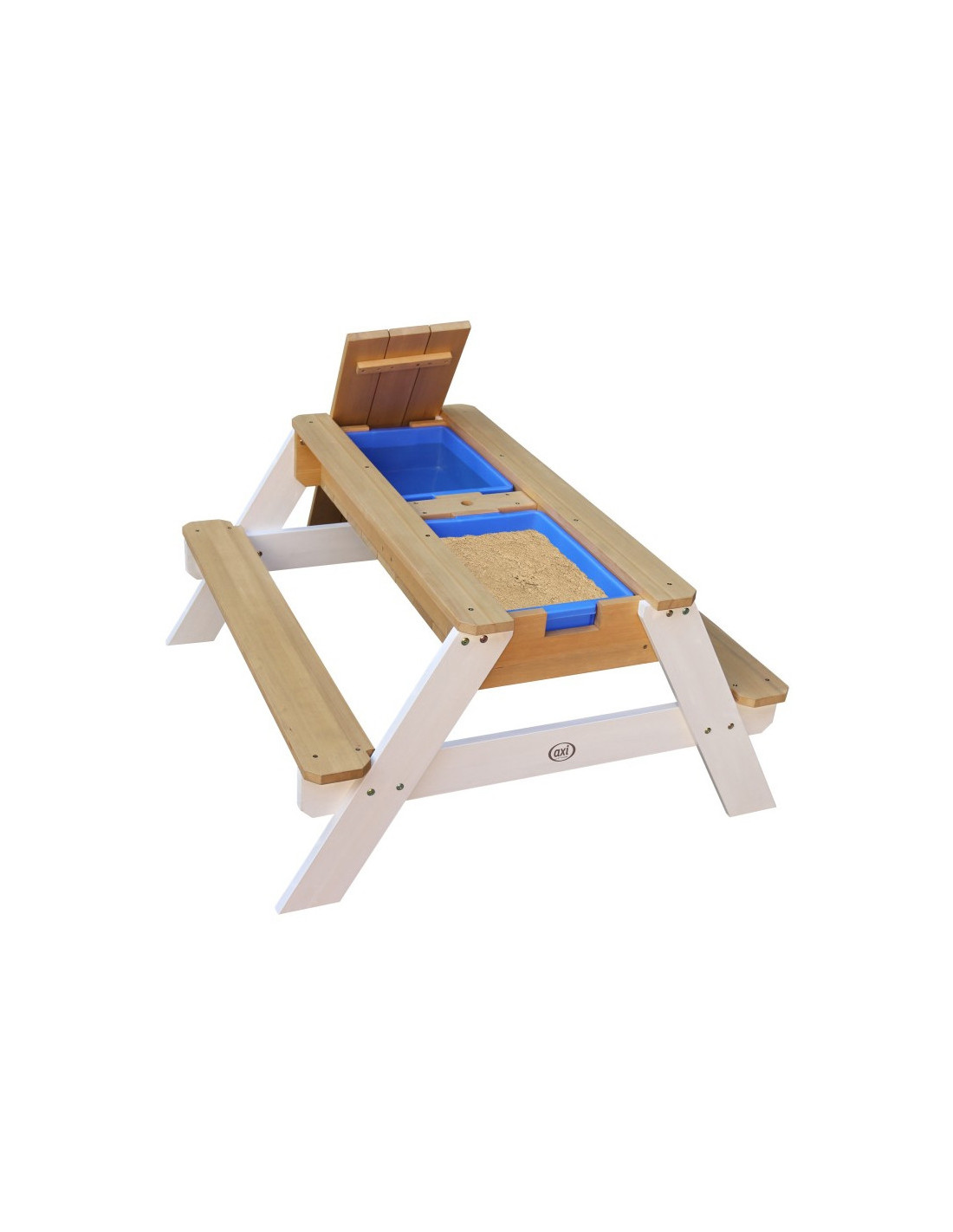 The Nick Picnic Table from the renowned brand AXI is a multifunctional table with a secret compartment with two blue containers beneath the removable tabletop. These blue containers can be filled with sand and/or water, but of course, they can also be used to store toys. Furthermore, the containers are removable , making them easy to clean. The classic combination of sand and water always works well with children! In a flash, you can transform a sand and water table into a picnic table where children can create, draw, or enjoy treats.
