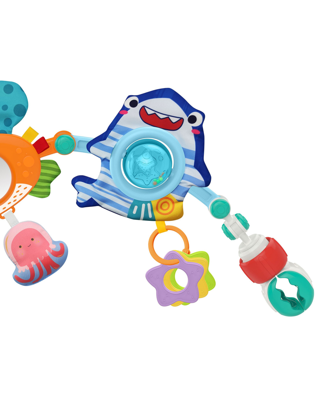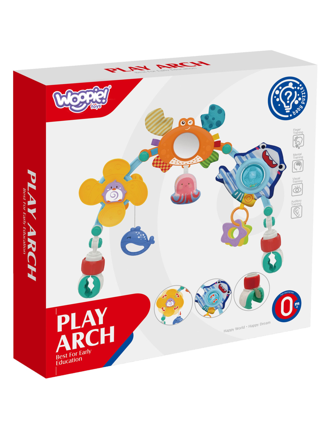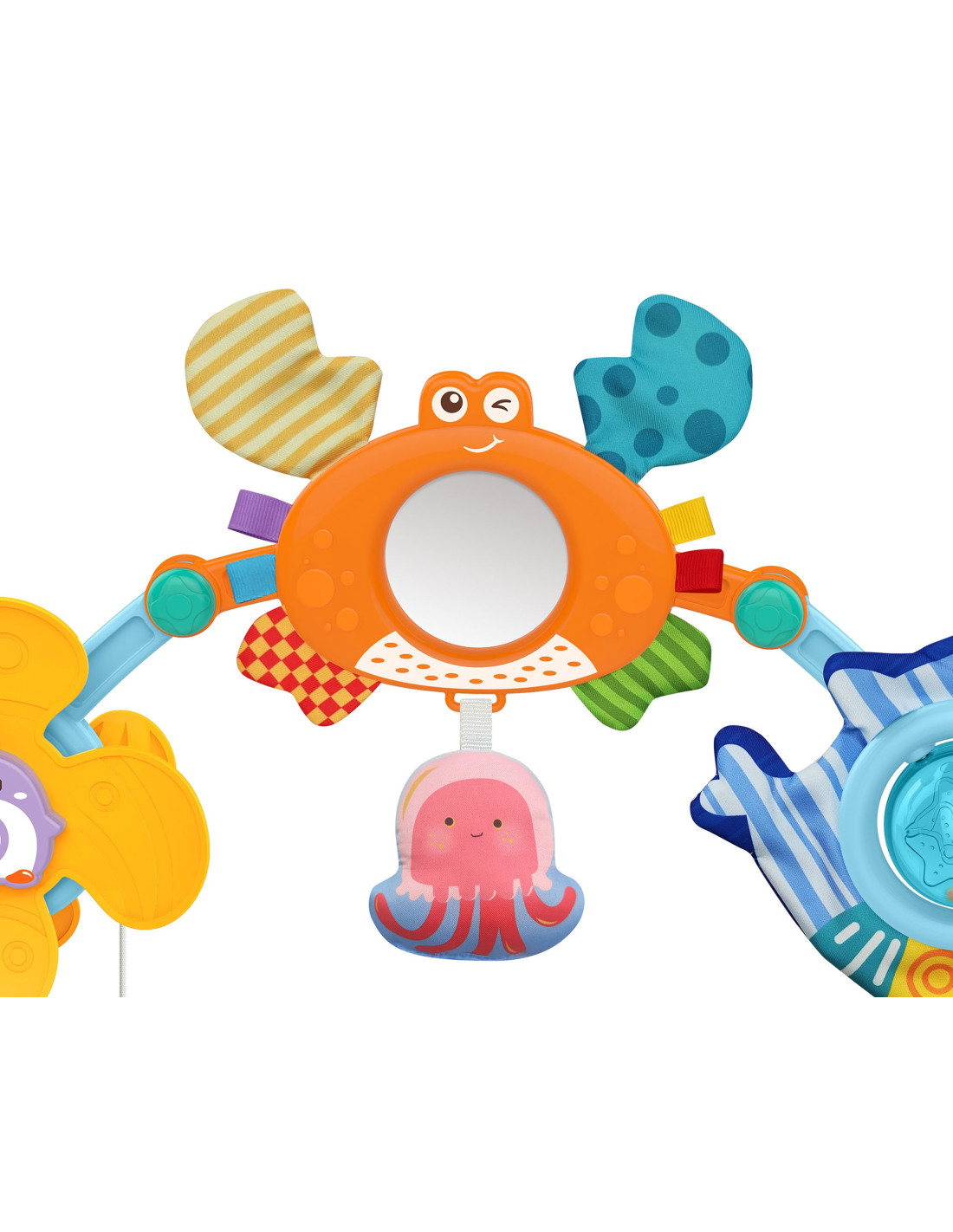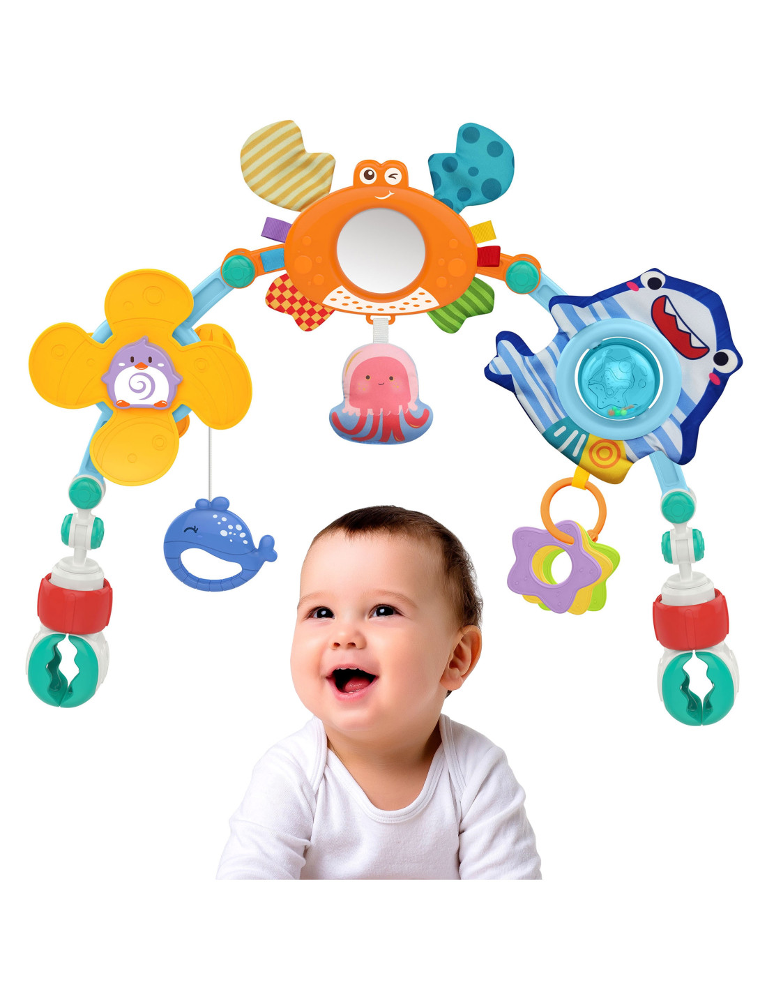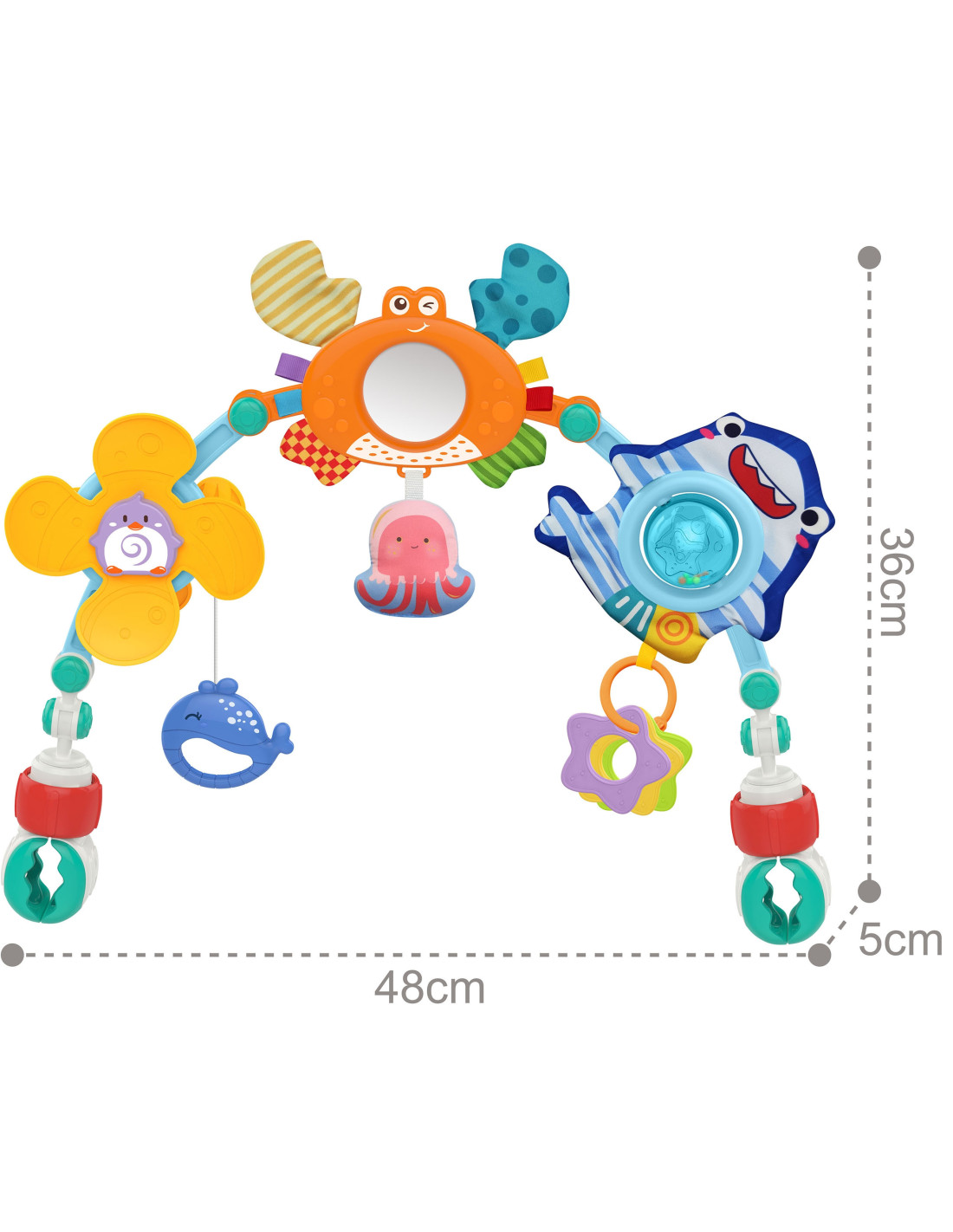 The Toy Arch from WOOPIE is a versatile toy that will add charm and entertainment to any stroller, car seat, or crib. It's incredibly flexible , so it can be easily attached virtually anywhere . The arch features various sea toys: a penguin pinwheel, a crab mirror, an octopus, a shark rattle, and a dolphin pendant , which respond to baby's interaction, as well as star-shaped teether pendants . Each toy has a different texture and action, stimulating baby's sense of touch and helping develop fine motor skills .