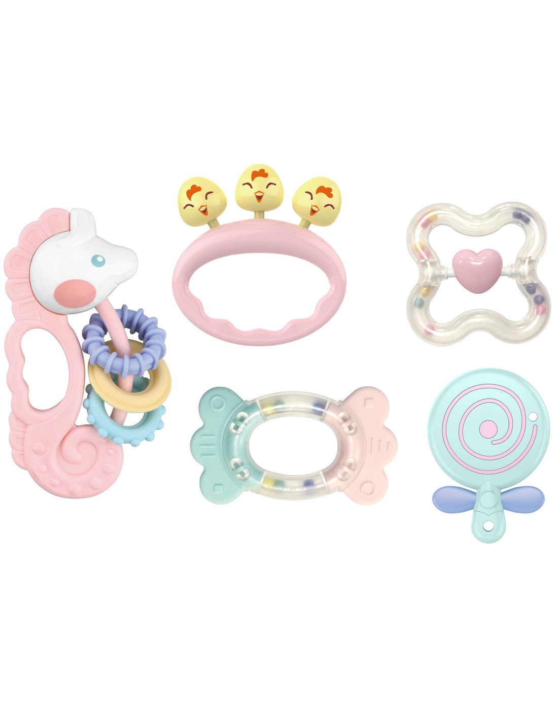 The WOOPIE Teether Rattle Set for Babies includes 5 colorful pieces designed to help your baby through teething . These teethers not only provide relief for sore gums but also stimulate visual and auditory development . Additionally, the concave and convex shapes and varied textures stimulate tactile development.