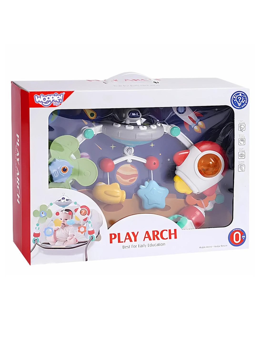 The WOOPIE Baby Arch with Toys from the WOOPIE brand is a versatile toy that will add charm and entertainment to any stroller, car seat, or crib. It's incredibly flexible , so it can be easily attached virtually anywhere. The arch features a variety of toys. This toy attracts attention and keeps your baby active and curious while in the stroller or car seat. The interactive arch plays beautiful lullabies and glows with changing colored lights. Designed to develop full-body movement and stimulate the senses.