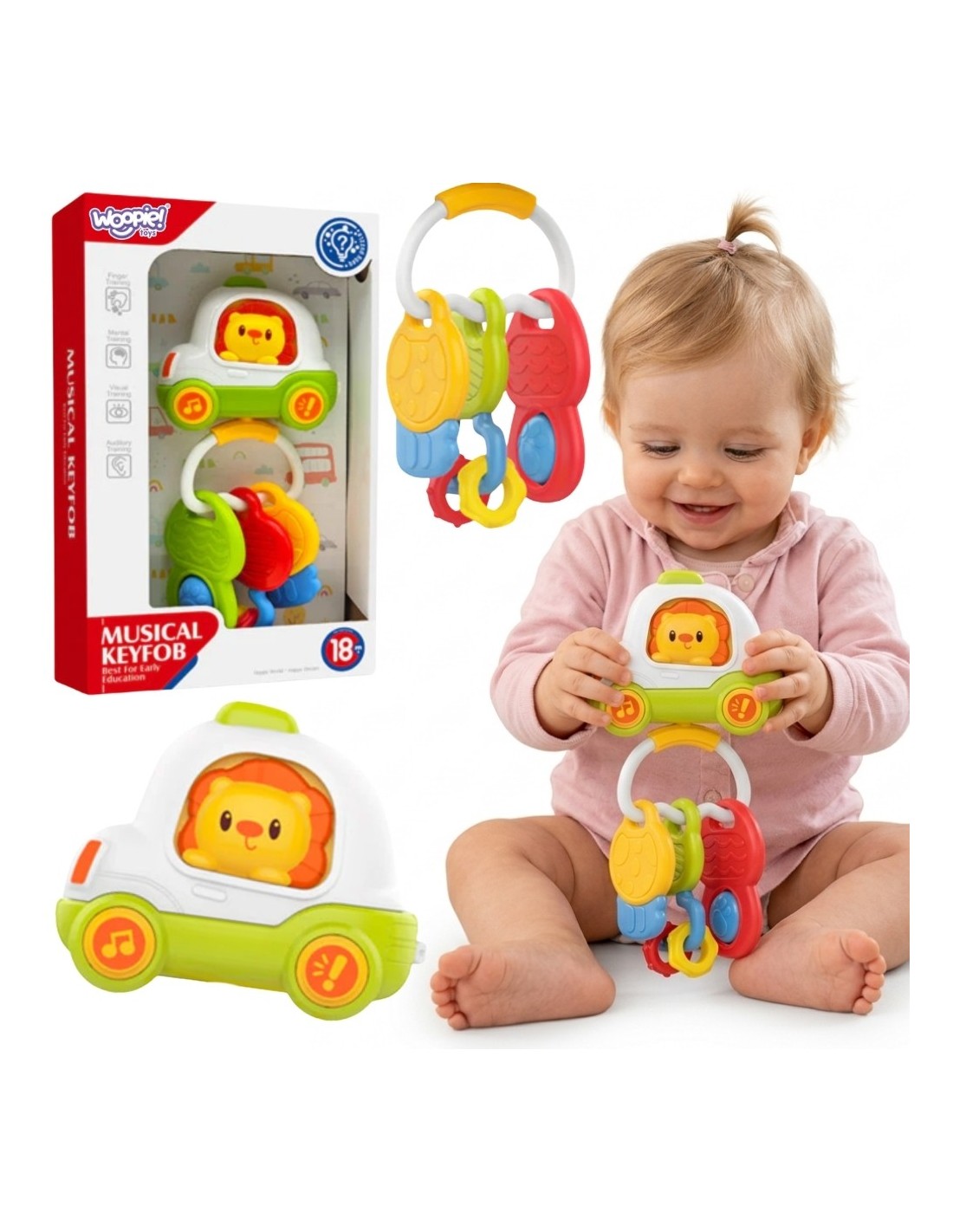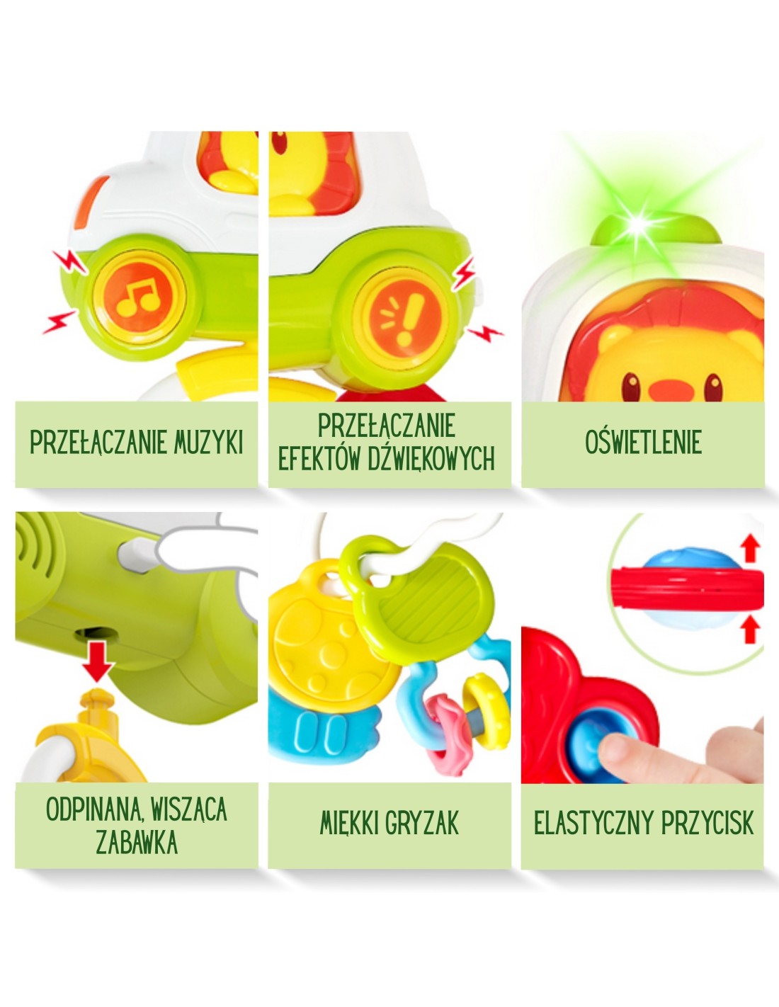 The colorful and interactive musical Remote Control Car with Keys toy is a perfect choice for every toddler! It's designed to support motor, sensory, and cognitive development through play from a young age. The charming lion in the car captures baby's attention, encouraging interaction – by pressing the buttons, little ones activate cheerful melodies, realistic car sounds , and light effects that stimulate their senses and provide a multi-sensory experience. The toy features a variety of features, such as a soft teether, rotating buttons, a pendant, and keys that can be turned and touched, which support learning to grasp and develop fine motor skills . It's the perfect companion for everyday play at home, on the go, or as a stroller or car seat accessory. Made of high-quality, safe, and non-toxic materials, its rounded shape and durable construction make it suitable for even the most energetic little ones. The soft texture of the teether provides relief during teething, and the pleasant sounds are not too loud, making playtime enjoyable for parents as well. Thanks to its compact size, the toy fits perfectly in baby's little hands and can be taken anywhere – on trips, on walks, or while playing at home.