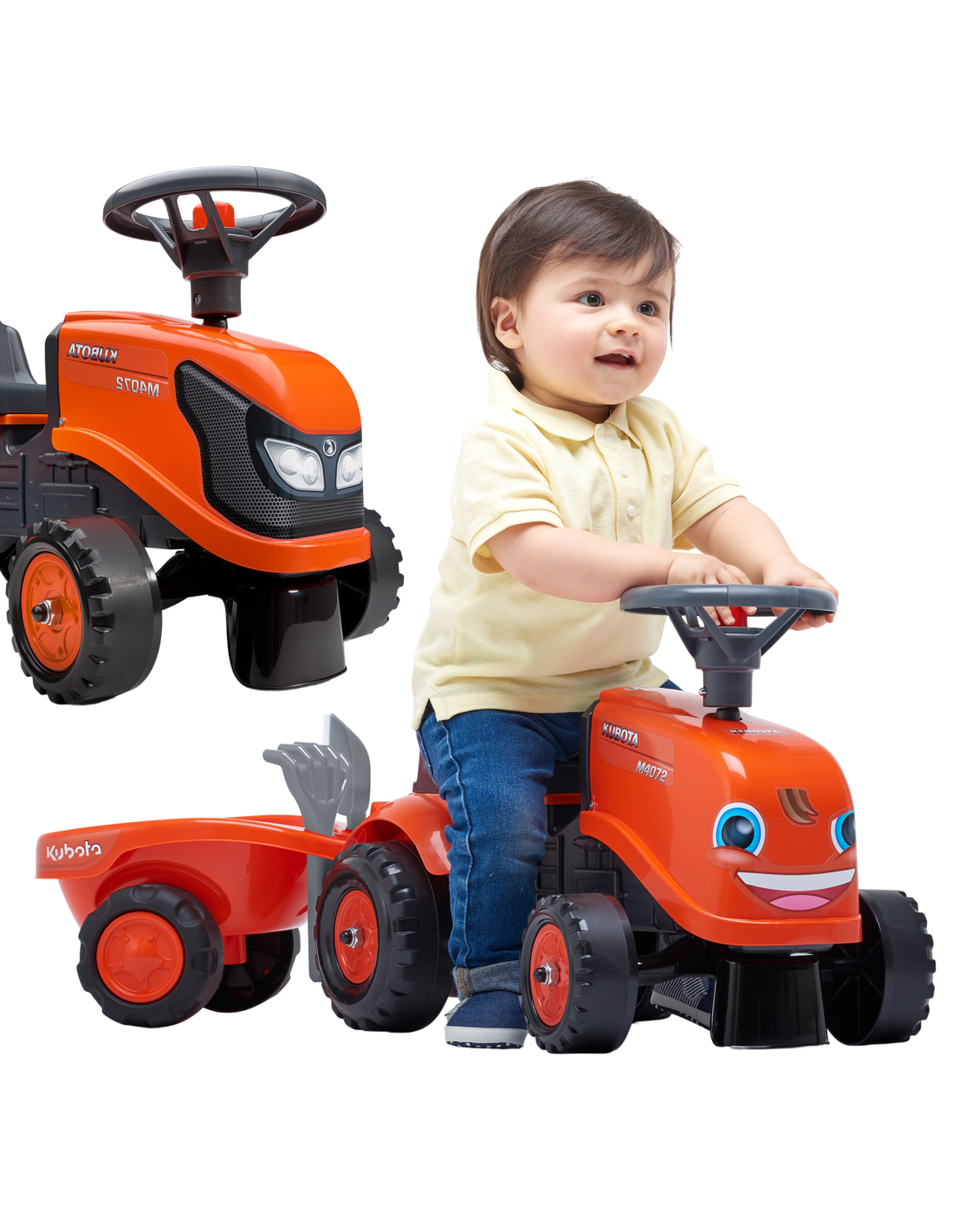 The Kubota Ride-on Tractor with Trailer by Falk is a dream come true for many a little tractor driver. Meticulously crafted with attention to the smallest detail ! No true farmer would turn down such a ride-on tractor. Made of the highest quality plastic, it's suitable for children aged 12 months and up. It features a detachable trailer with panels and a steering wheel with a horn . The tractor's wheels are made of high-quality plastic . Additionally, the tractor comes with a rake and a shovel for your child to play with. The included stickers allow your child to choose their own unique style. A smiley face or a standard sticker? Surprise everyone by applying it to the front of the vehicle.