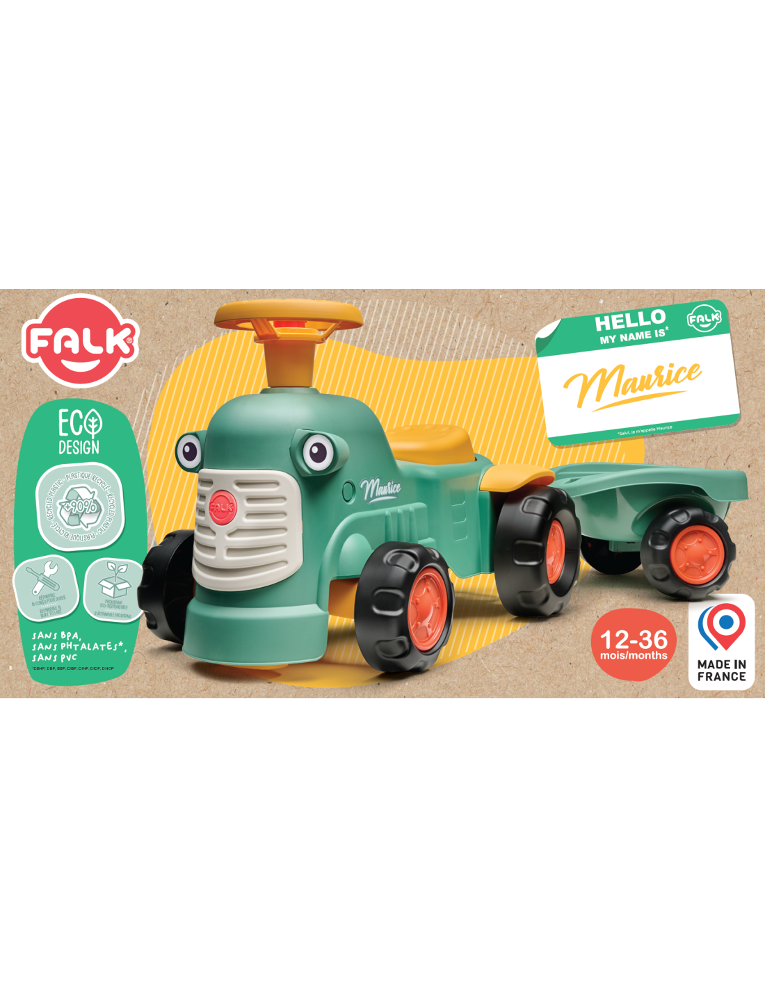 The Maurice Ride-On Tractor in a vintage color scheme from FALK is a charming and clever vehicle for little ones. It's 100% made in France , and to protect our planet, it's made from 90% recycled plastic. The tractor features a working steering wheel with a horn and a small key that makes sounds, providing children with additional sensory stimulation. The included practical trailer makes the vehicle the perfect companion for active play in the garden or sandbox.
