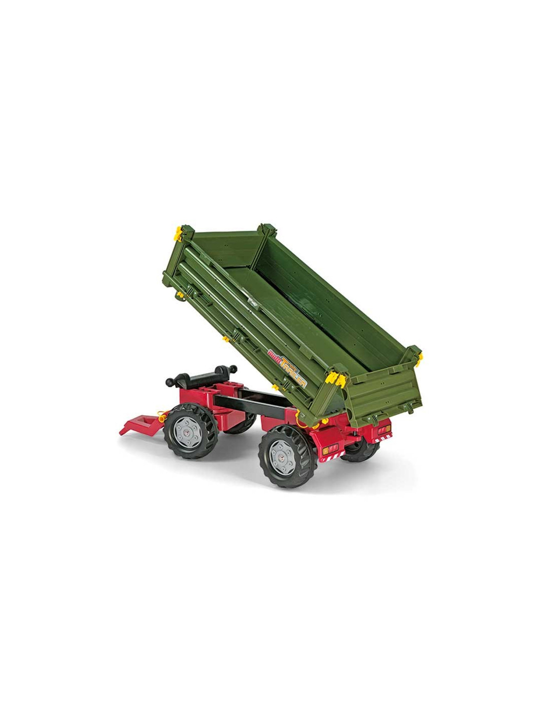 The Rolly Toys Green Mega Trailer has a three-sided dump trailer. It's stable thanks to its dual wheel axles. It fits any Rolly Toys vehicle equipped with a trailer tow bar.