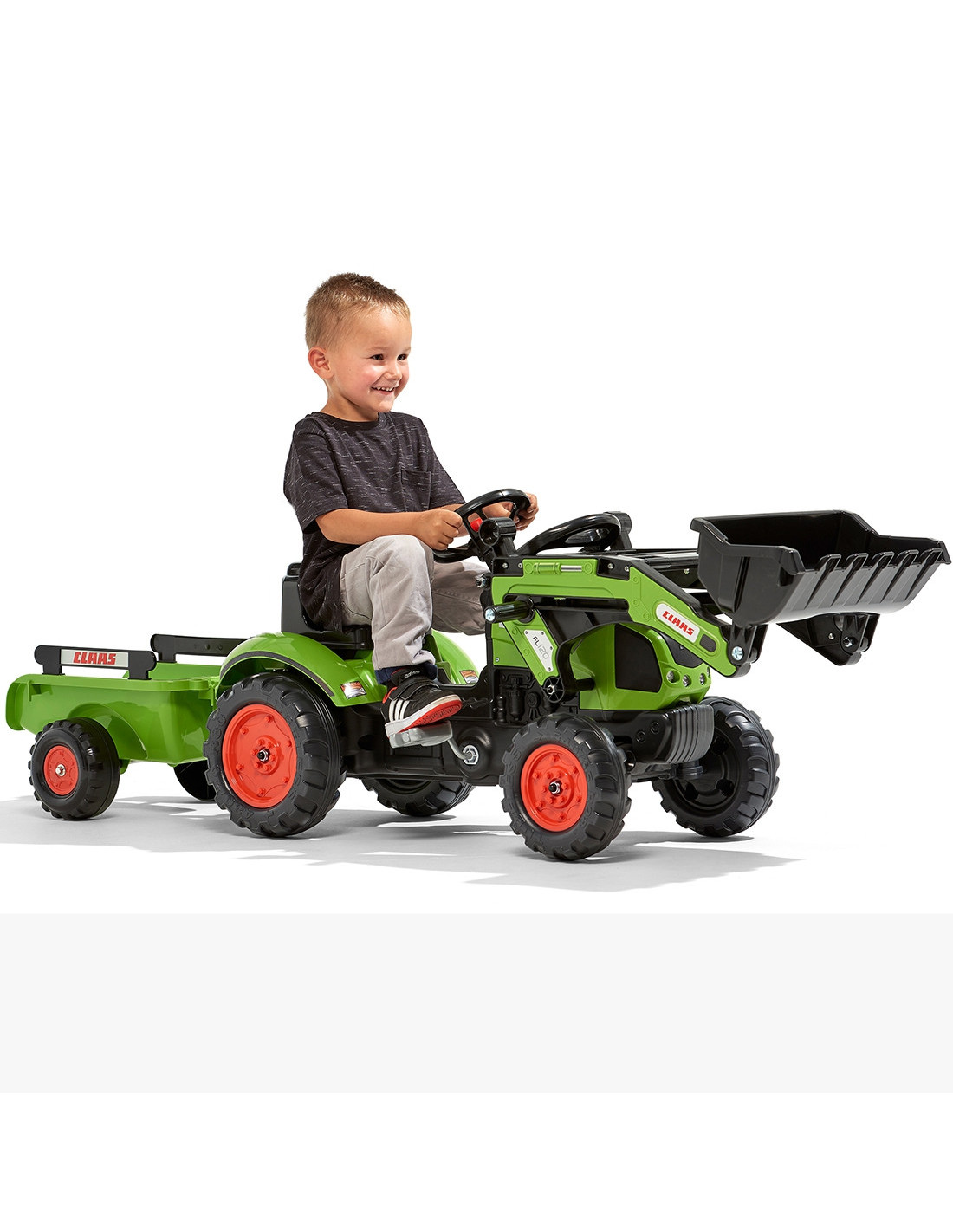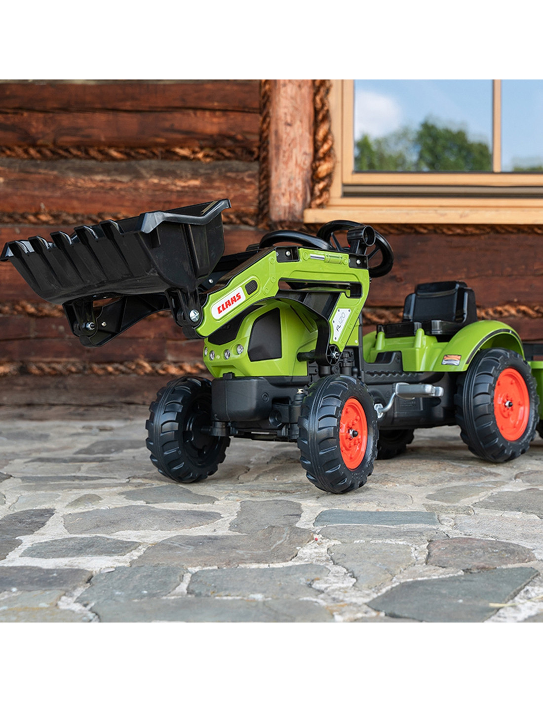 The CLAAS pedal tractor with trailer and front bucket from FALK is a dream come true for many a young tractor driver. Meticulously crafted , with attention to the smallest detail ! No farmer would shy away from one. Crafted from the highest quality plastic, this toy is suitable for children aged 2 and up . The set is 162 cm long . It comes equipped with a front bucket, a detachable trailer with panels, and a steering wheel with a horn . The tractor's wheels are made of high-quality plastic.