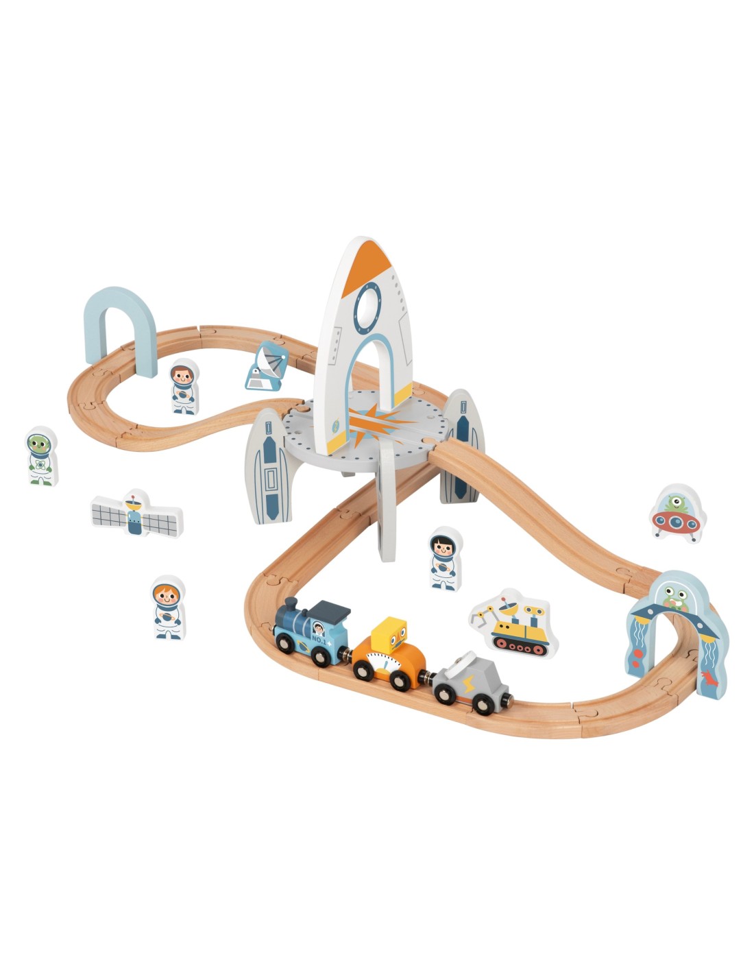 - - the set includes wooden folding tracks, a train with two carriages, astronaut figures, space accessories including a satellite, a rover and a flying saucer, as well as a rocket and an arch with the image of an alien,