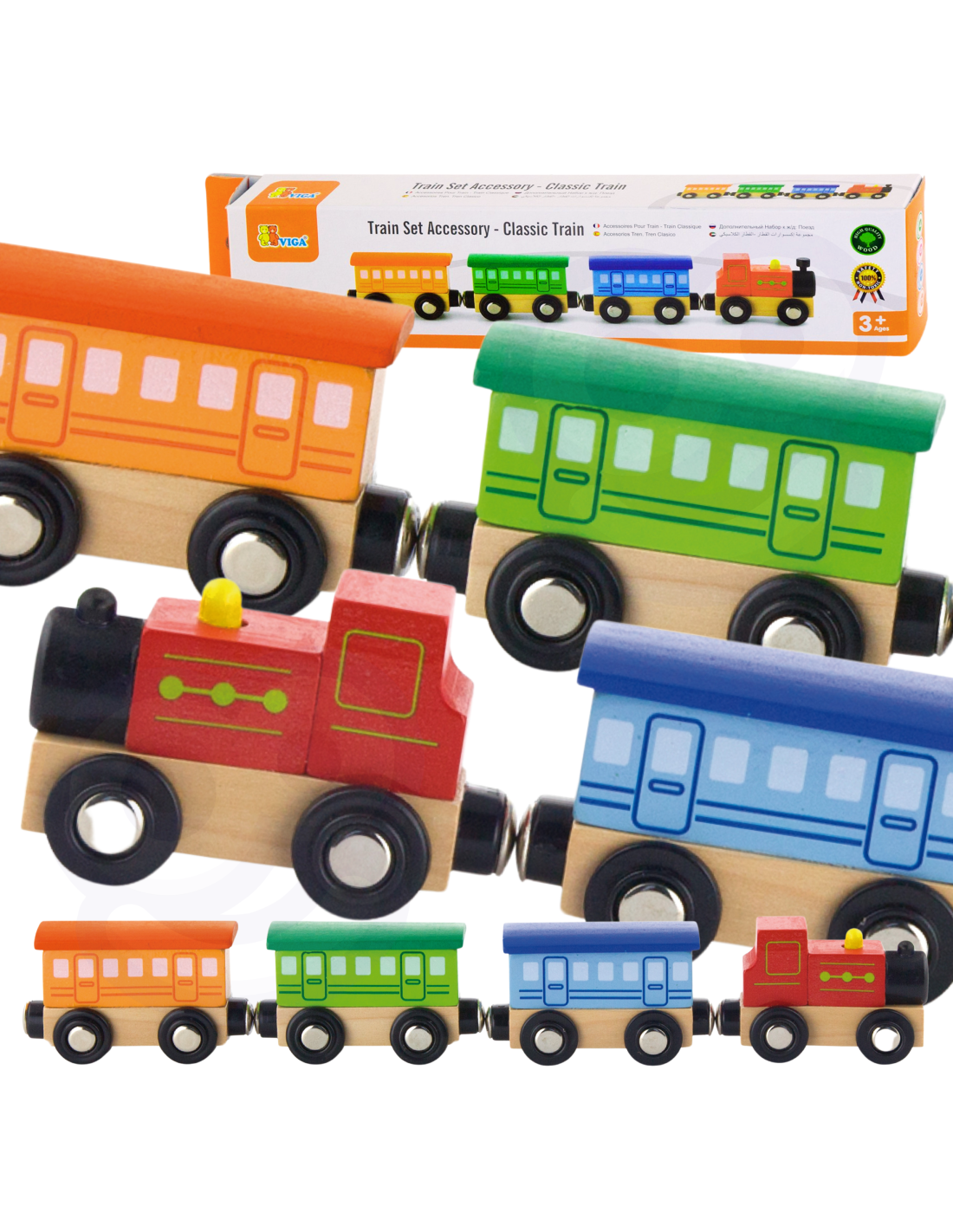 This set from Viga consists of four pieces connected by magnets to form a train. It can be used as a standalone toy or as a complement to a train, other sets, or building blocks.