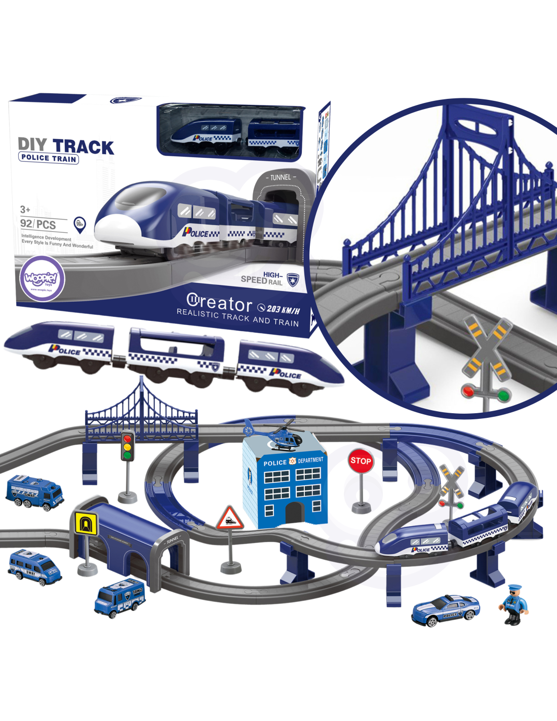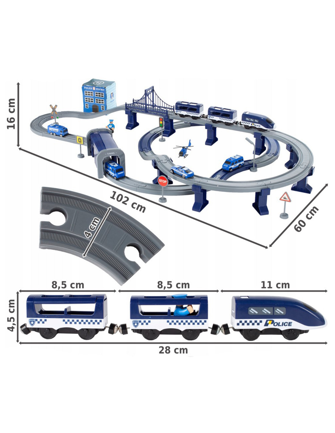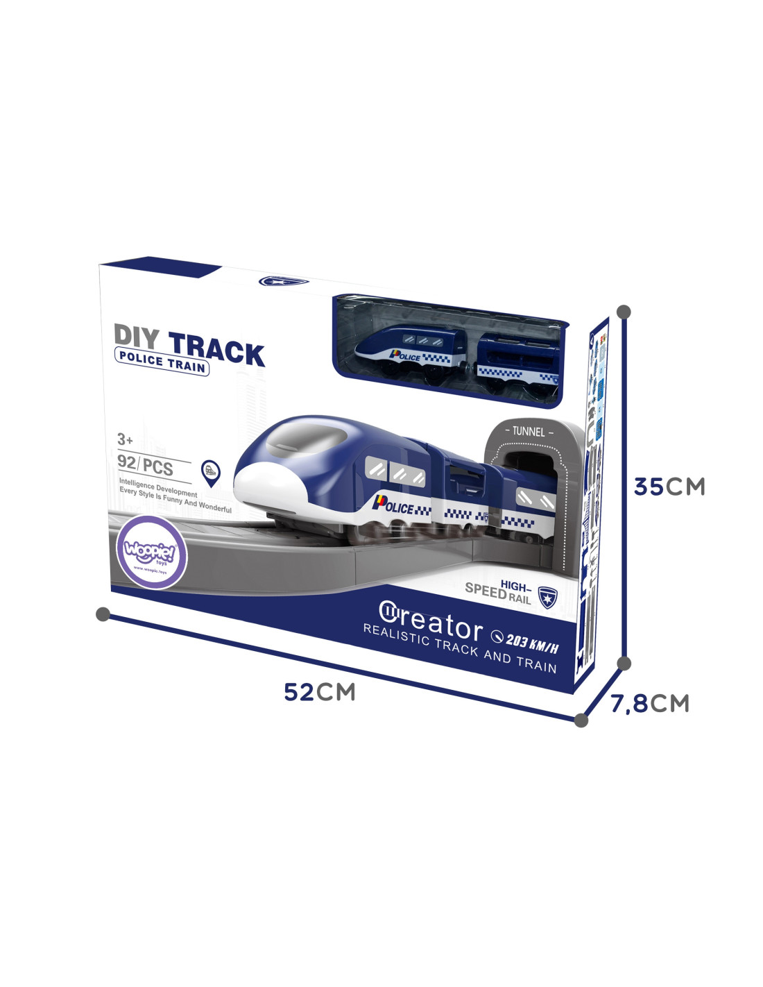 The Police Station Electric Train from the renowned Woopie brand is the perfect choice for your little automotive enthusiasts. This colorful train will delight children of all ages, providing numerous attractions and endless excitement. The set contains 92 pieces , including a modern battery-powered locomotive, track elements, police cars , and a helicopter. This toy offers not only tons of fun but also vast developmental opportunities for children. It particularly develops spatial awareness, technical skills, and, of course, imagination. The train is packaged in a unique box, making it perfect for a gift.