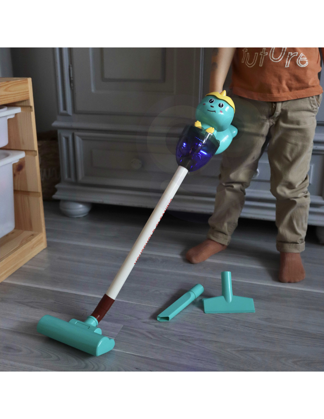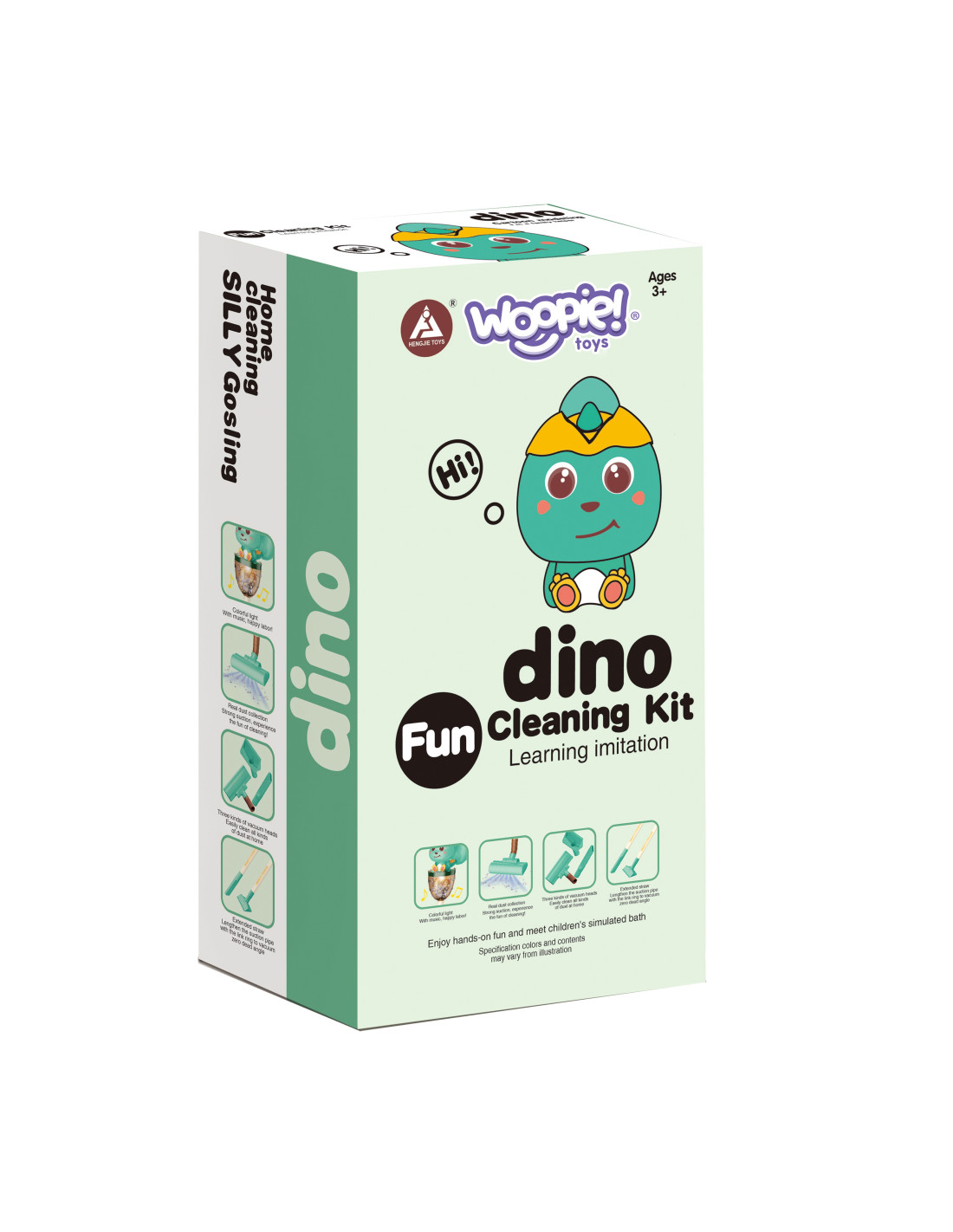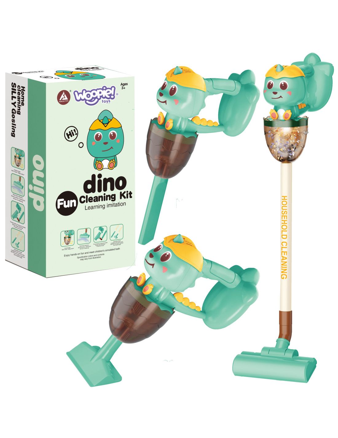 The Dino 3-in-1 vacuum cleaner from Woopie is the perfect choice for little home helpers. The suction function , sounds , and lights make cleaning even more realistic and engaging. The first click on the handle turns on the vacuum cleaner, the second activates a cheerful melody, and the third turns it off. The removable plastic waste container is easy to empty. The Dino Vacuum Cleaner has three brushes , allowing children to use the vacuum cleaner independently in three modes. The toy is made of high-quality , child-safe materials . The vacuum cleaner has a convenient handle , allowing children to carry it from place to place. It makes an ideal gift to help children imitate their parents , because what child wouldn't want to be an adult?