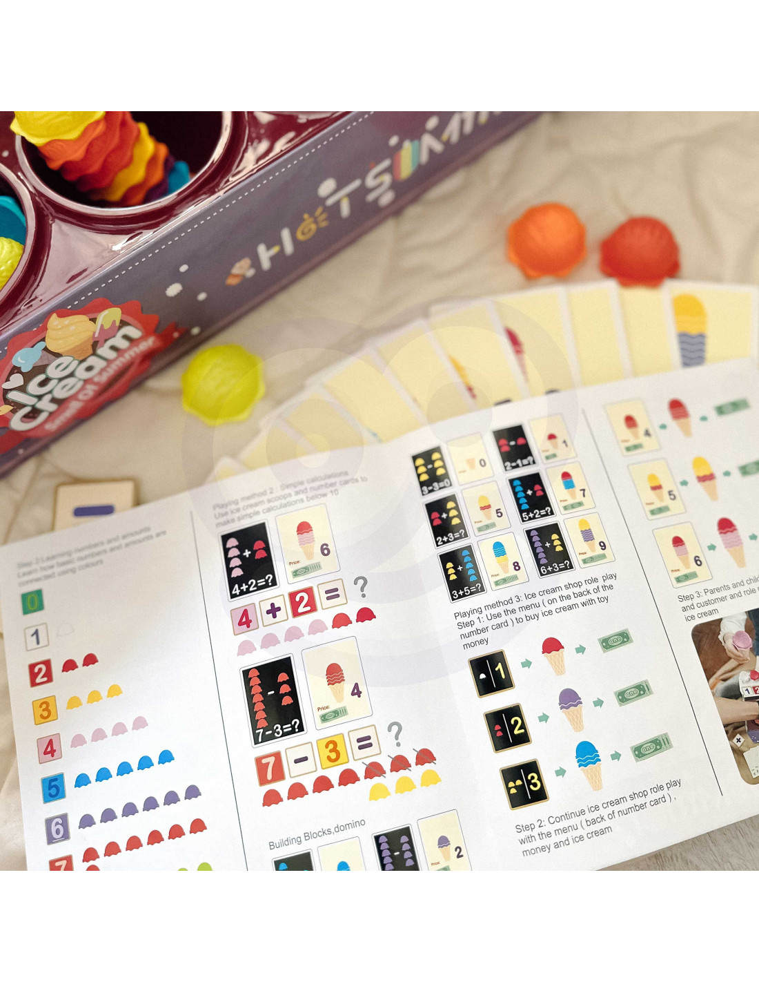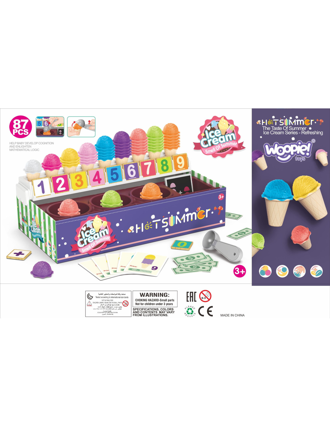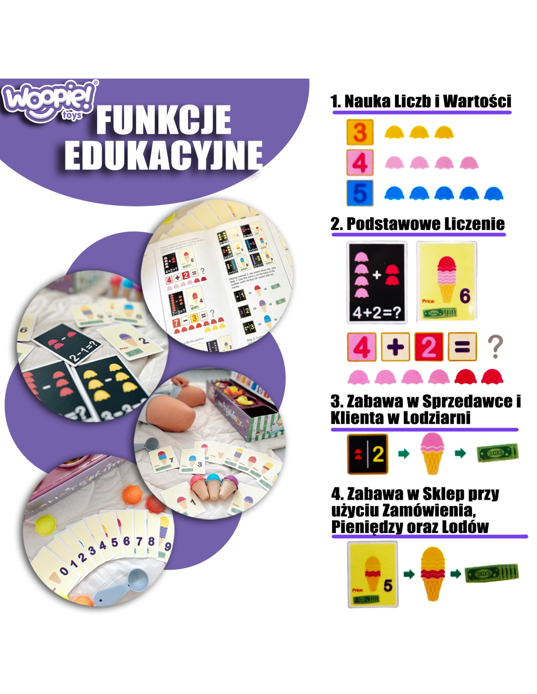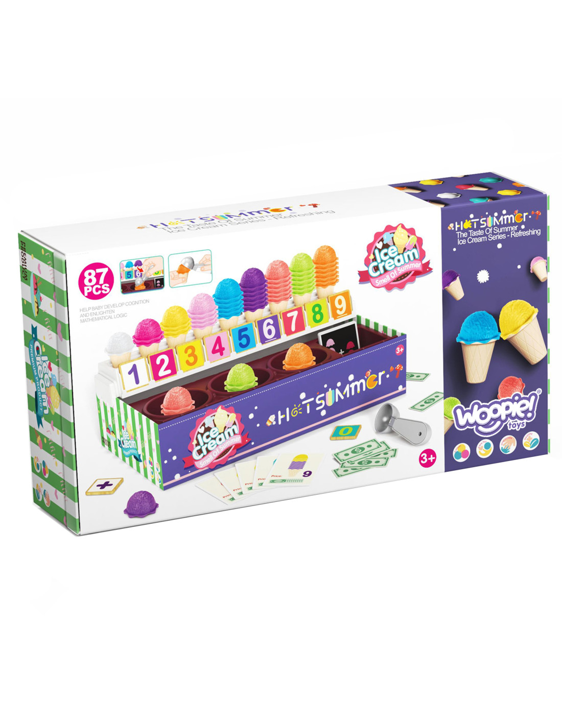 The Ice Cream Parlor set from WOOPIE not only lets you play as a little ice cream vendor, but also teaches counting, numbers, colors, and addition. The set includes 87 pieces , including ice cream scoops, wafers, order cards, money, number tokens, and an ice cream scoop. The number of ice cream scoops varies depending on the color, and the order cards include simple math problems . Through role-playing, children develop their communication skills , reduce stress in everyday situations, and provide an excellent lesson in empathy .