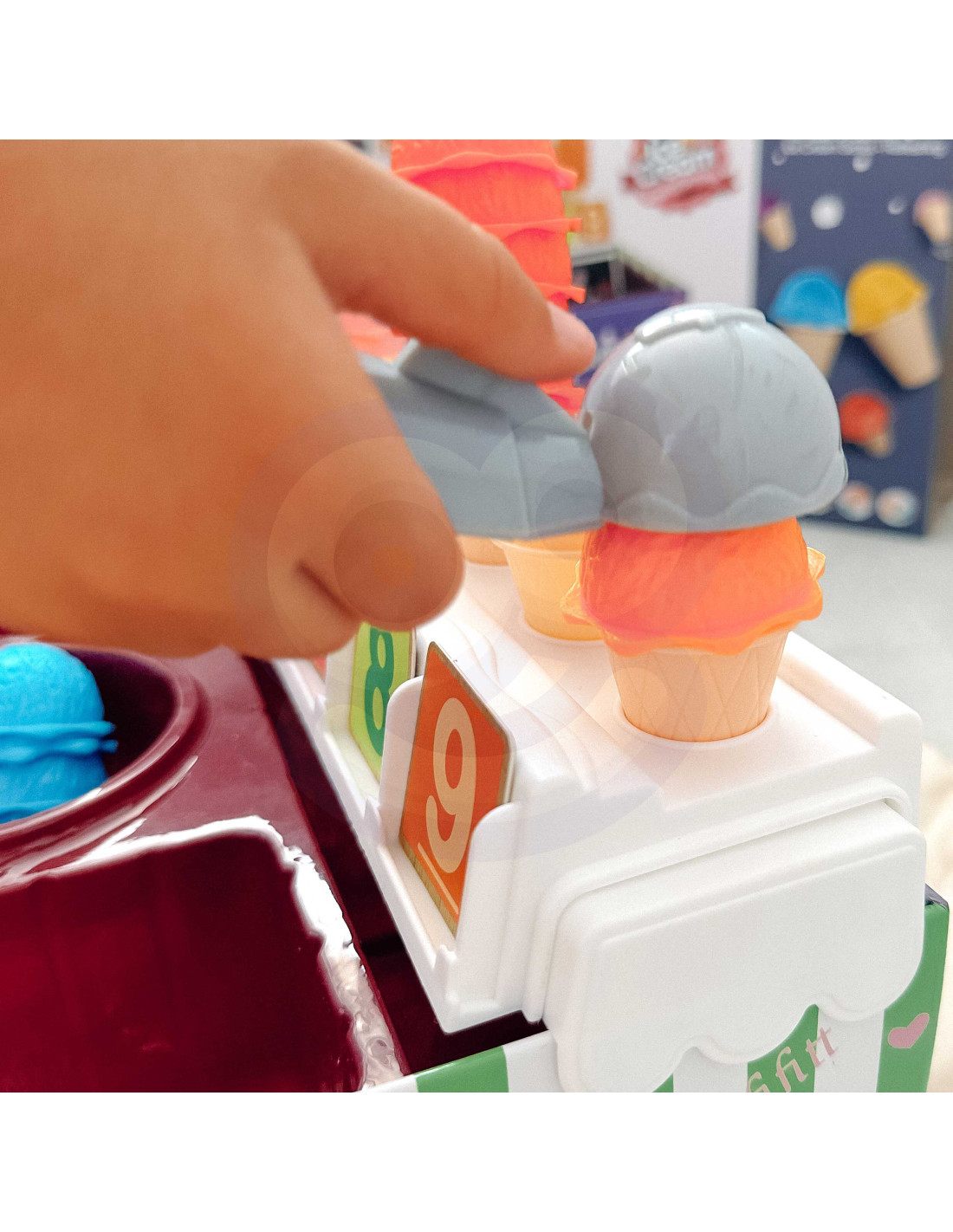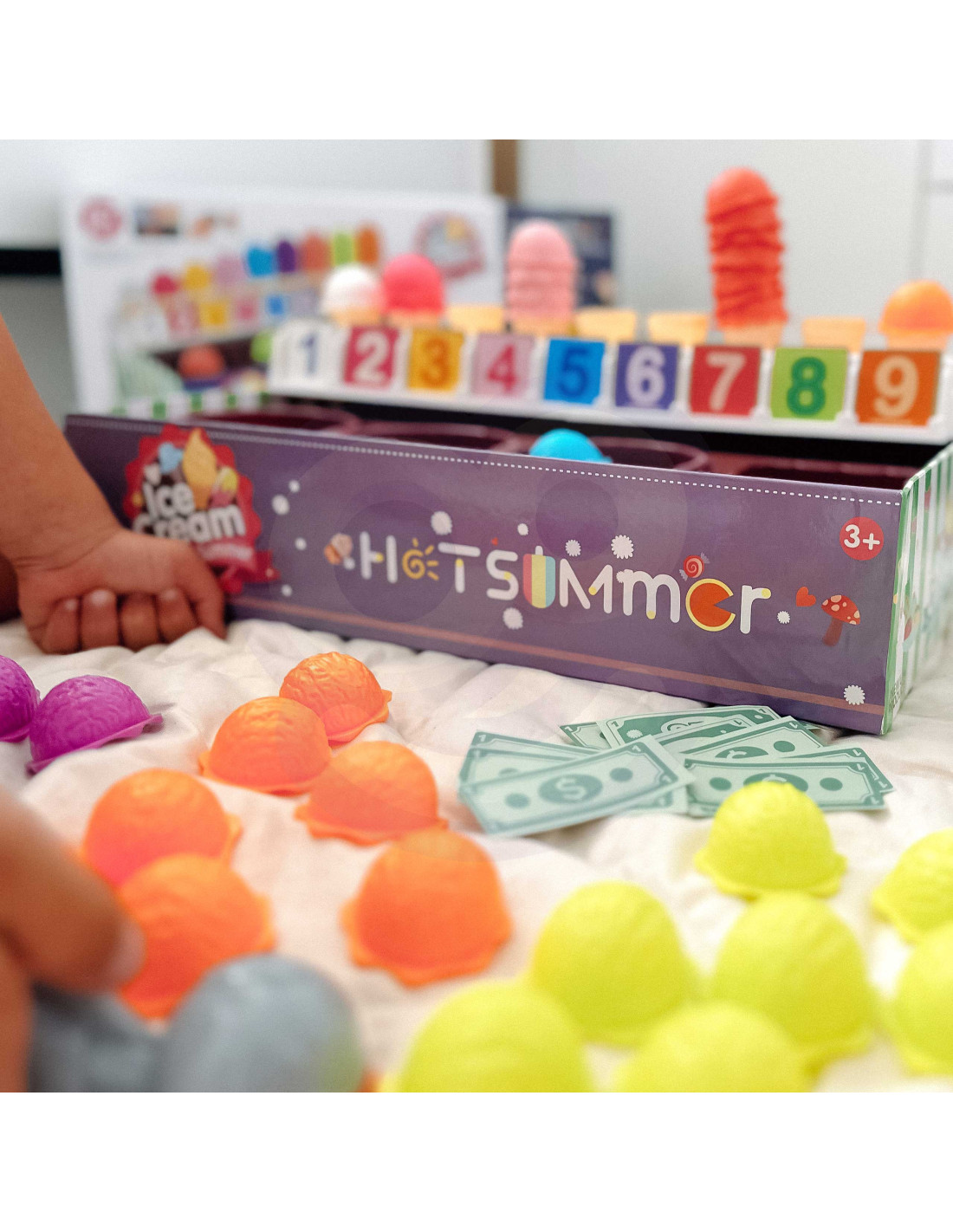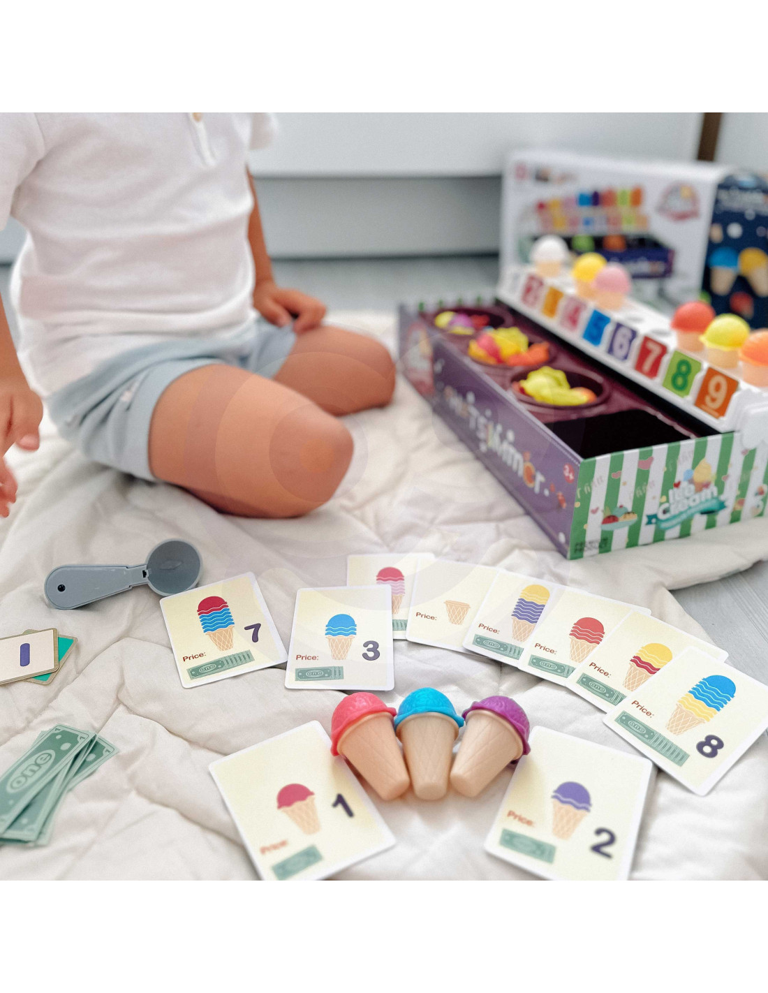 The Ice Cream Parlor set from WOOPIE not only lets you play as a little ice cream vendor, but also teaches counting, numbers, colors, and addition. The set includes 87 pieces , including ice cream scoops, wafers, order cards, money, number tokens, and an ice cream scoop. The number of ice cream scoops varies depending on the color, and the order cards include simple math problems . Through role-playing, children develop their communication skills , reduce stress in everyday situations, and provide an excellent lesson in empathy .