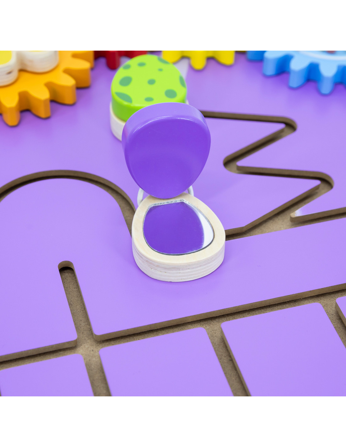 The colorful Triceratops Manipulative Board by Viga Toys is a wooden, multi-functional wall toy that will provide children with hours of fun and learning. Multiple children can play on the board simultaneously. It features activities such as gears, a motor loop with a bead launcher , a sliding maze with opening eggs , a xylophone , a gong , and rotating dinosaur eyes . It's a brilliant combination of toys for schools, preschools, learning centers, and public spaces.