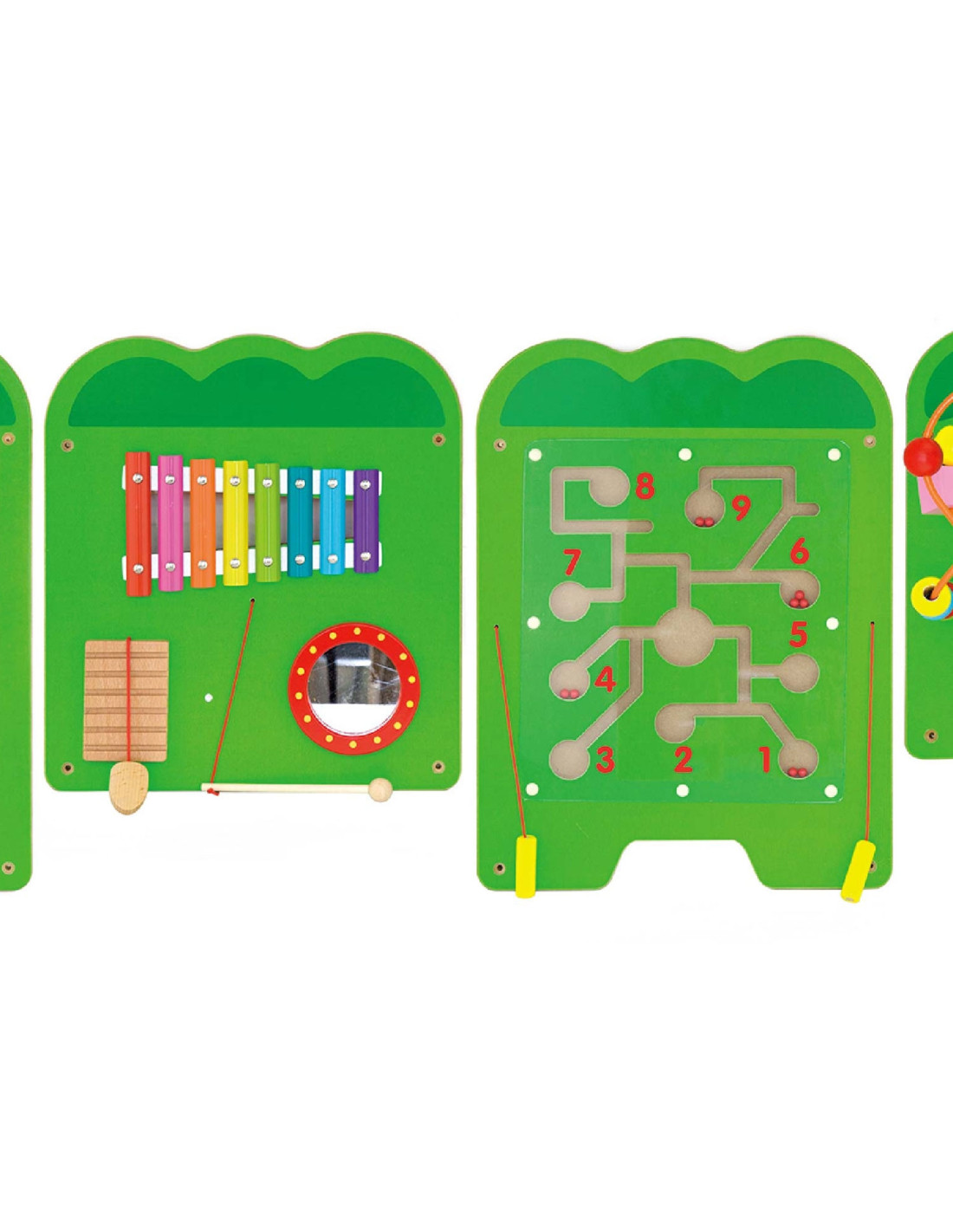 The third board features a music panel with colorful cymbals, perfect as a toddler's first instrument, and a notched board that also produces sounds when rubbed with a wooden stick. The third board also features a safety mirror.