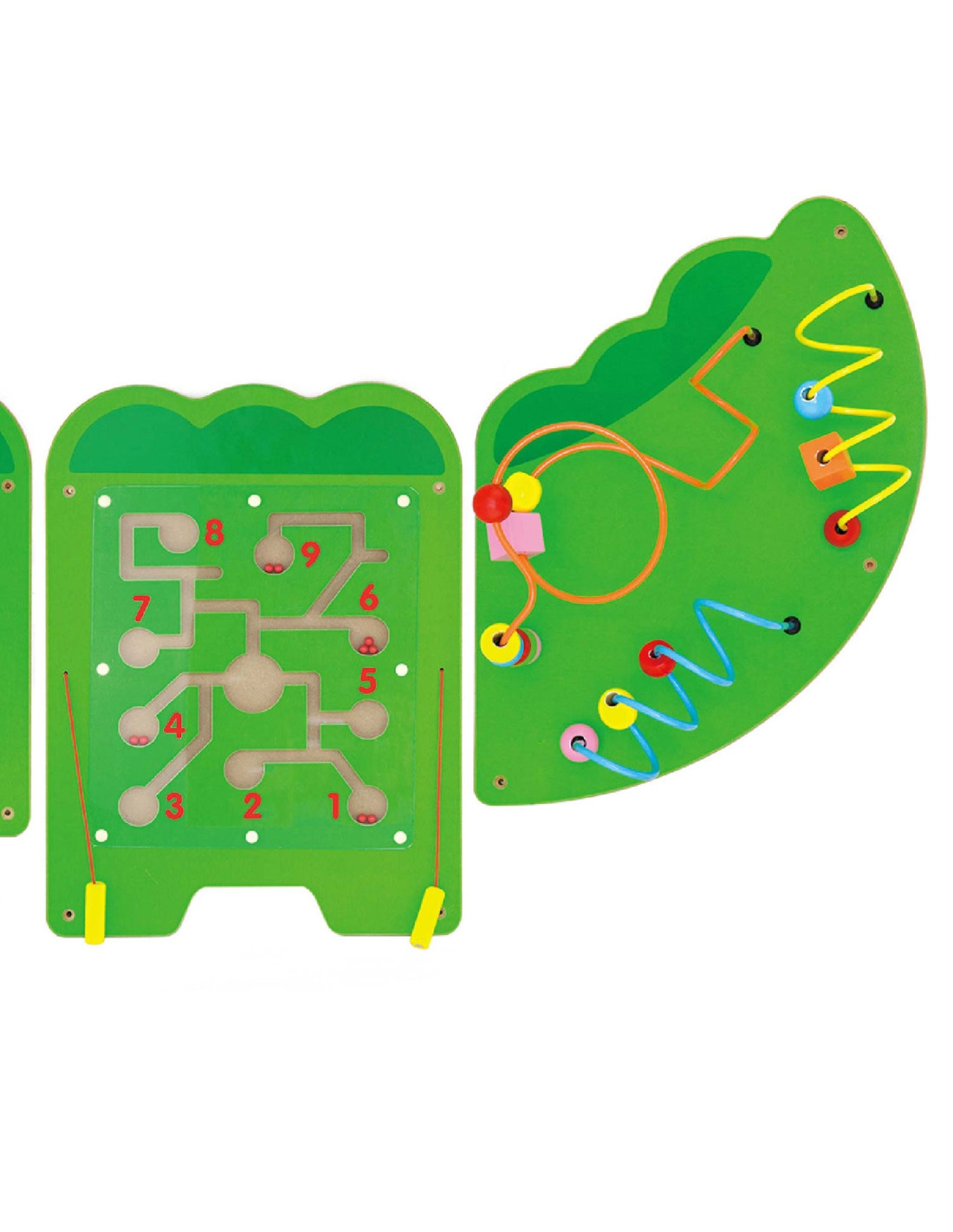 The final element is the tail, which features three different 3D mazes. The ability to manipulate the blocks and beads and guide them through the colorful metal rods will captivate every toddler, who will also be able to practice their hand movements here.