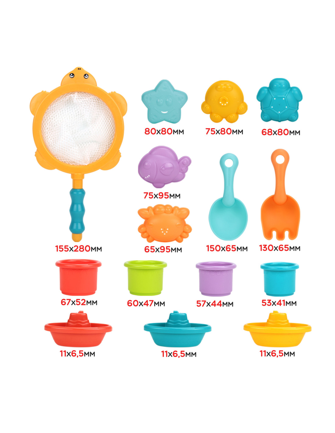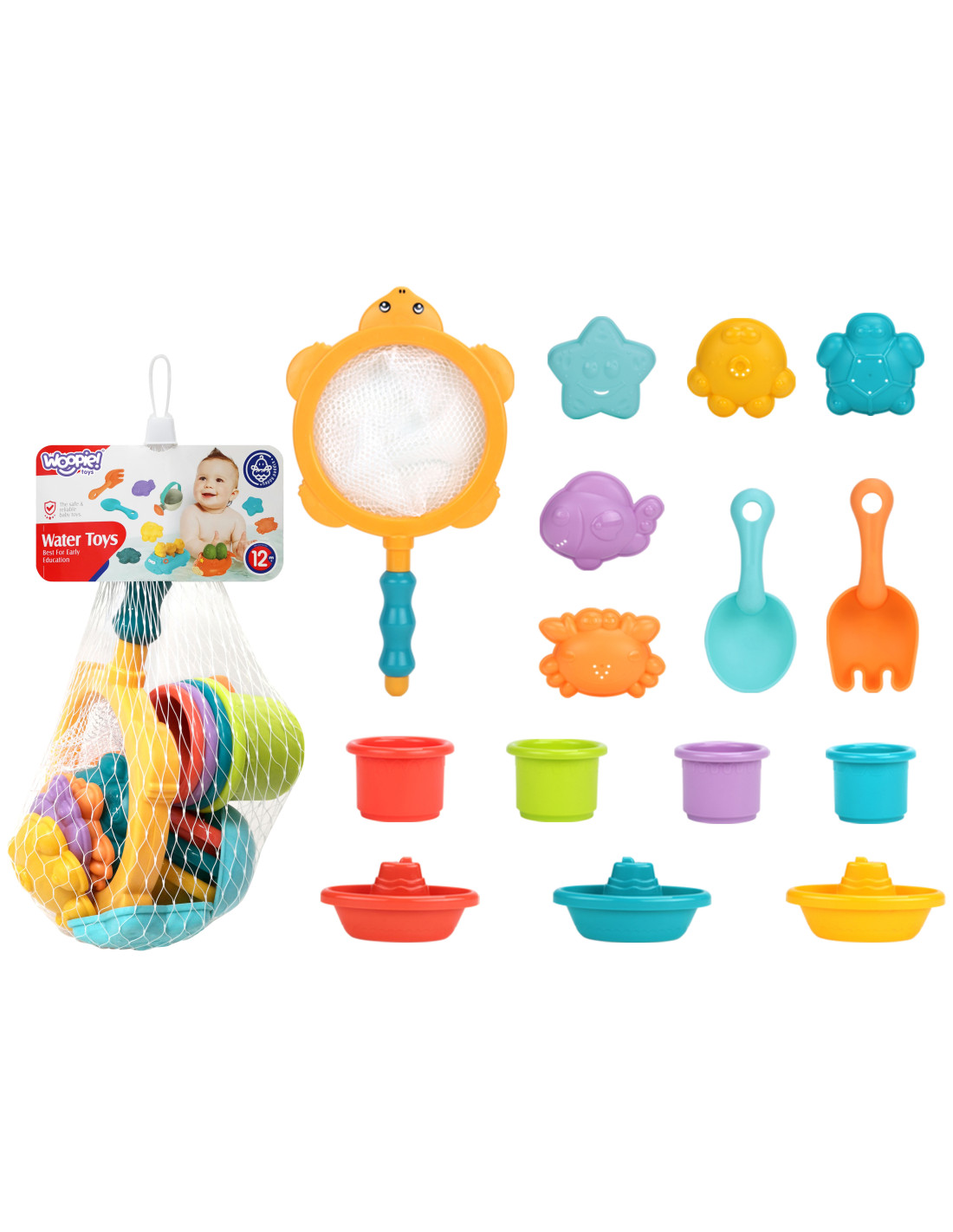 This water toy set from WOOPIE will be a great addition to your child's bath time. It can be used both for bath time and sand play . The set includes: a fishing net ; 3 boats ; 4 stackable cups ; 5 overflow molds/cups, depending on whether they're playing in the water or sand; and 2 shovels . Your child can conduct a variety of experiments while bathing! This set will not only make bath time or sand play more enjoyable, but will also develop their manual skills and awareness of the world around them . Above all, it will allow them to concentrate and engage in something else while washing.