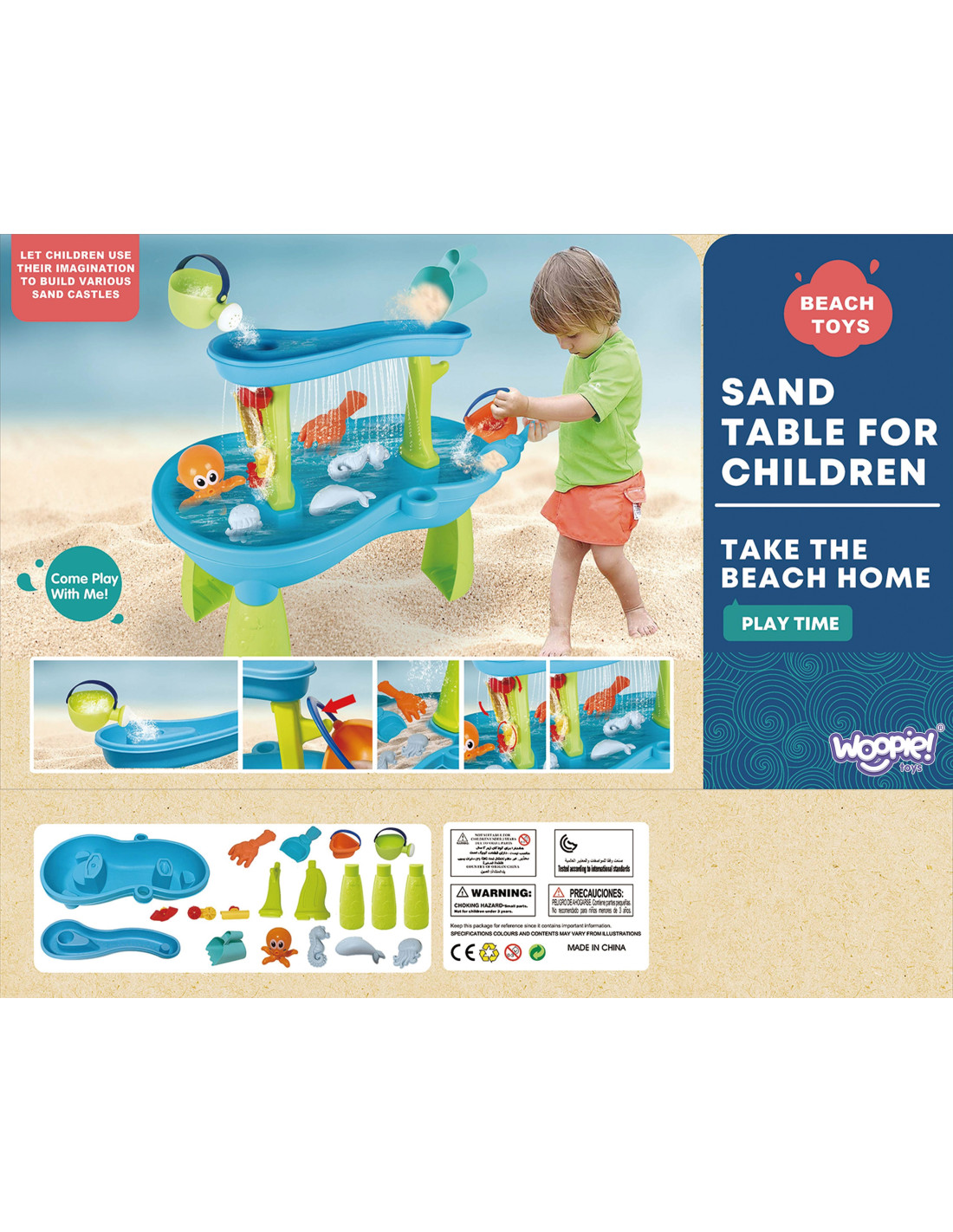 The Octopus Water Table from WOOPIE is the perfect toy for playing with water and sand . The set includes 18 accessories: 3 molds, an octopus, a watering can, a basket, a sand scoop, and 2 shovels. Children can pour water into the top of the table, causing the water to escape through the holes in the bottom or trickle down the water mills. This set is designed for both indoor and outdoor play. Perfect for playing at home, the beach, or in a sandbox.