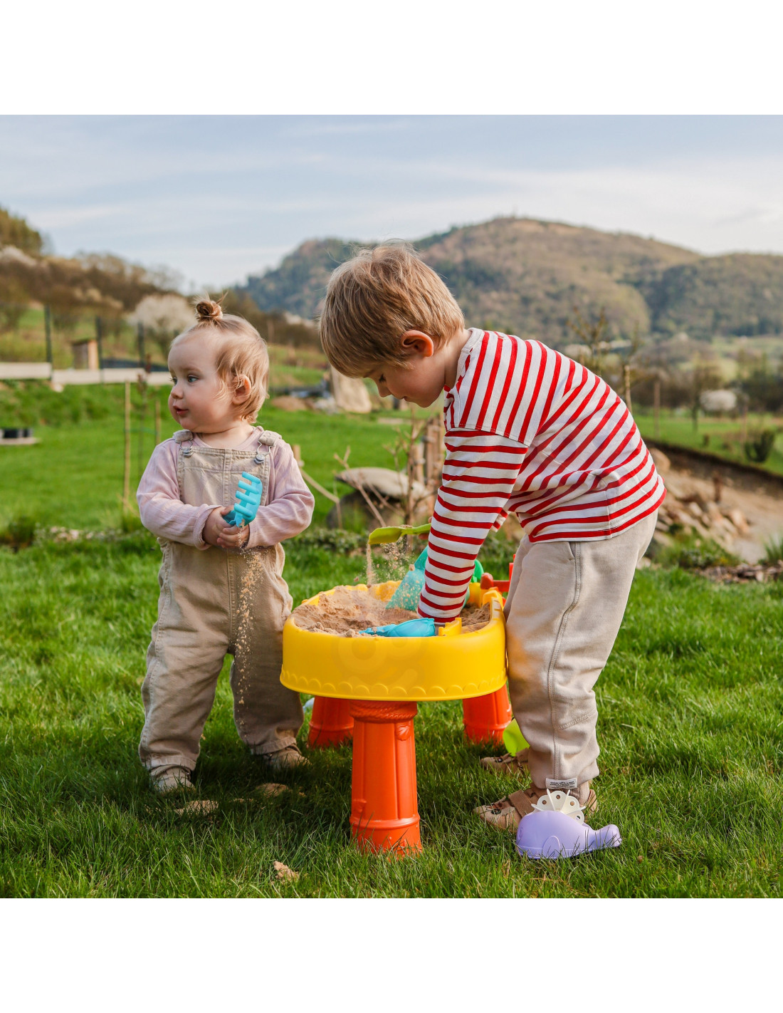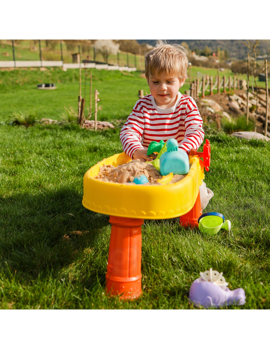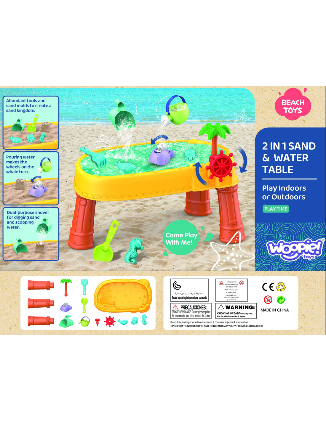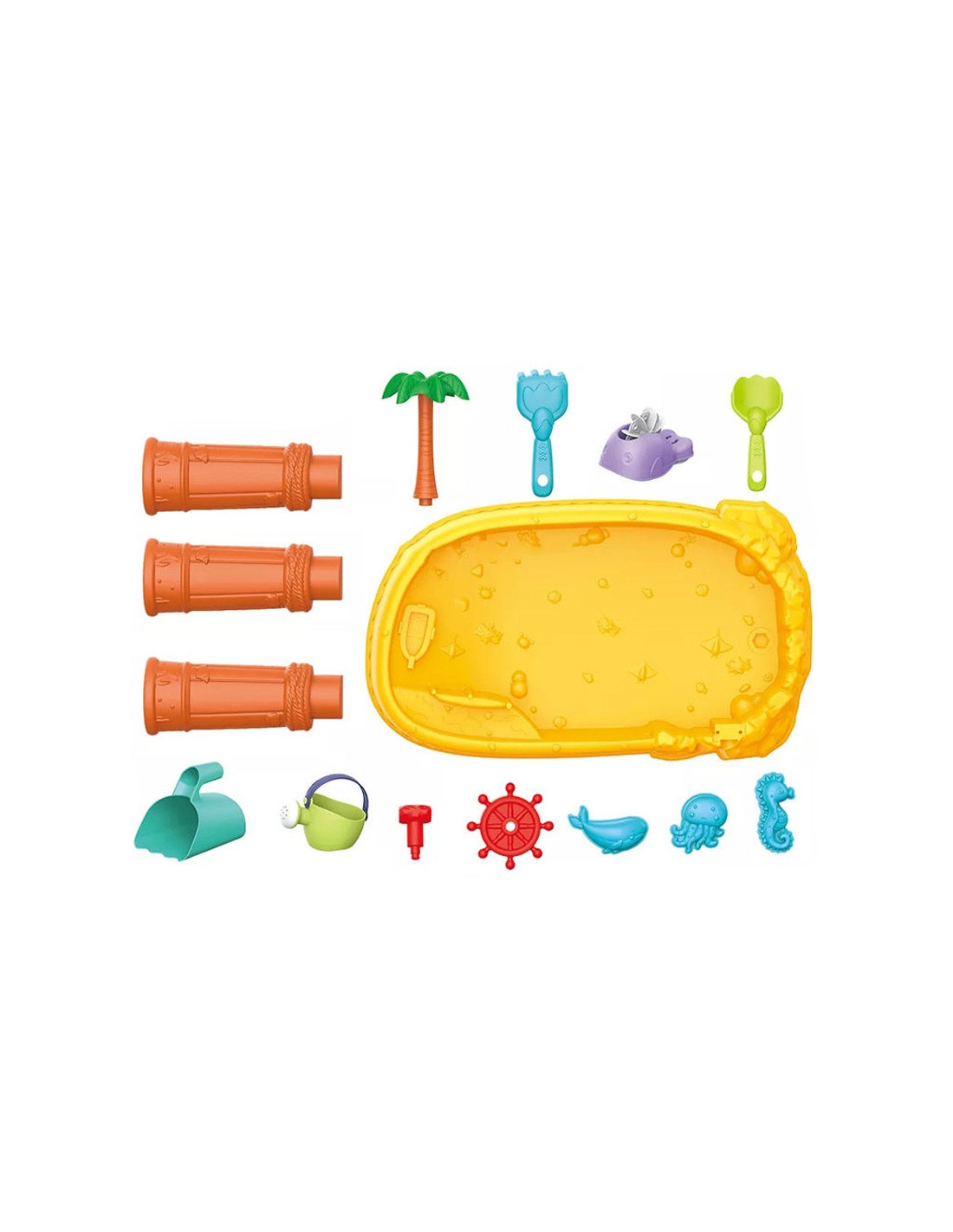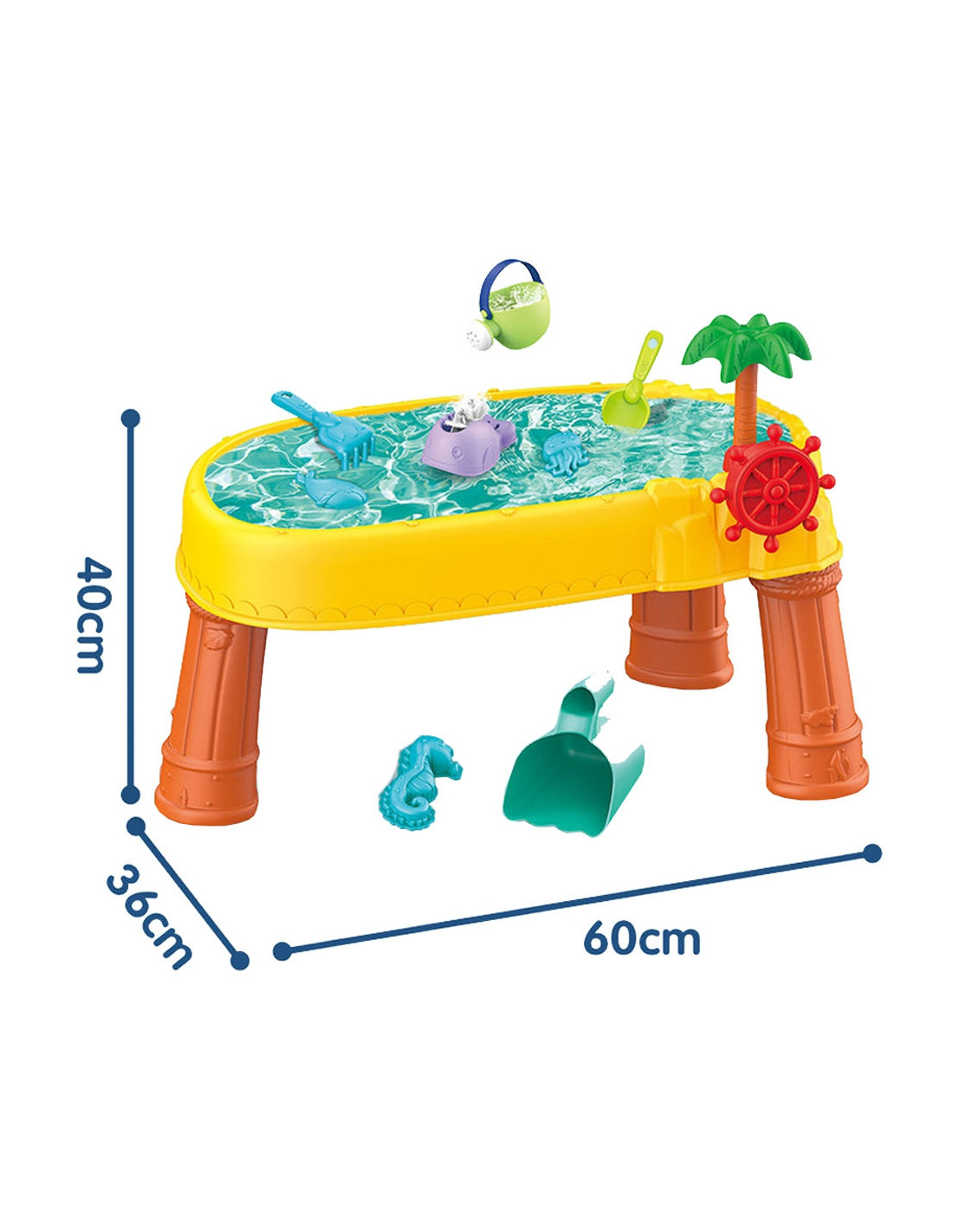 The WOOPIE Sand Table is the perfect toy for playing with water and sand . The set includes 8 accessories : 3 molds, a fish, a watering can, a container with a handle, a rake, and a shovel. The table features a steering wheel that you can spin to feel like a real pirate. The set is designed for both indoor and outdoor play . Perfect for playing at home, on the beach, or in a sandbox.