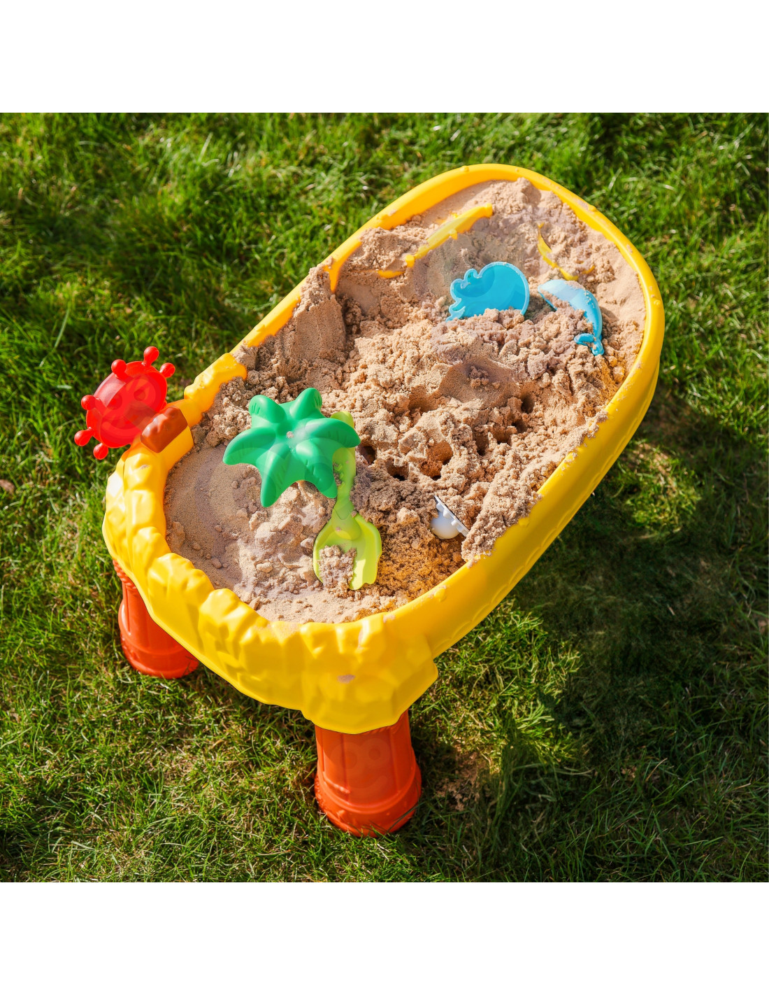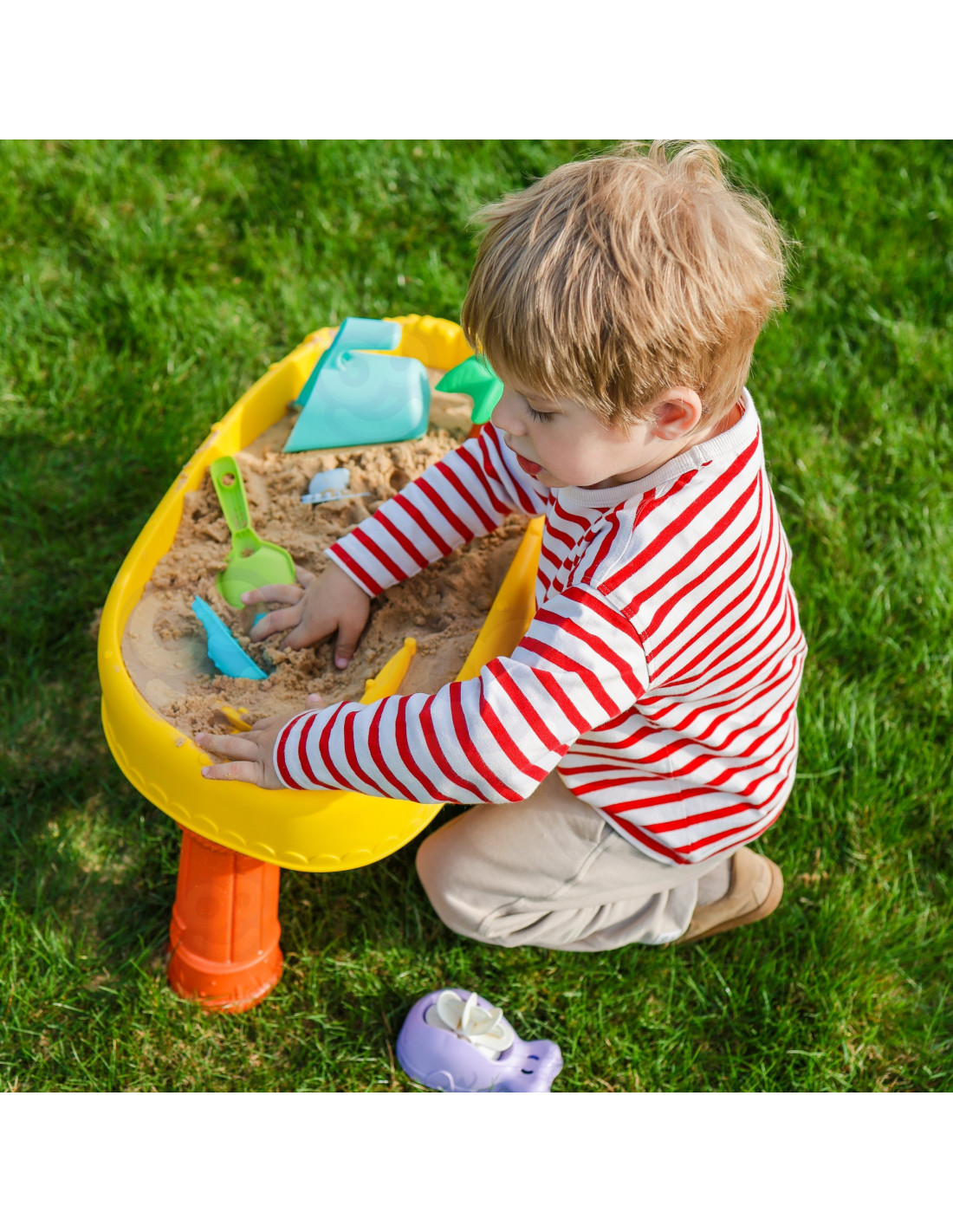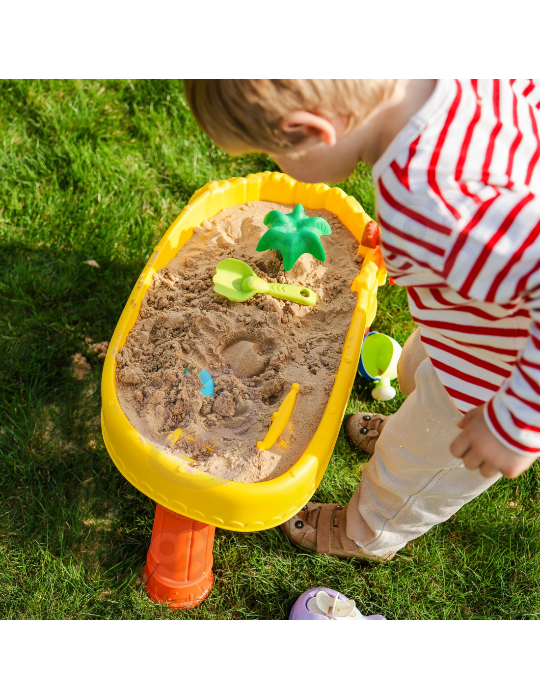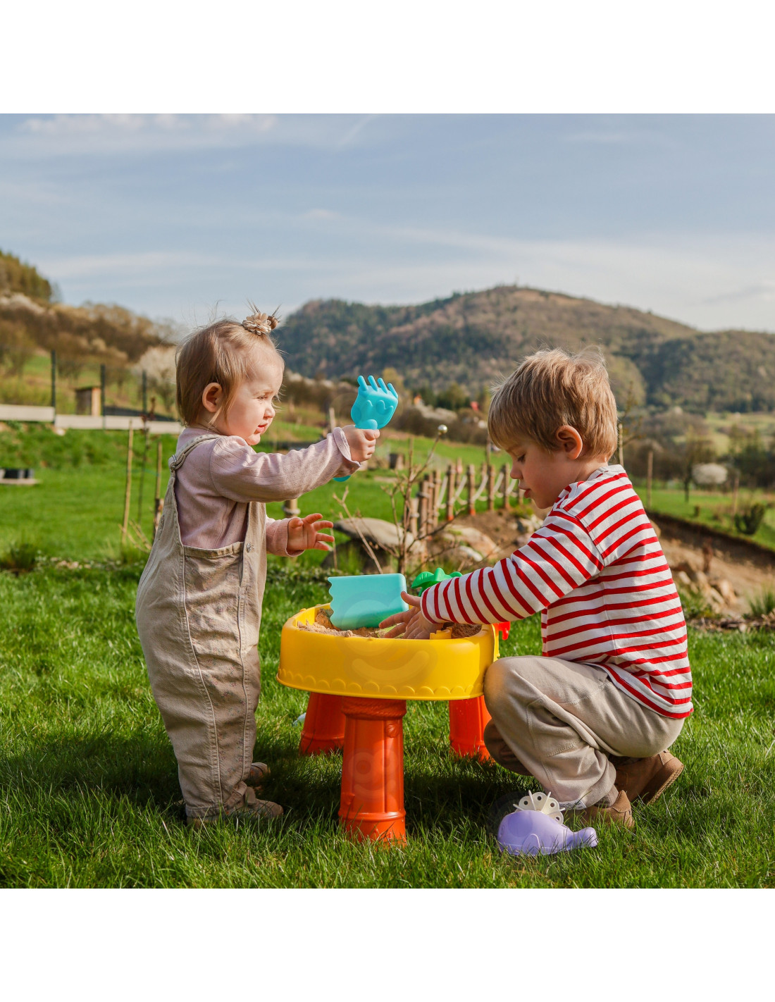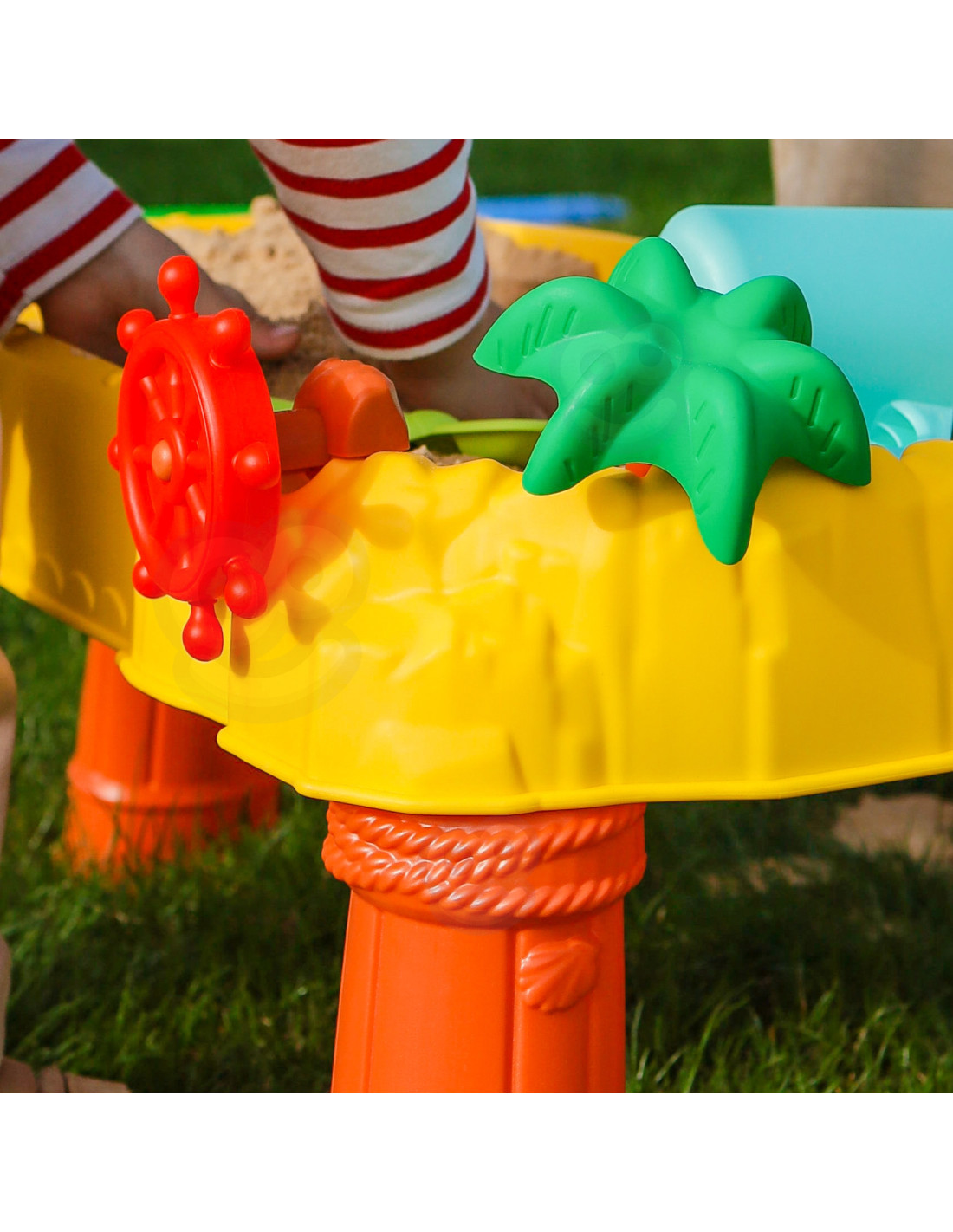 The WOOPIE Sand Table is the perfect toy for playing with water and sand . The set includes 8 accessories : 3 molds, a fish, a watering can, a container with a handle, a rake, and a shovel. The table features a steering wheel that you can spin to feel like a real pirate. The set is designed for both indoor and outdoor play . Perfect for playing at home, on the beach, or in a sandbox.