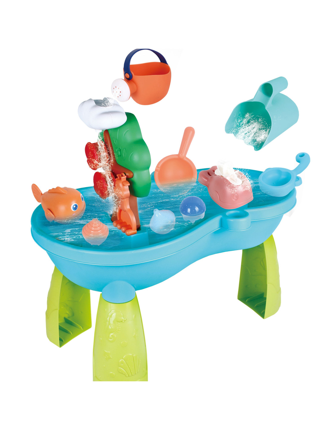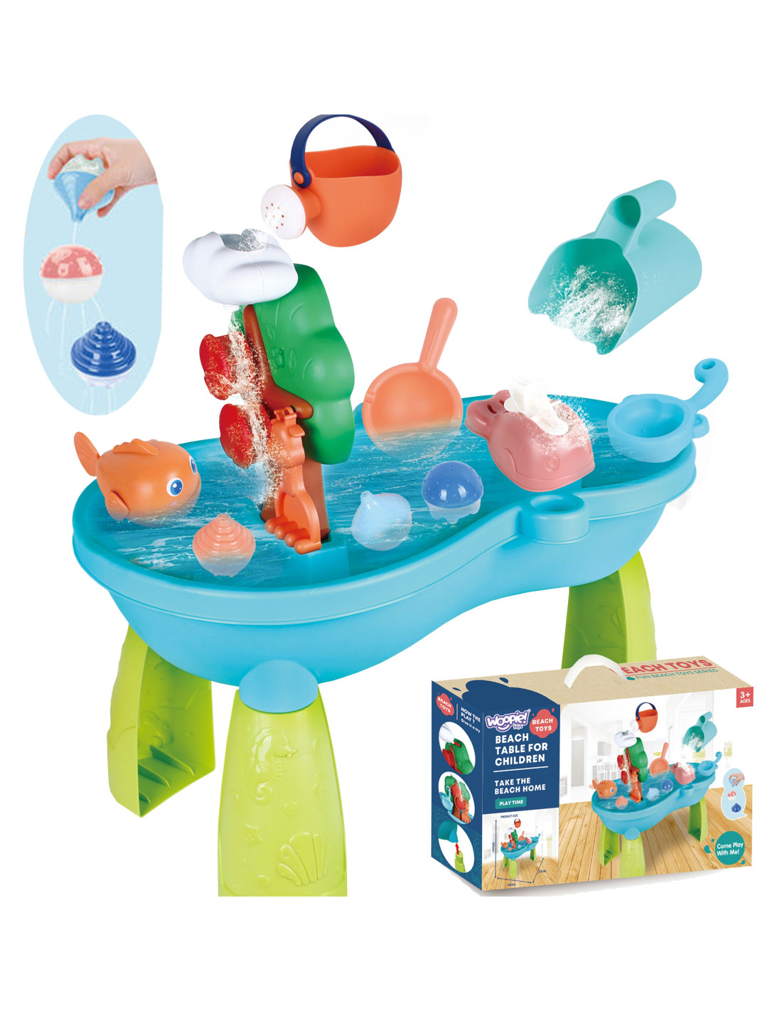 The 2-in-1 Water Table Sandbox from WOOPIE is the perfect toy for playing with water and sand . The set includes accessories such as fish, a watering can, a bucket, floats, and more. The table features a spinning wheel that spins when water is poured onto it. The set is designed for both indoor and outdoor play.
