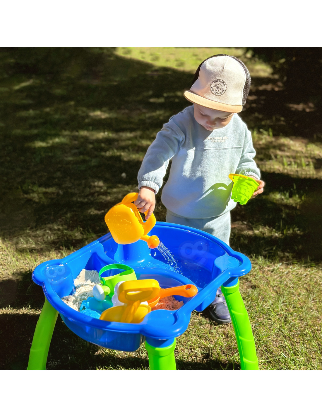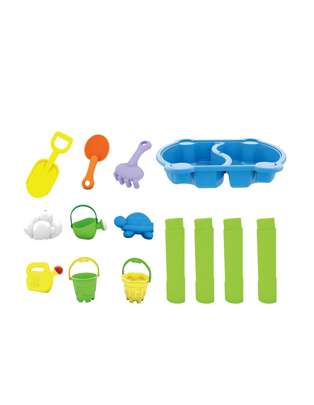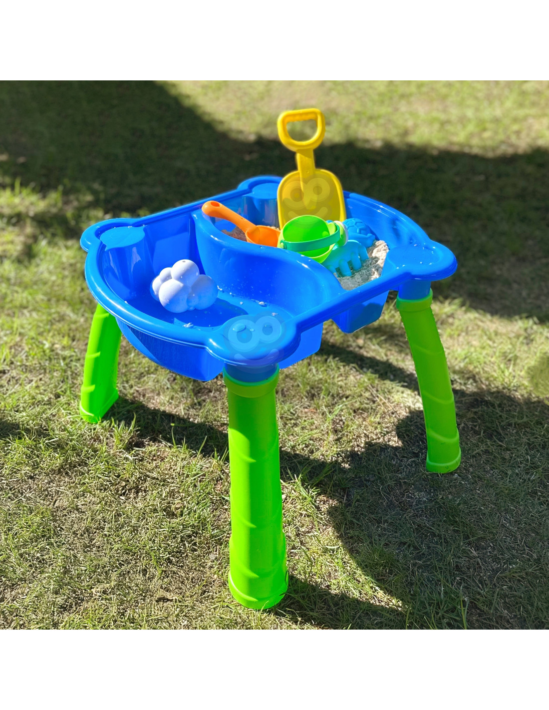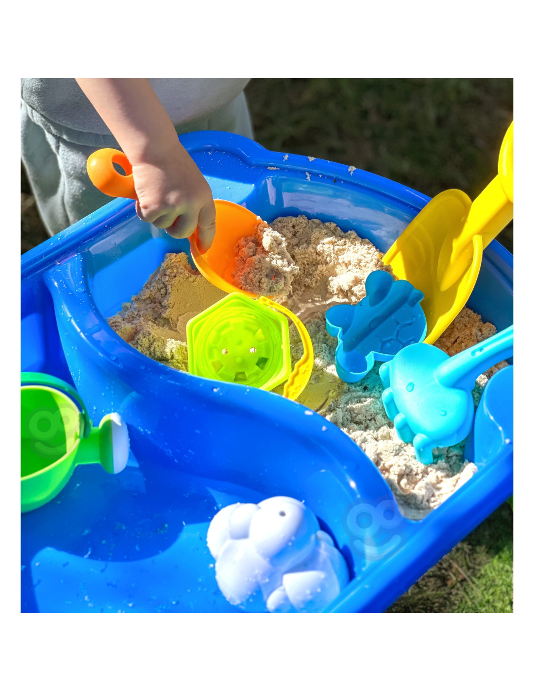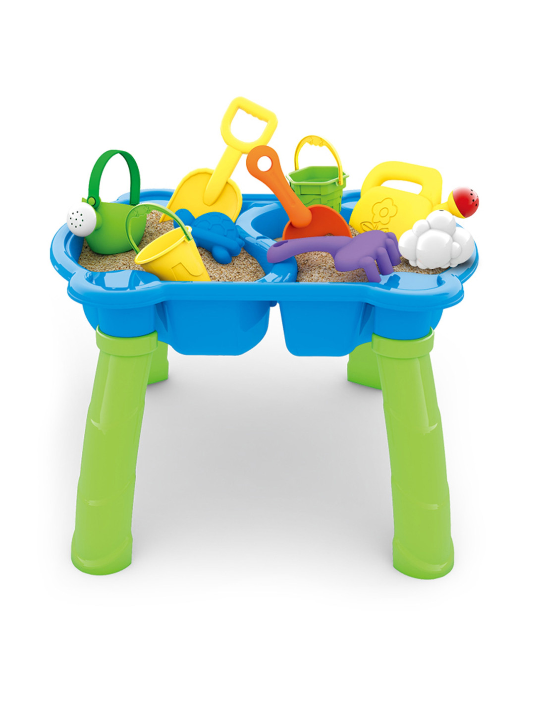 The WOOPIE Sand Table is the perfect toy for playing with water and sand . The set includes nine accessories : buckets, watering cans, a shovel, and more. The table is divided into two parts, one for pouring water and the other for sand. The set is designed for both indoor and outdoor play . Perfect for playing at home, on the beach, or in a sandbox.