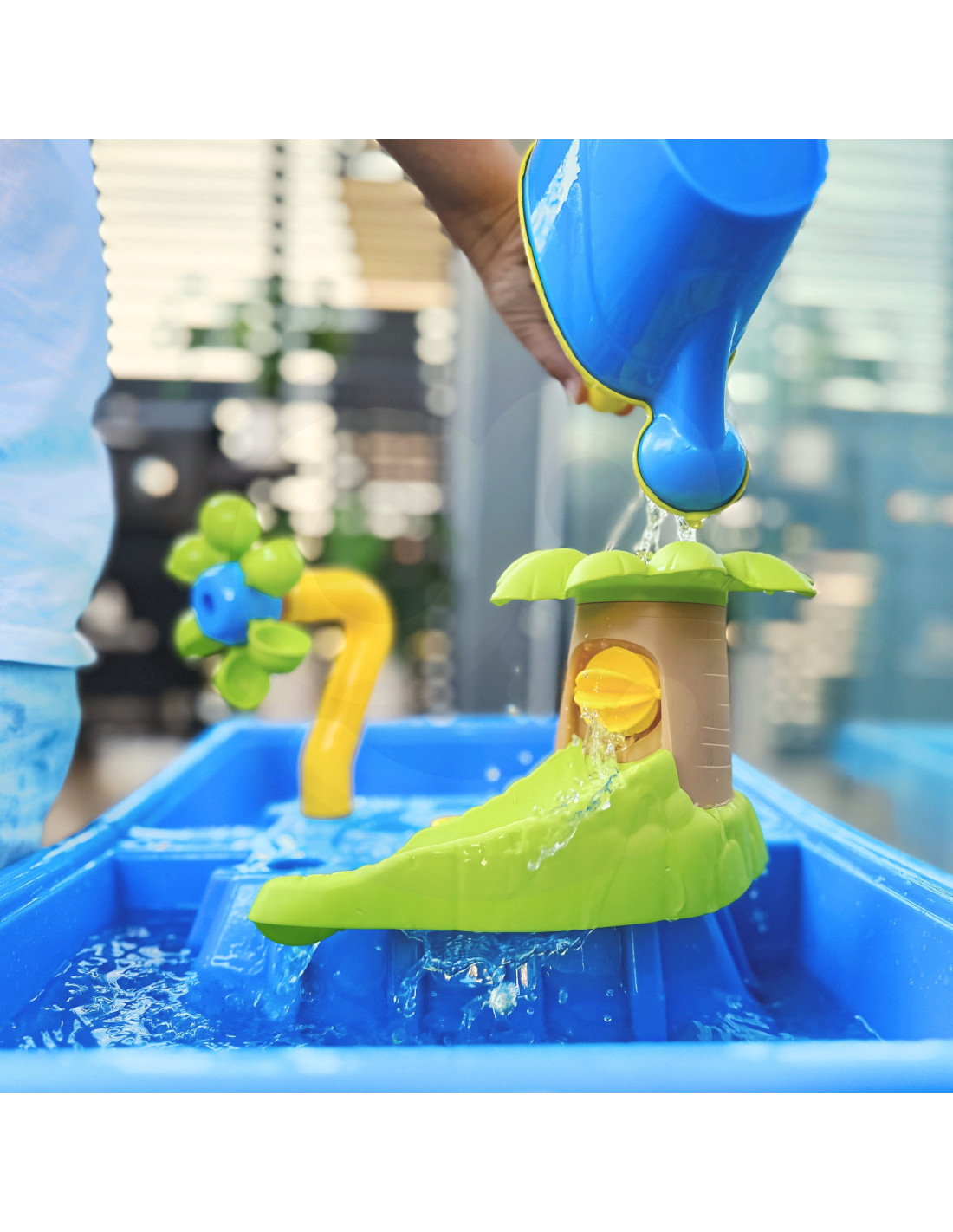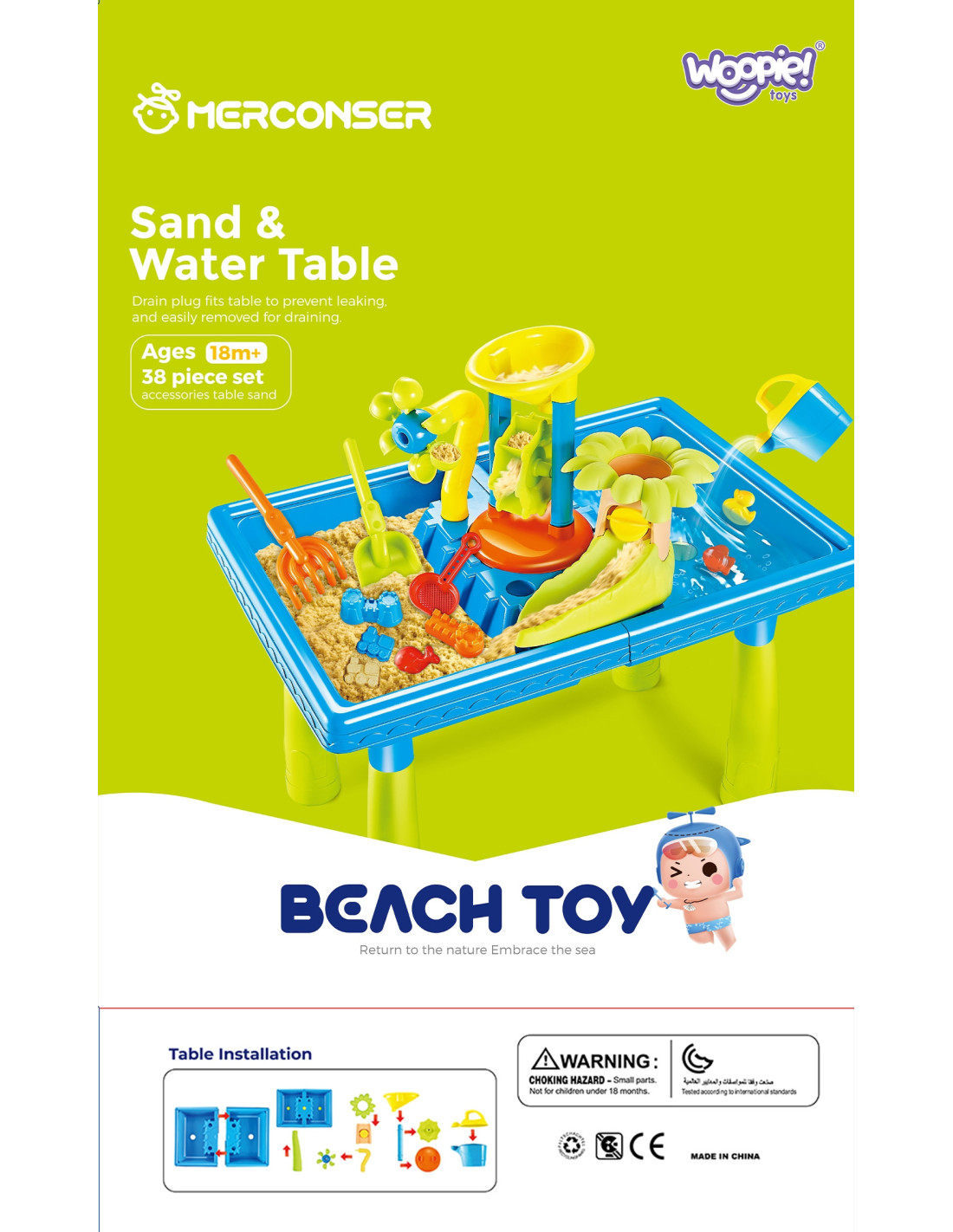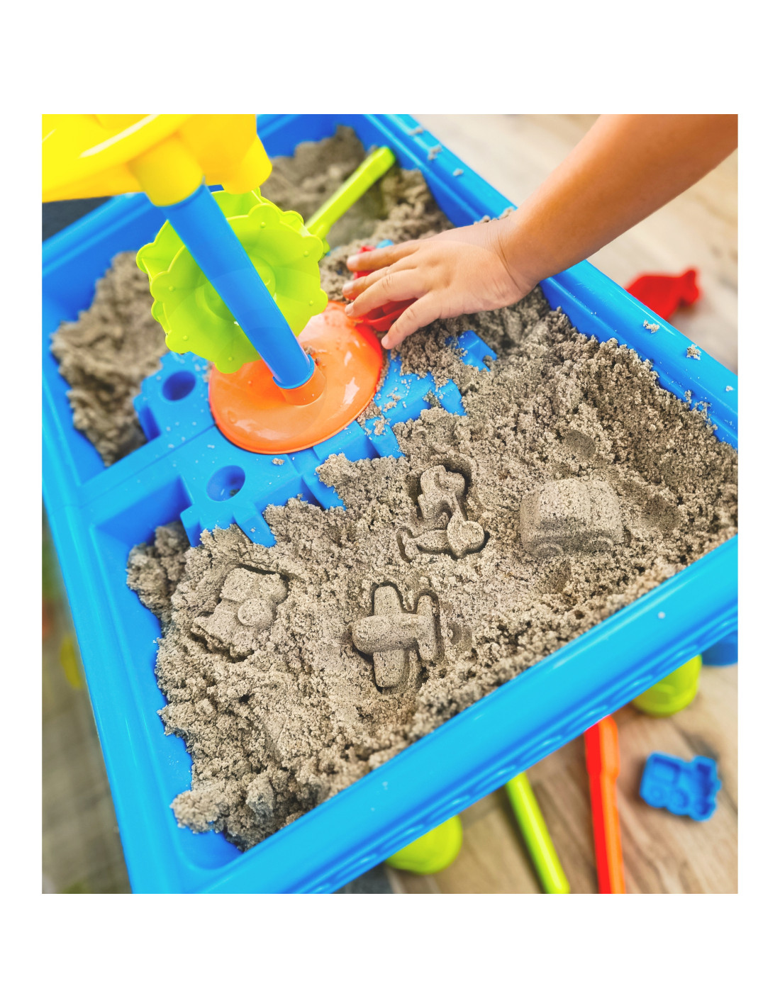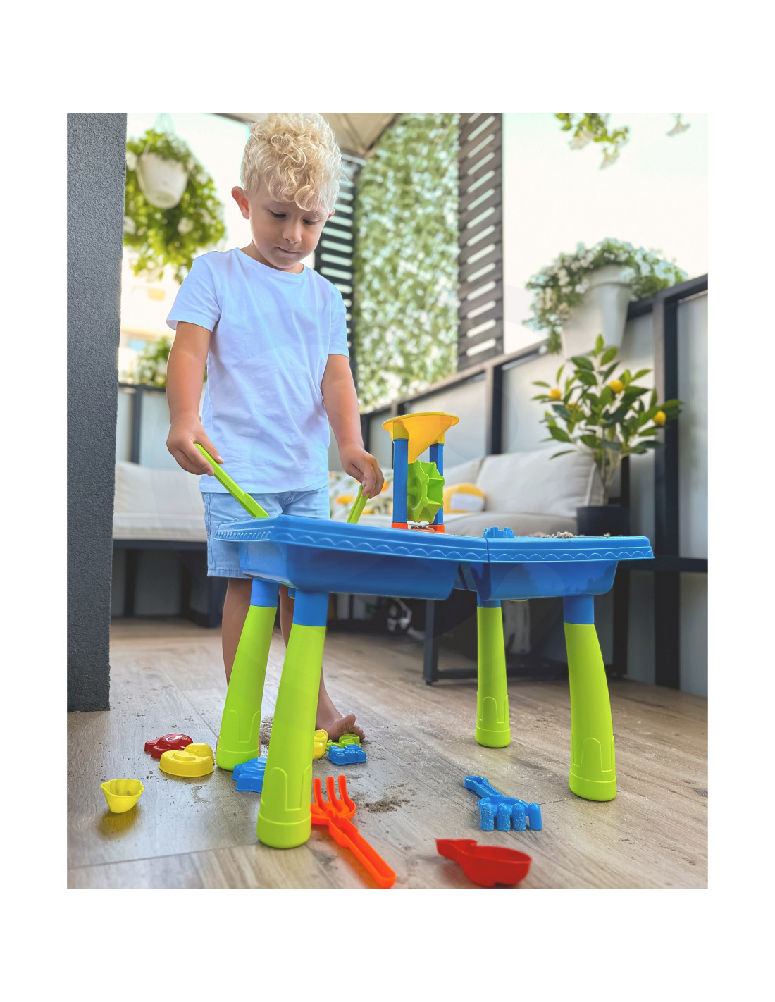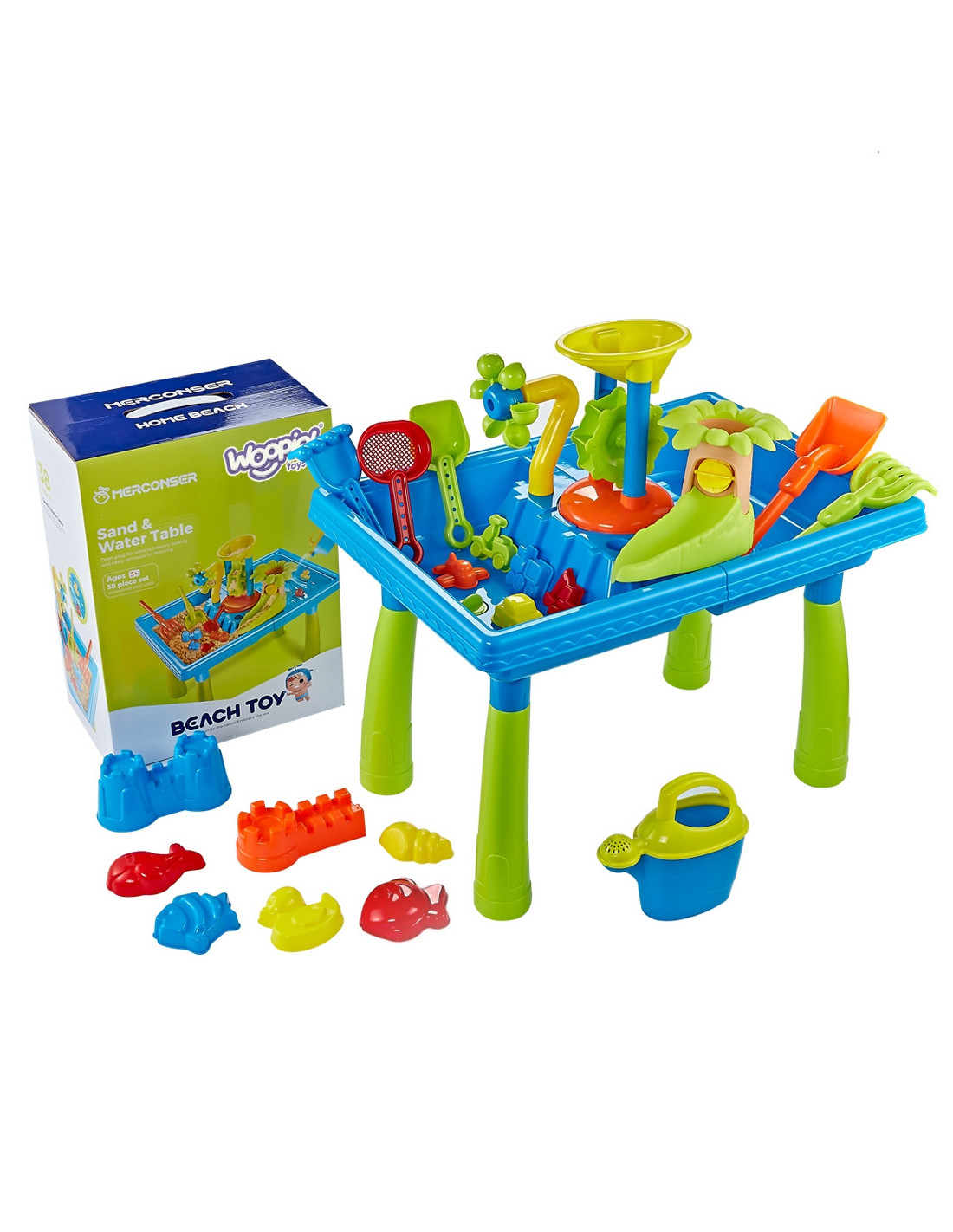 The 2-in-1 Water Table Sandbox from WOOPIE is perfect for playing with water and sand . The set includes 18 accessories : molds, a watering can, a grinder, shovels, a strainer, and much more. The table has two recesses ; fill one with water and the other with sand. Children can pour water into the grinder and watch as the water sets the impeller in motion. Perfect for playing at home, on the beach, or in a sandbox.