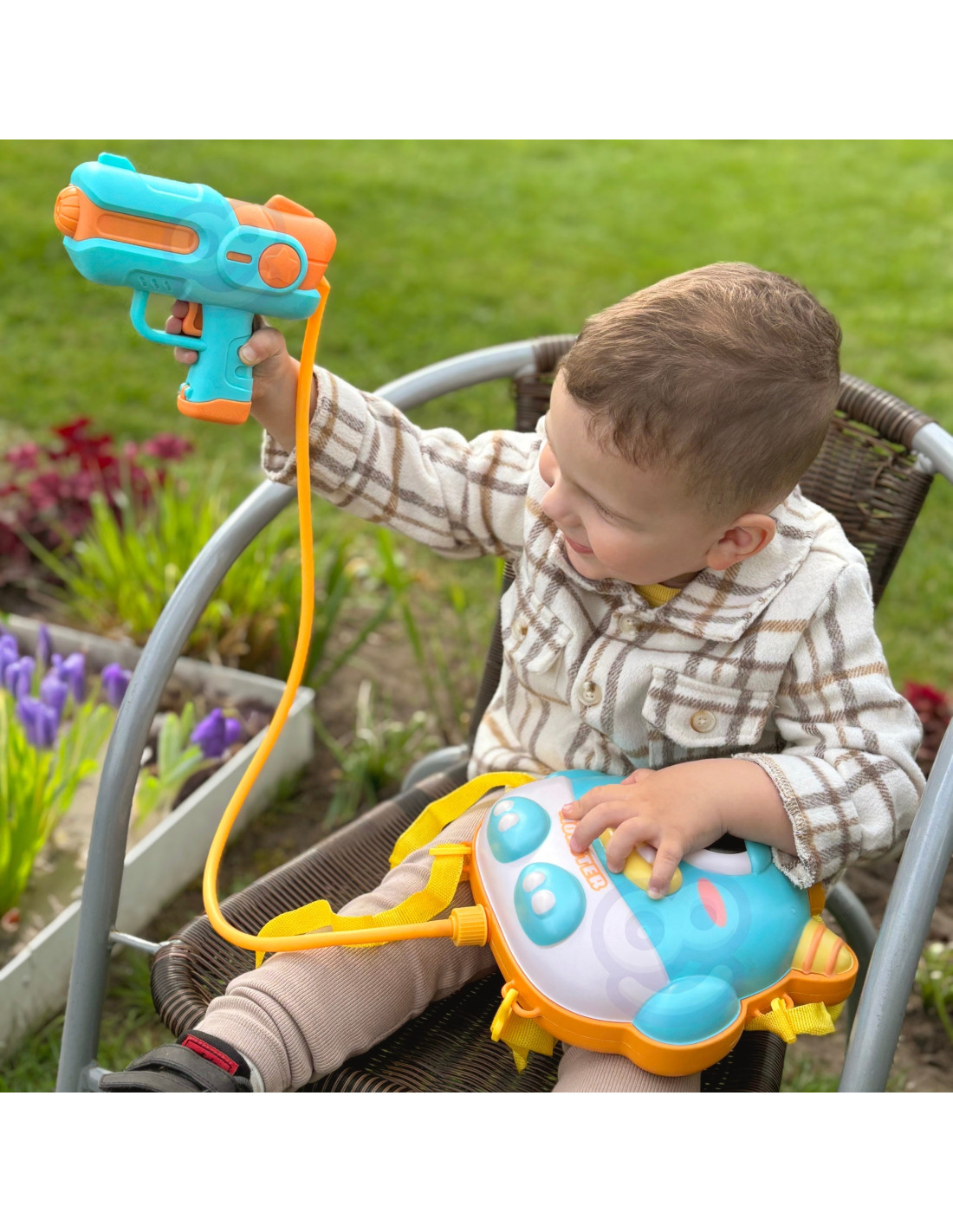 The UFO MONSTER Backpack Water Gun from WOOPIE is the perfect set for fun on hot days. The backpack's unique valve will captivate many children. Additionally, the backpack's large 2.1-liter capacity allows for extended play without frequent refills. By turning the front nozzle, you can adjust the flow from a continuous stream to a sprayer. It has a very long range of up to 5-8 meters . It's electric; simply charge the included battery and press the trigger to enjoy the water jet.