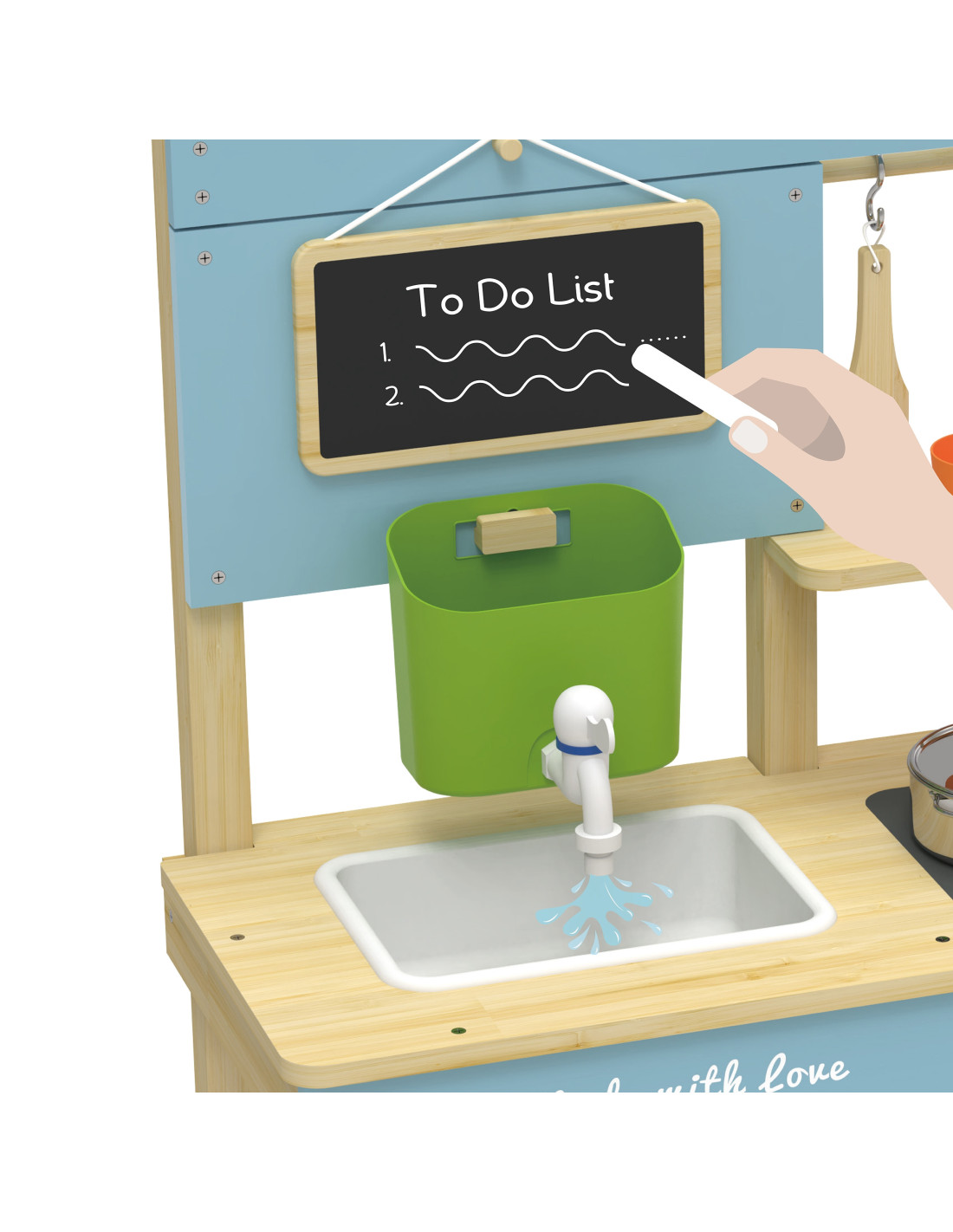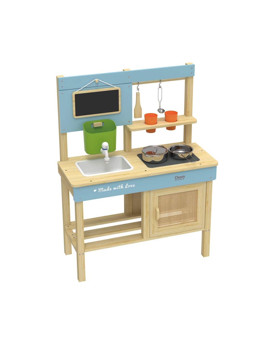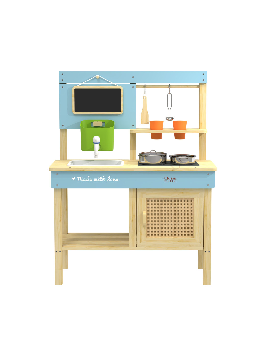 Children can have fantastic fun imitating adults! The Classic World Wooden Mud Kitchen is the perfect toy for little outdoor cooking enthusiasts! Designed with attention to detail, made of certified natural wood , and featuring charming pastel accents, it's designed to develop creativity, manual dexterity, and imagination through adult play. This toy can be used by children to pretend they're a restaurant or a shop. It can be used in countless ways, and the creative play is endless! The tank with a tap circulates water, so children can enjoy cooking, washing dishes, or stirring mud.