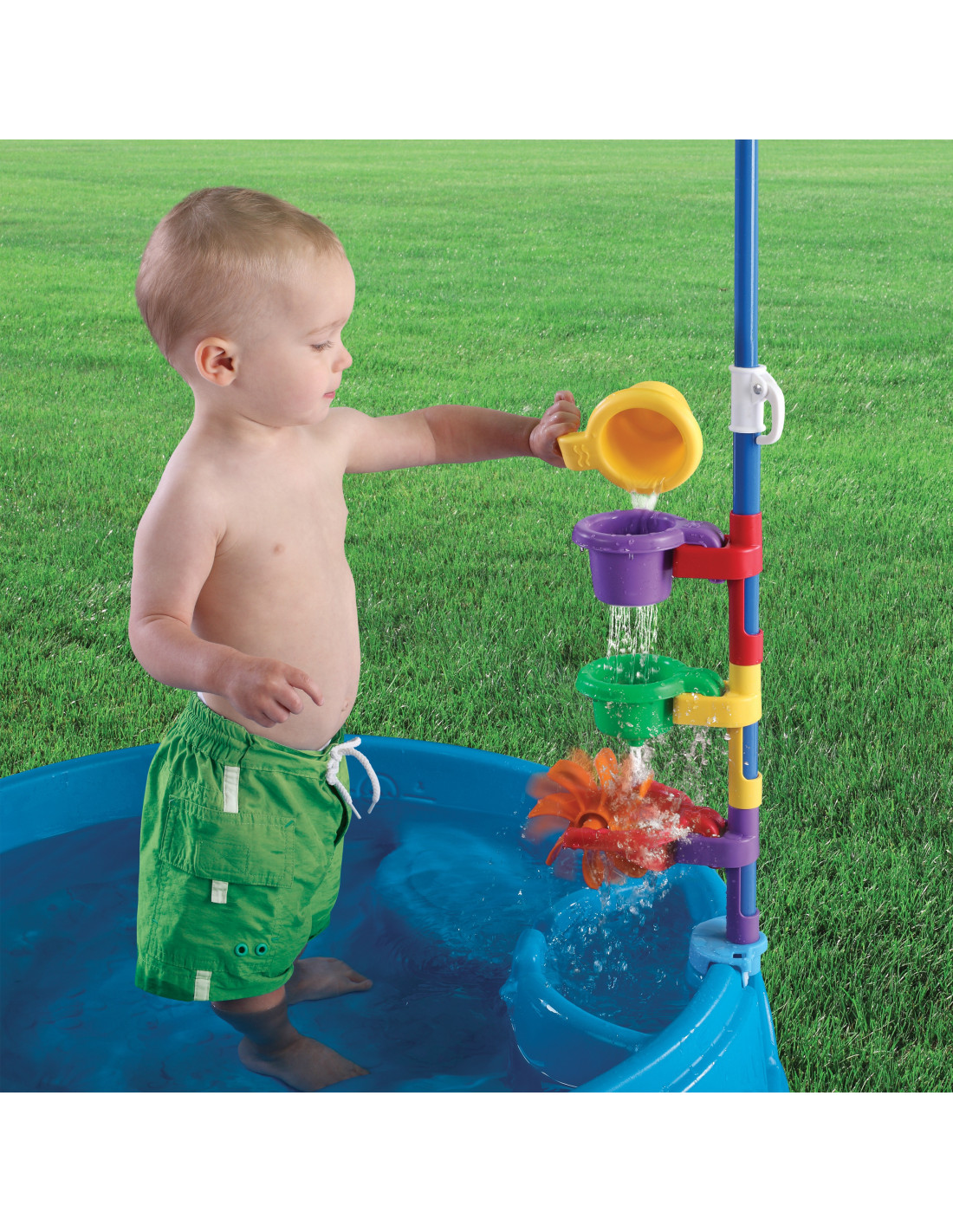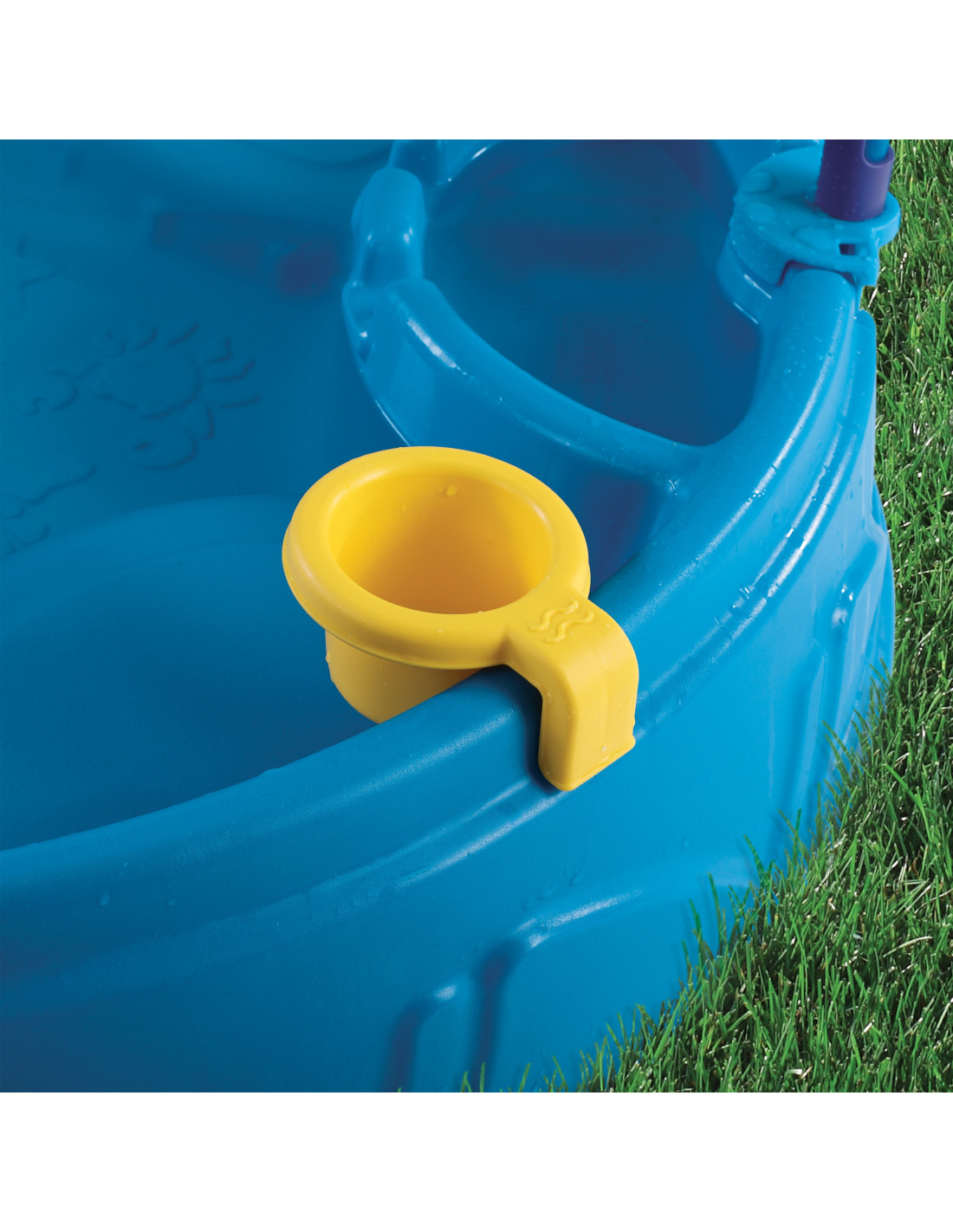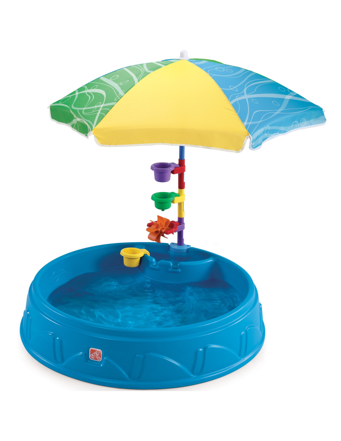 The Children's Garden Pool with Umbrella from the renowned brand Step2 is the perfect solution for hot days! Its robust and durable construction ensures safe outdoor play . The pool is equipped with a colorful umbrella to provide shade for children on hot days. The umbrella pole is used to attach included accessories, such as a strainer or water mill. The pool floor has non-slip embossing to provide traction for little feet. Two specially contoured seats are also featured on the pool edges. The maximum load capacity of each seat is 23 kg. The Play & Shade Pool can hold approximately 45 liters of water or approximately 75 kg of sand.