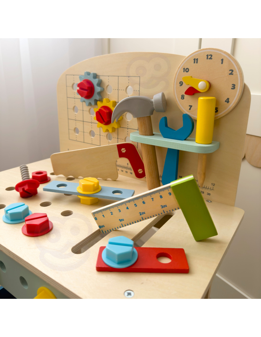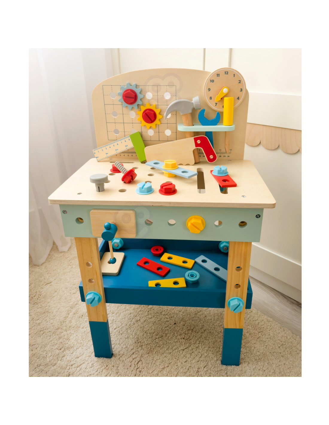 The TOOKY TOY DIY Table will be a dream come true for any little handyman. The set includes a table with a variety of toy tools : a saw, hammer, wrench, screwdriver, vise, measuring tape, screws, nuts, washers, and gears. The table's shelves and handles ensure your child has all the necessary tools and accessories at hand, and the set can be attached to the table. The toy is made to be child-safe , with rounded corners and edges to prevent injury.