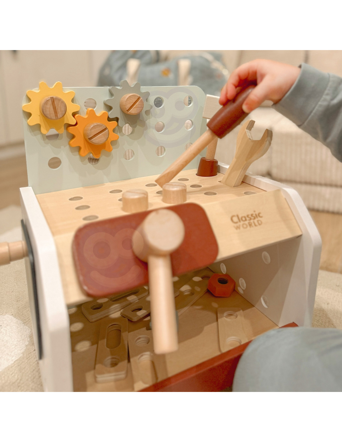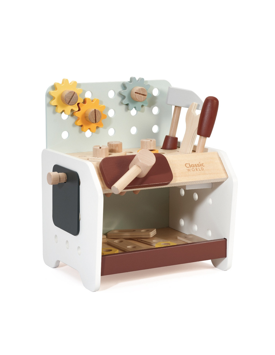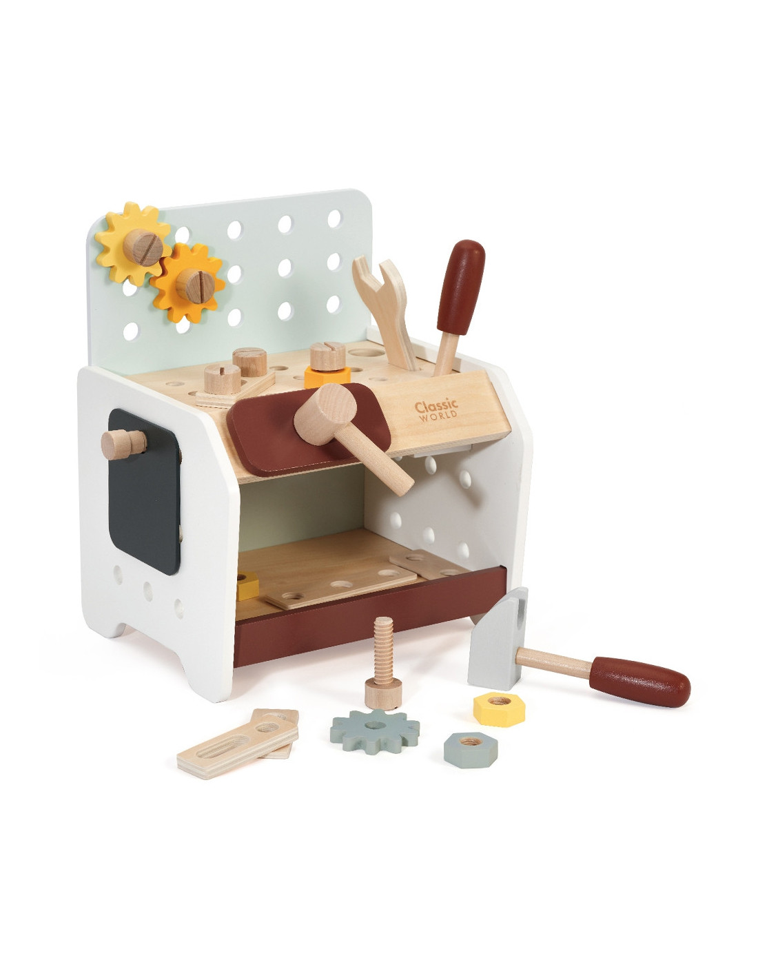 This wooden workbench from Classic World will provide great fun for every little DIY enthusiast. Thanks to the many tools included, tinkering will support the development of manual skills , spark interest, and ignite children's imaginations . From now on, every toddler will have the opportunity to hone their creativity, as the set includes everything they need for repairing, screwing, driving nails, and other renovation tasks. The set is made of high-quality wood and has no sharp edges, making it safe for children and the environment .