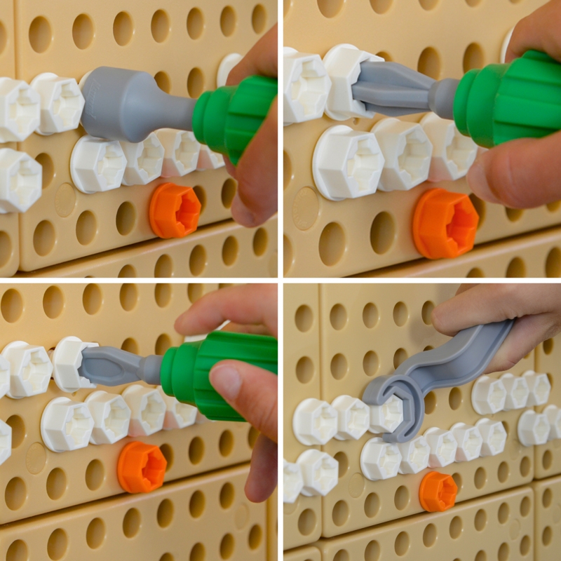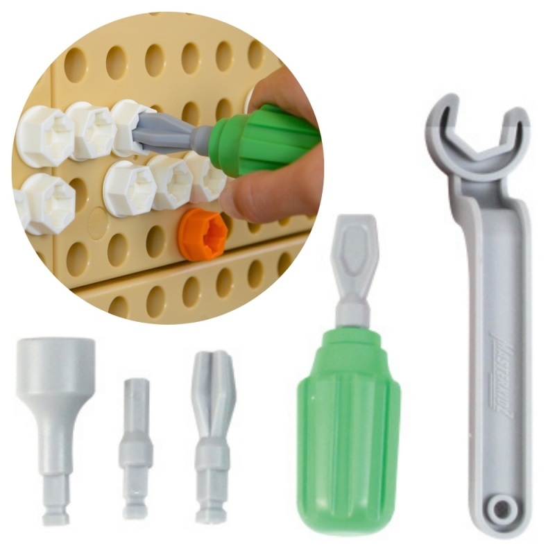 Praktyczny zestaw narzędzi dla dzieci, dzięki którym zabawa ze ścianką Masterkidz STEM będzie dużo ciekawsza! W zestawie śrubokręt z 4 wymiennymi końcówkami, oraz klucz. Narzędzia służą do przykręcania i odkręcania śrub Masterkidz. Zabawka ćwiczy motorykę dzieci, oraz uczy je poprawnego używania podstawowych narzędzi.