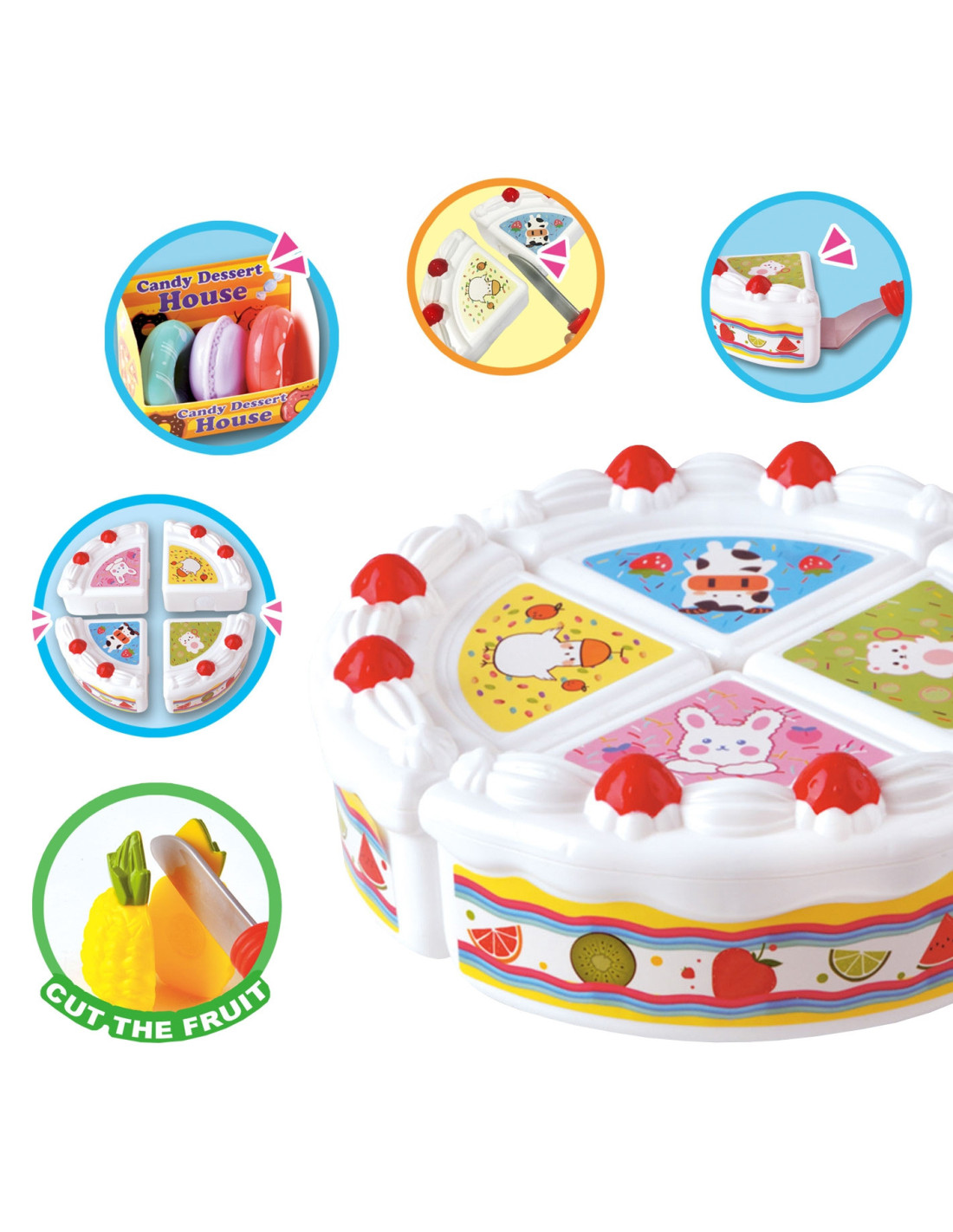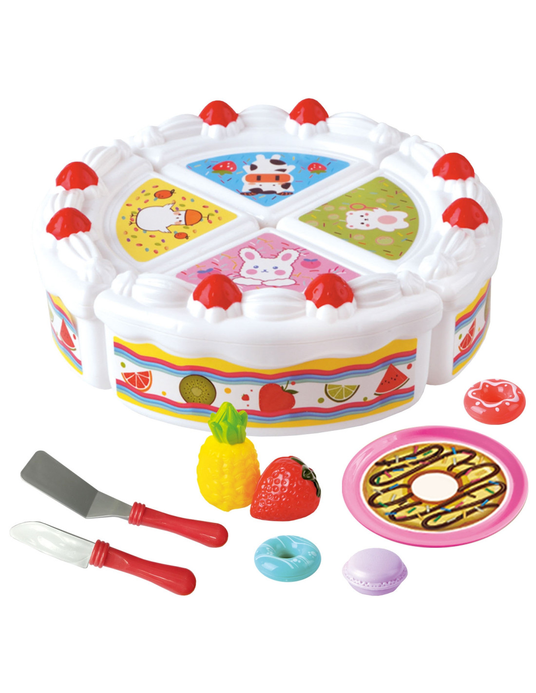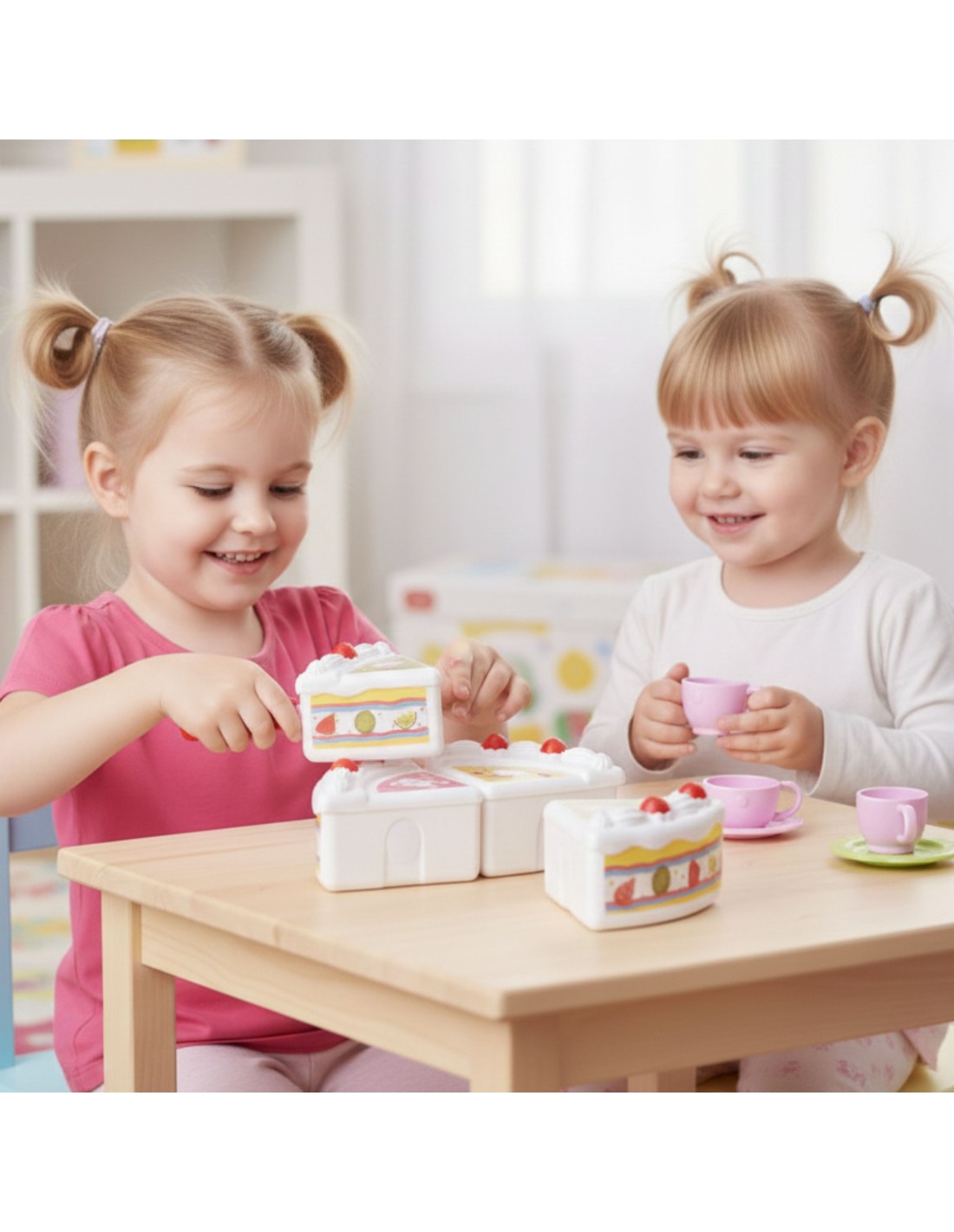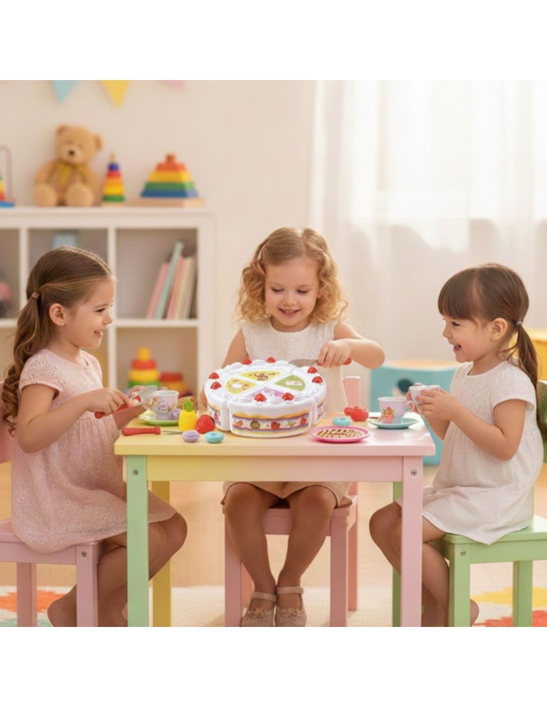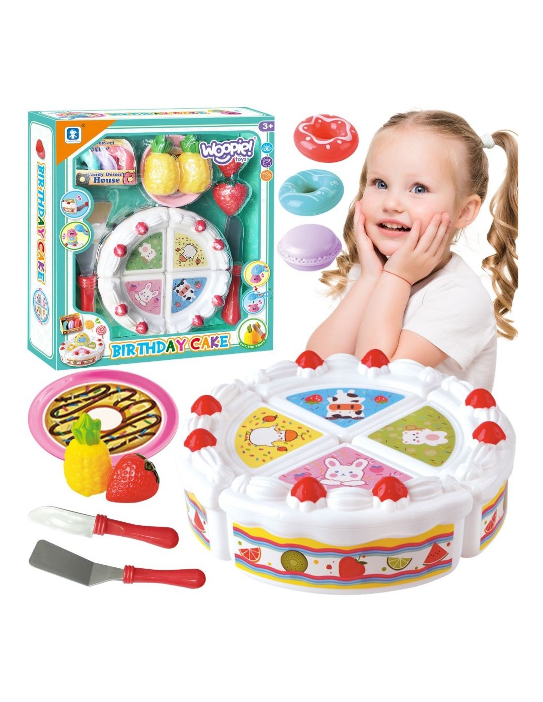 Zestaw do herbaty z tortem od marki Woopie to idealna propozycja na spotkania z przyjaciółmi. Zestaw urodzinowy będzie idealnym atrybutem każdej małej gospodyni czy małego gospodarza do zorganizowania niezapomnianego przyjęcia. Dziecko może wcielić się i poczuć się jak dorosły gospodarz domu. W zestawie znajdziemy pięknie udekorowany tort, który możemy pokroić na 4 kawałków i poczęstować swoich gości. W skład zestawu wchodzą także inne przekąski, np. ciasteczka i owoce, a do tego również nóż do krojenia tortu i owoców, talerzyk na tort i szpatułka do podnoszenia ciasta. Krojenie tortu i owoców jest doskonałą zabawą, która rozwija zdolności manualne dzieci. Zabawy w odgrywanie ról pozytywnie rozwijają dziecko - rozwijają wyobraźnię i kreatywność.