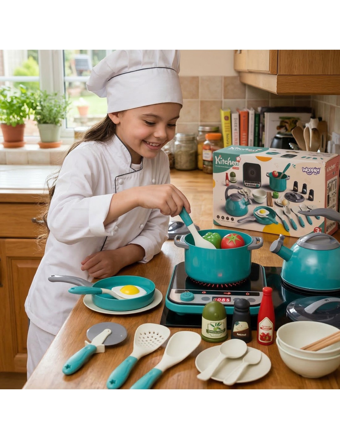 Ten obszerny zestaw do zabawy w kuchnię od marki Woopie to idealny prezent dla każdego małego kucharza! Zabawka pozwala dzieciom na naśladowanie dorosłych i odgrywanie ról, rozwijając ich kreatywność, wyobraźnię oraz zdolności manualne. Zestaw zawiera wszystko, czego potrzeba do przygotowania wymarzonego posiłku.W skład zestawu wchodzi aż 30 elementów, w tym garnki, patelnia z jajkiem sadzonym, czajnik, a nawet indukcyjna płyta grzewcza. Dodatkowe akcesoria, takie jak sztućce, warzywa, i przyprawy sprawiają, że zabawa staje się niezwykle realistyczna i wciągająca. To doskonały sposób na naukę przez zabawę, rozwijanie zdolności społecznych i spędzanie czasu z rodzicami.