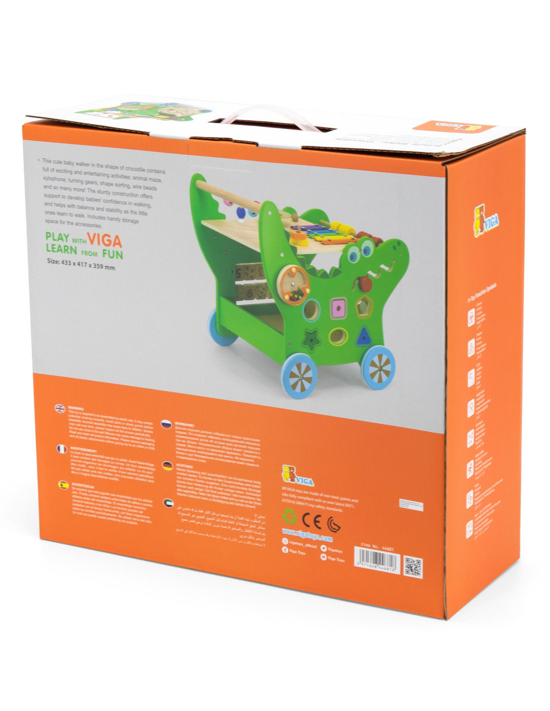 Drewniany Chodzik Krokodylek od marki VIGA zawiera w sobie pełnię ekscytujących aktywności dla malucha: labirynt zwierzątek, ksylofon, koła zębate, sorter kształtów, liczydło i wiele innych. Wytrzymała konstrukcja oferuje stabilne wsparcie, by maluszek pewnie mógł rozpocząć naukę chodzenia i pomaga mu utrzymać równowagę. Korzystając z aktywności zawartych w tym chodziku dziecko będzie mogło rozwijać swoje zdolności manualne, koordynację wzrokowo-ruchową, logikę, a także rozpocznie naukę kształtów, kolorów i liczb. Posiada przestrzeń na trzymanie ulubionych zabawek.