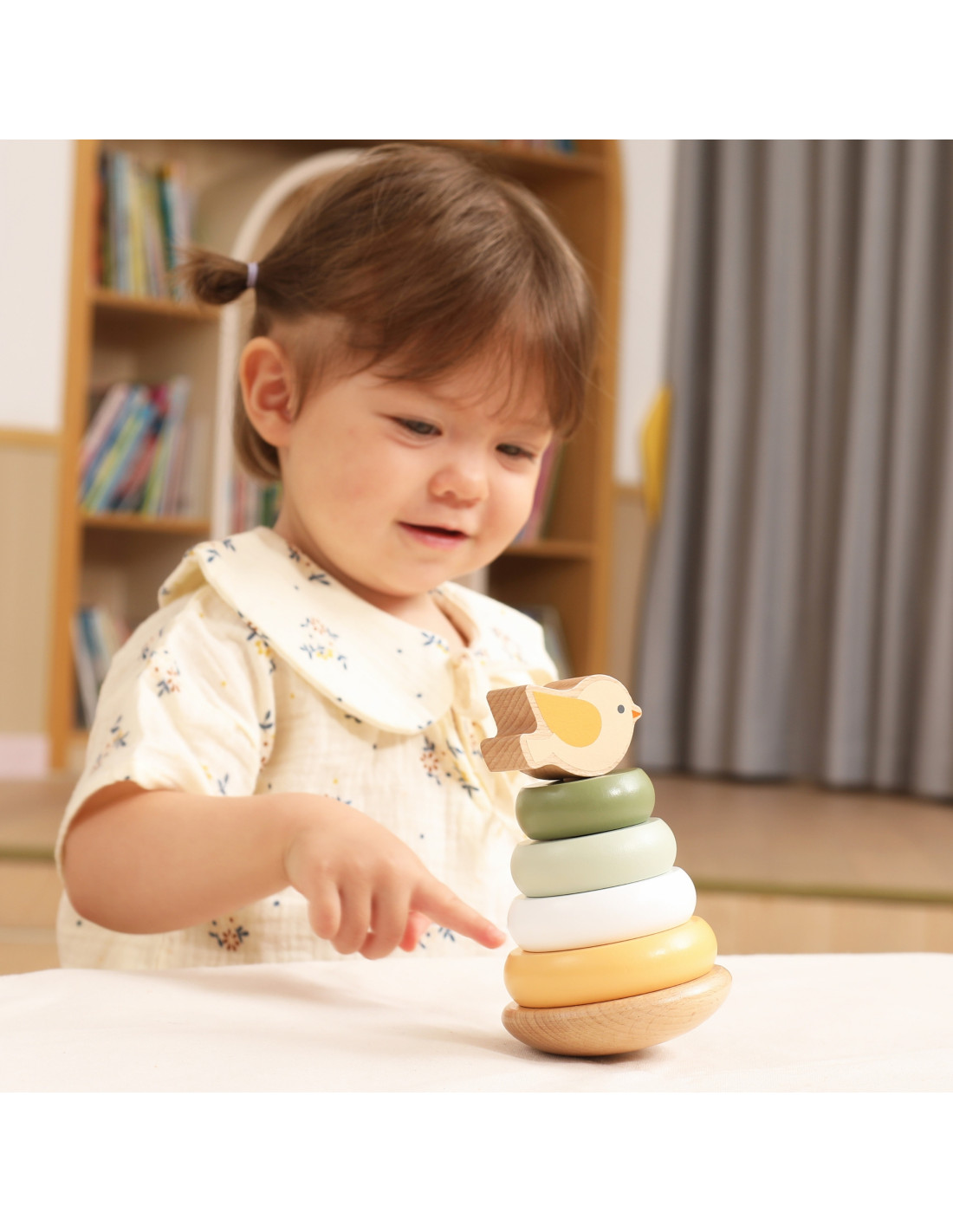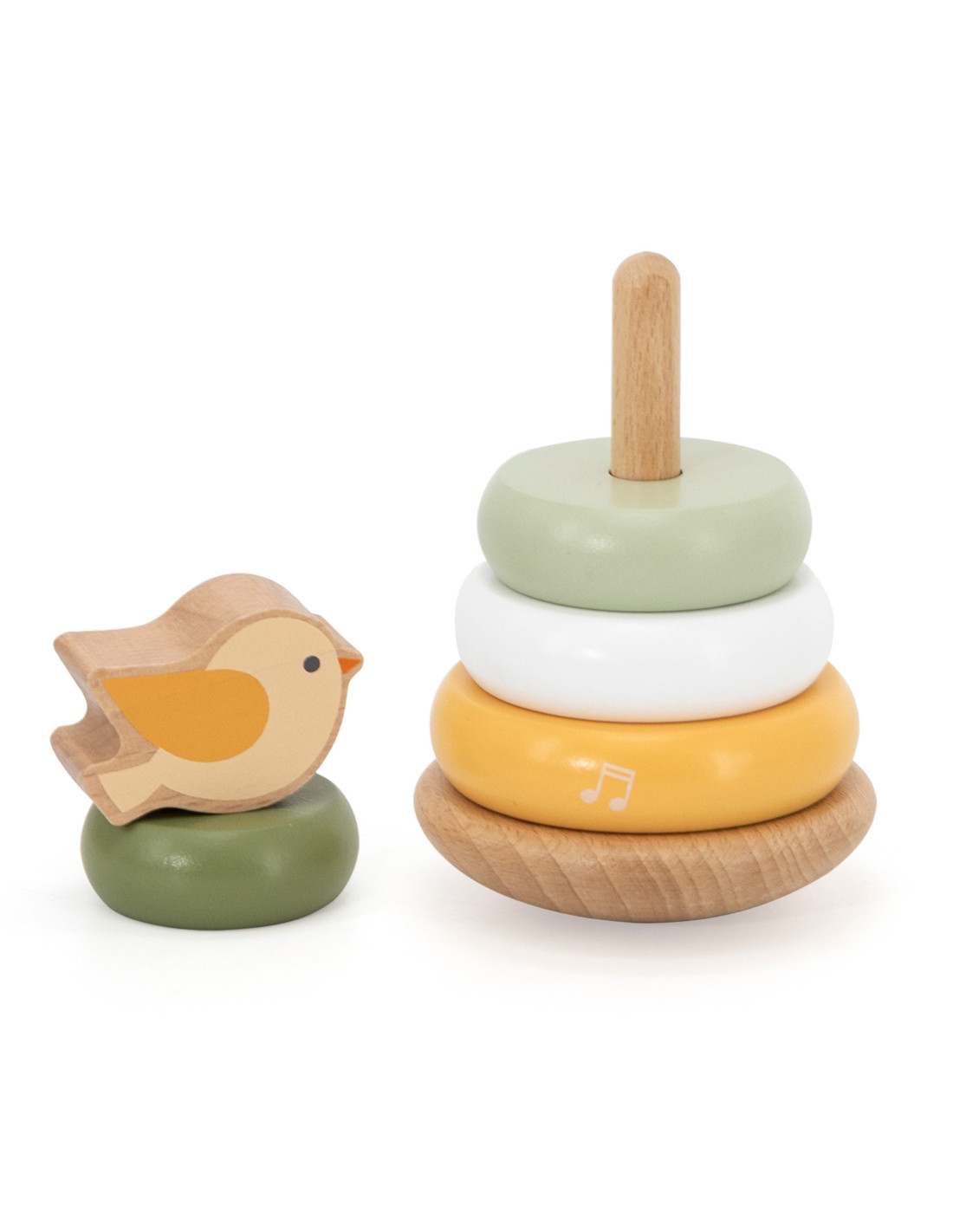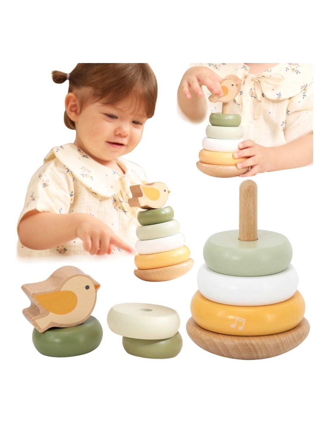 Poznaj Drewnianą Piramidke Edukacyjną , zabawkę, która łączy naukę z zabawą dla dzieci od 12. miesiąca życia! Maluchy mogą popchnąć ptaszka, aby zaczął się chwiać i obserwować jego ruchy. Drewniane pierścienie o gładkich krawędziach łatwo układa się w różnej kolejności, co rozwija zdolności manualne i logiczne myślenie. Kolorowe kółka pomagają w nauce rozróżniania kolorów i rozmiarów. Solidna konstrukcja i odpowiedni rozmiar elementów sprawiają, że zabawa jest bezpieczna i komfortowa dla małych rączek.