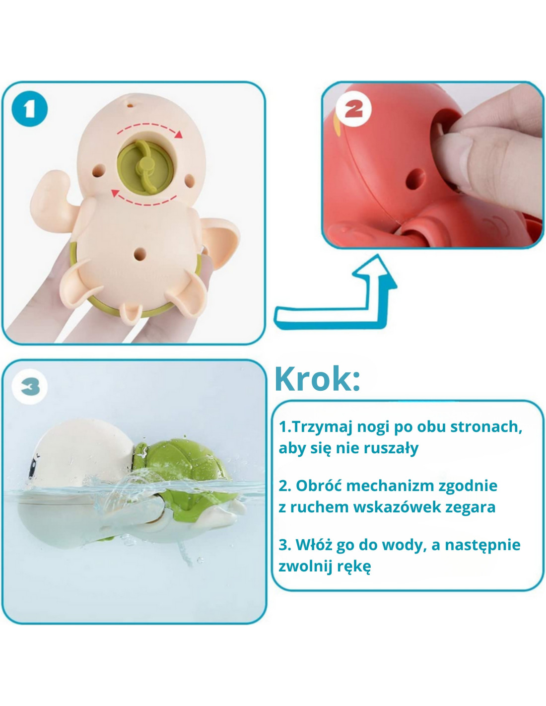 - ✔️ po zanurzeniu żółw zaczyna poruszać łapkami i pływać, zapewniając dziecku wesołą rozrywkę podczas kąpieli.