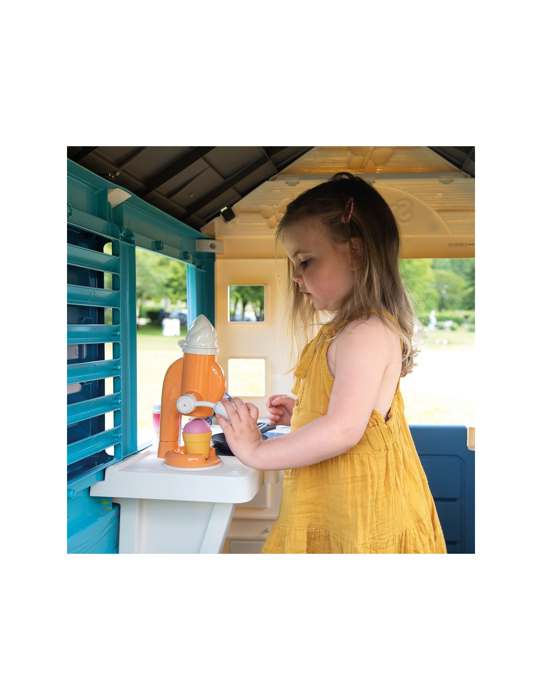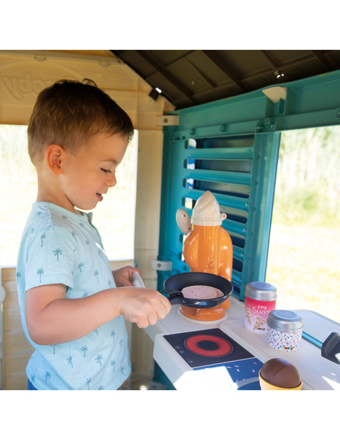 Solidny domek doskonale pasuje do ogrodu, daje możliwość dzieciom wyobrażenia sobie wielu historii. Dzięki dużej wewnętrznej przestrzeni, dzieci mogą zaprosić przyjaciół do wspólnej zabawy. Domek w ciekawej, wiosennej kolorystyce.