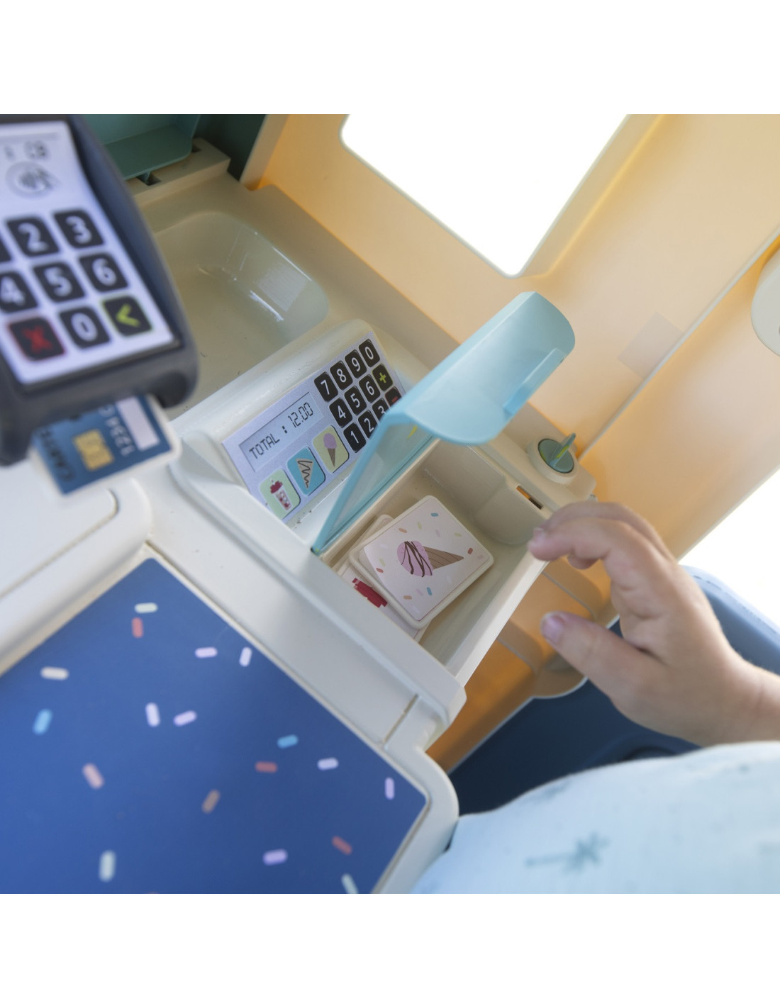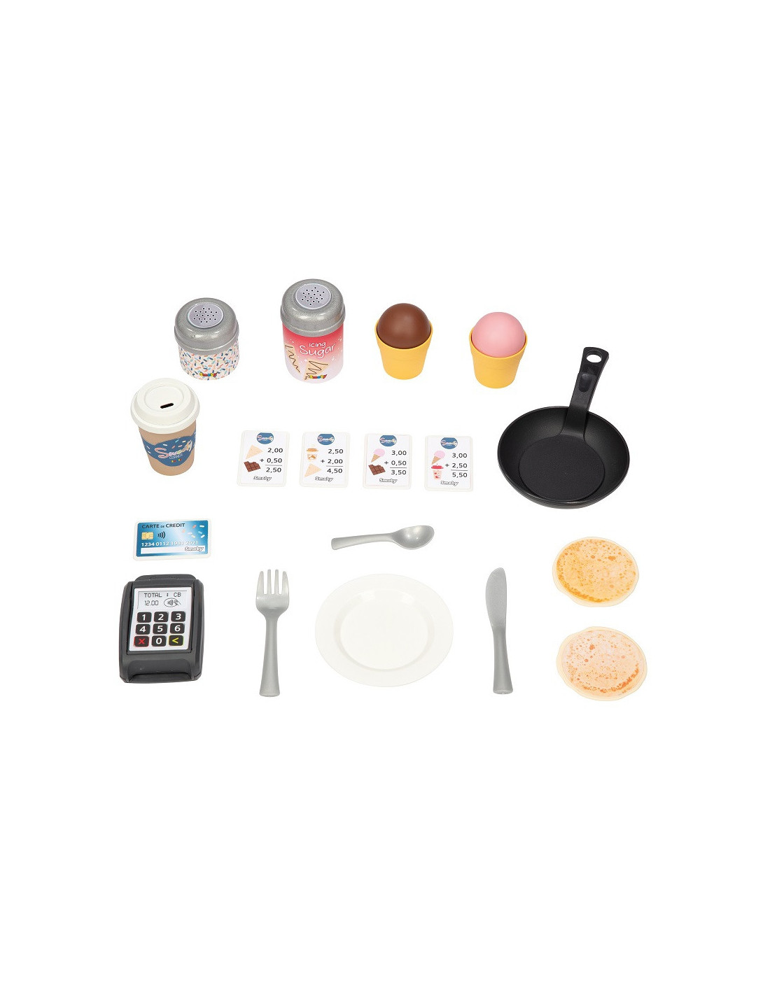 - - w zestawie znajdziemy 18 akcesoriów - naleśniki, lody, posypki, sztućce, karty kredytowe, bilony,