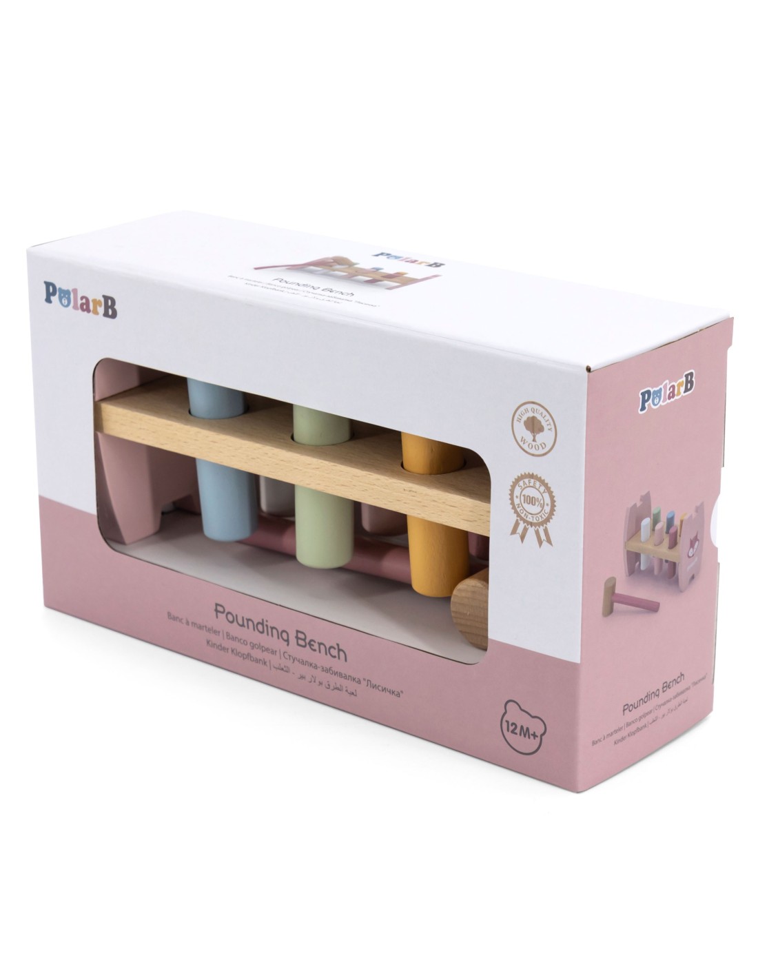 - - Zestaw zawiera podstawkę, 6 kolorowych kołków, młoteczek do wbijania