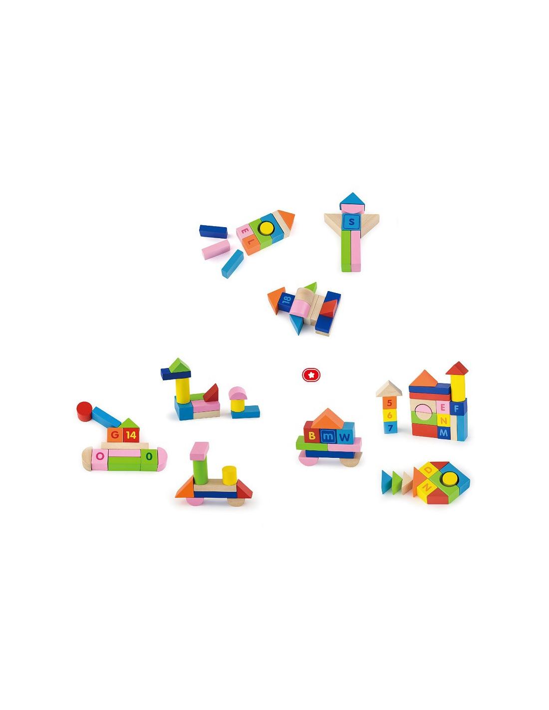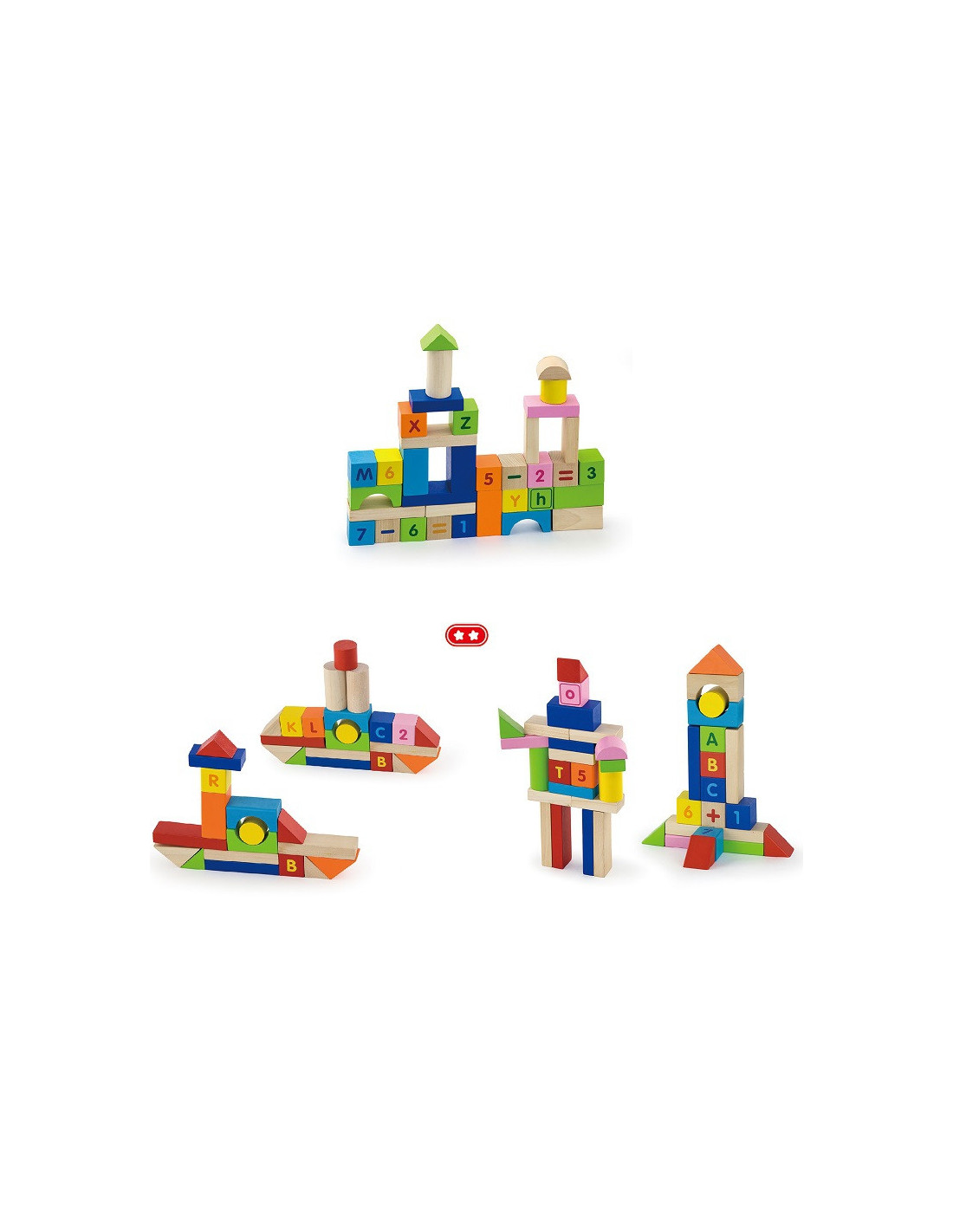 - - 100 sztuk edukacyjnych klocków drewnianych ze znakami dodawania, odejmowania, mnożenia, a także cyferkami i literkami.