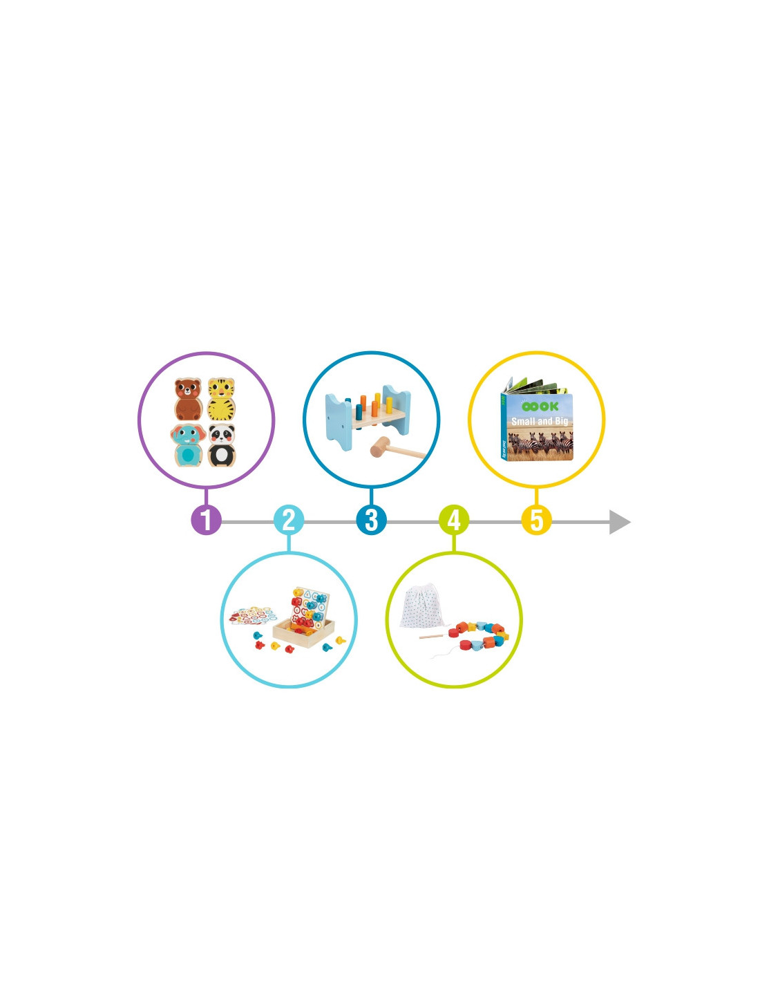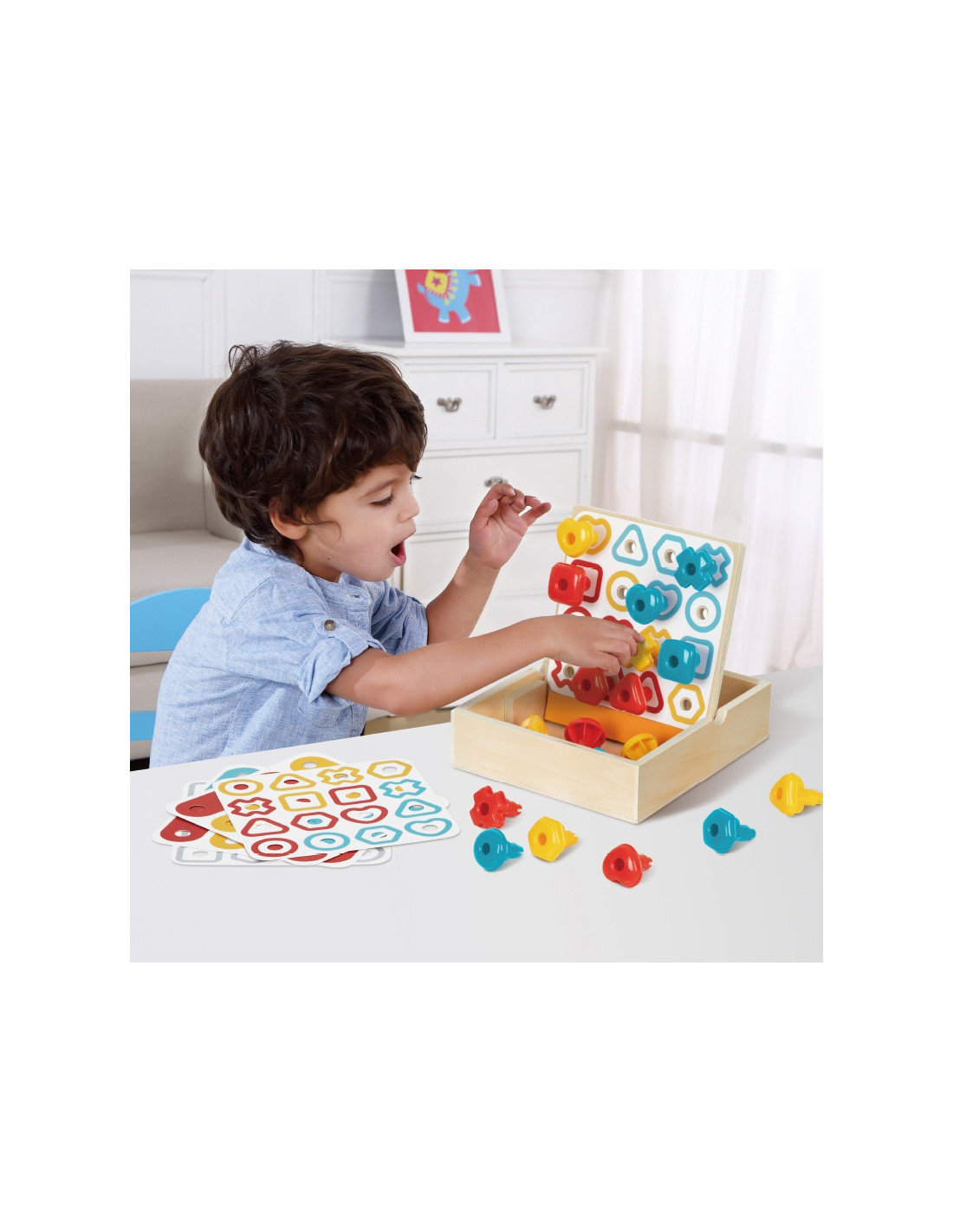 - - Kolorowa przebijanka młoteczkiem. Wytrzymała drewniana konstrukcja, sześć kolorowych kołków i młoteczek zachęcają dzieci do wbijania wszystkich kołków w otwory , a następnie odwracania jej i powtarzania tego procesu wielokrotnie