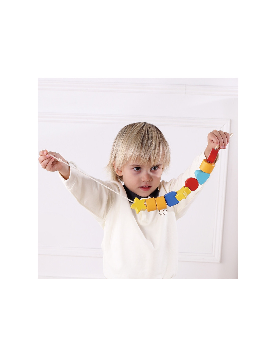 - - Nawlekanka "Kolorowe kształty" Zestaw obejmuje 1 torbę na przechowywanie, 11 klocków w różnych kształtach i 1 sznureczek do nawlekania.