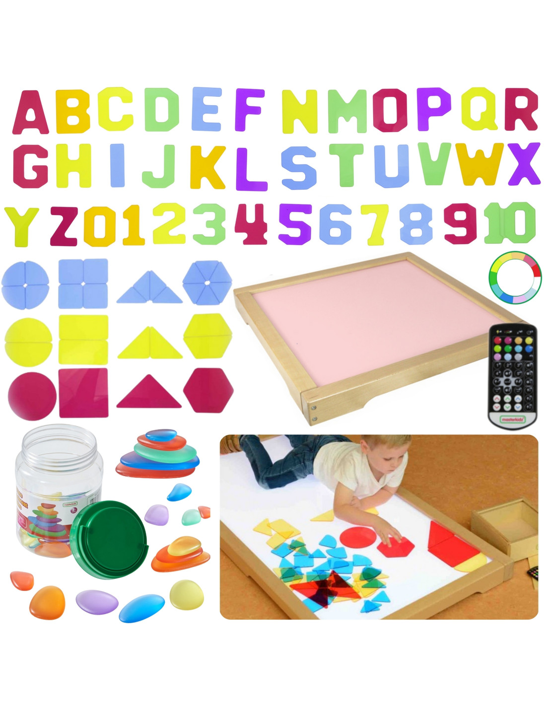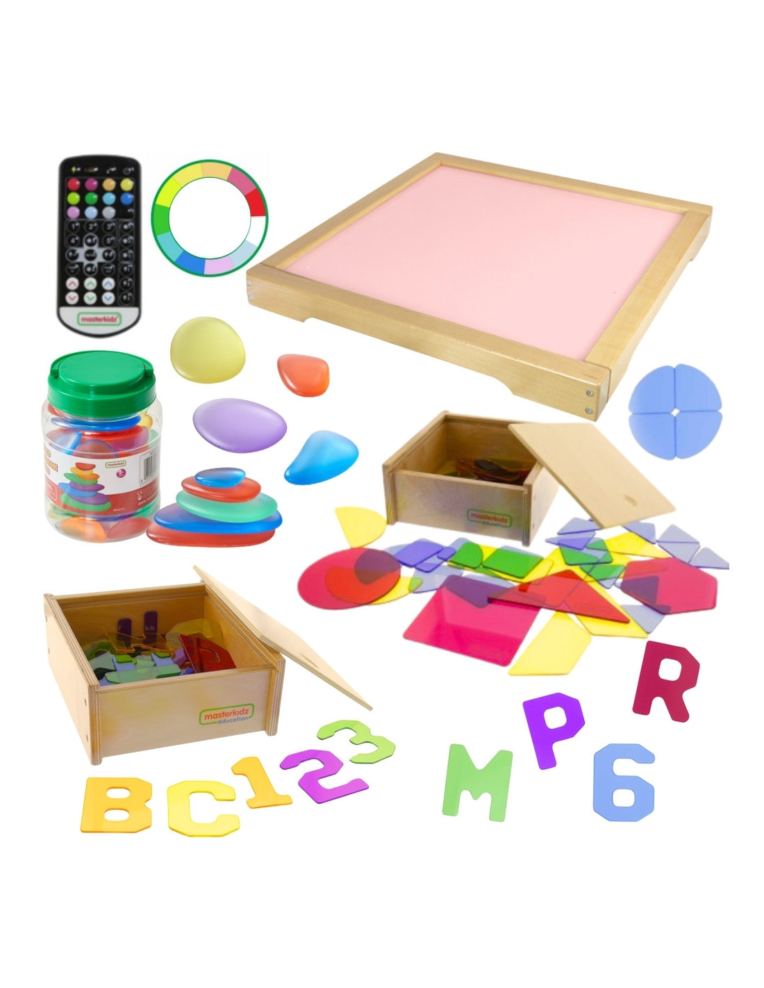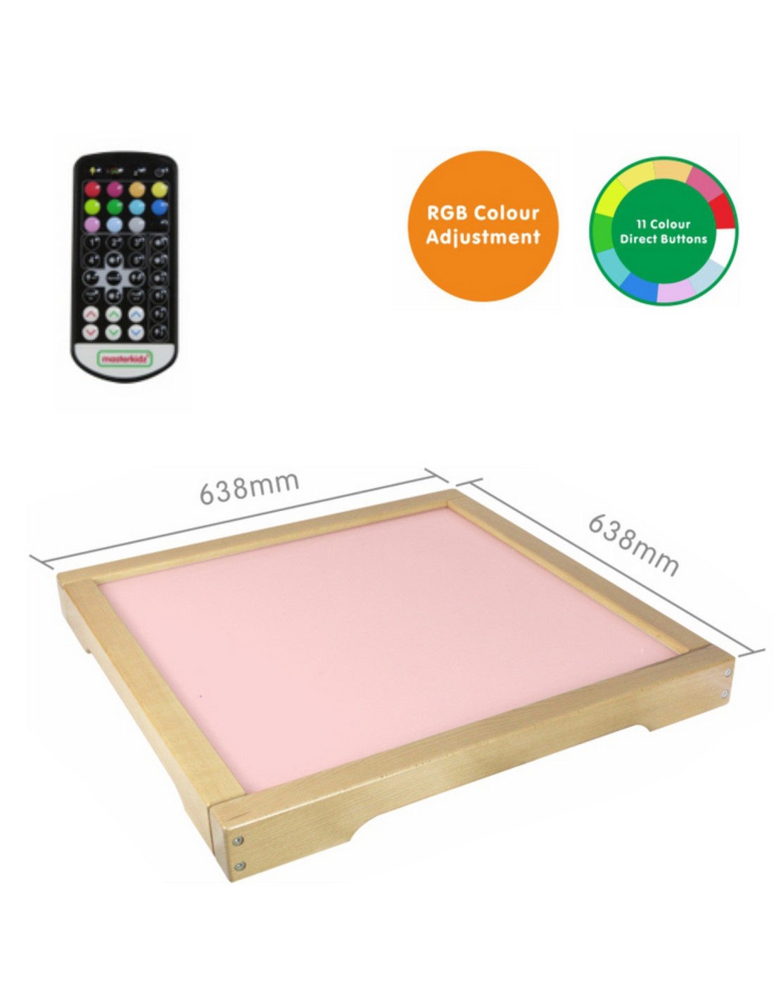 Panel Skrzynia LED Sensoryczna Masterkidz to solidna, drewniana skrzynka z podświetleniem LED emitującym kolorowe światło z możliwością dowolnej konfiguracji dzięki dołączonemu pilotowi, użytkownik może ustawić panel na jeden z 11 zaprogramowanych kolorów, lub ręcznie zmienić emitowany kolor bazując na podstawowych barwach światła: czerwonej, zielonej i niebieskiej. Urządzenie pozwala także na płynne przechodzenie pomiędzy kolorami oraz zapamiętywanie wybranych barw do ponownego użycia. Panel świetlny LED umożliwia różnorodne aktywności wspierające rozwój kreatywności, takie jak mieszanie kolorów czy nauka poprzez system STEM. Efektowne rezultaty uzyskuje się, gdy światło przenika przez różne materiały – liście, papier, tackę z piaskiem czy przezroczystą wodą. Panel doskonale współpracuje z dołączonymi do zestawu kolorowymi akcesoriami które wzbogacają możliwości zabawy i nauki, umożliwiając tworzenie różnorodnych wzorów i kompozycji w świetle.