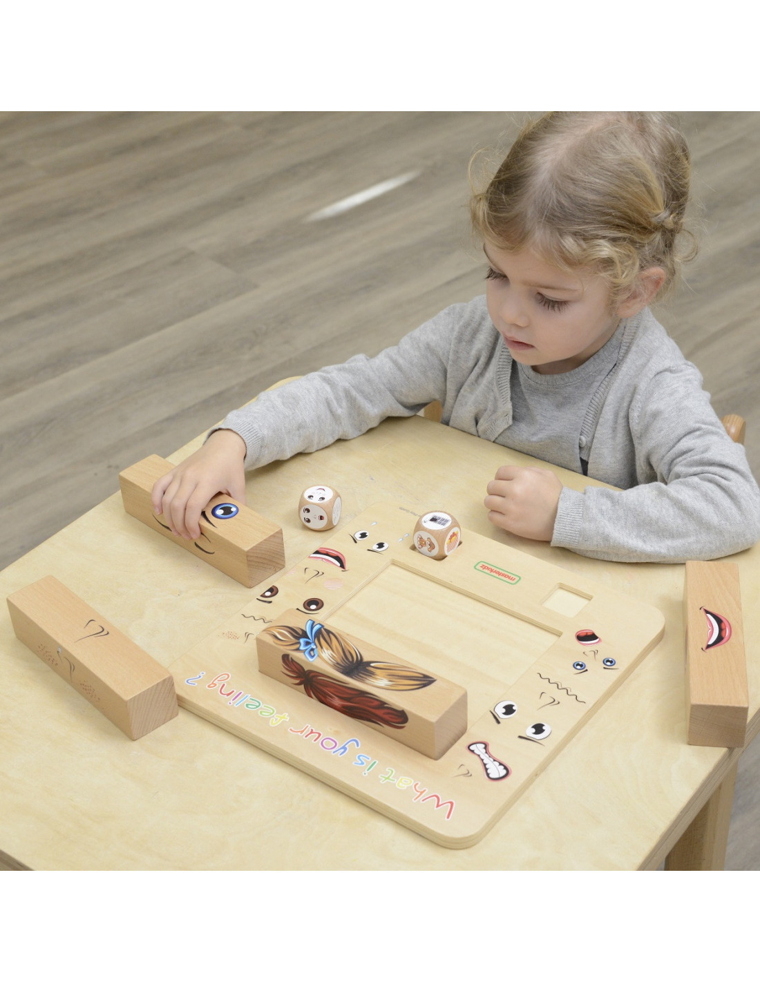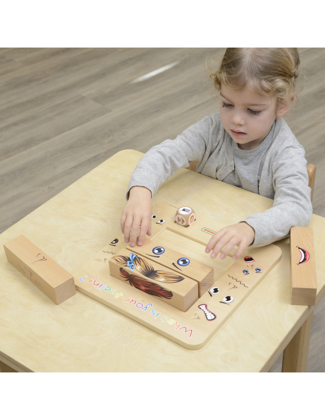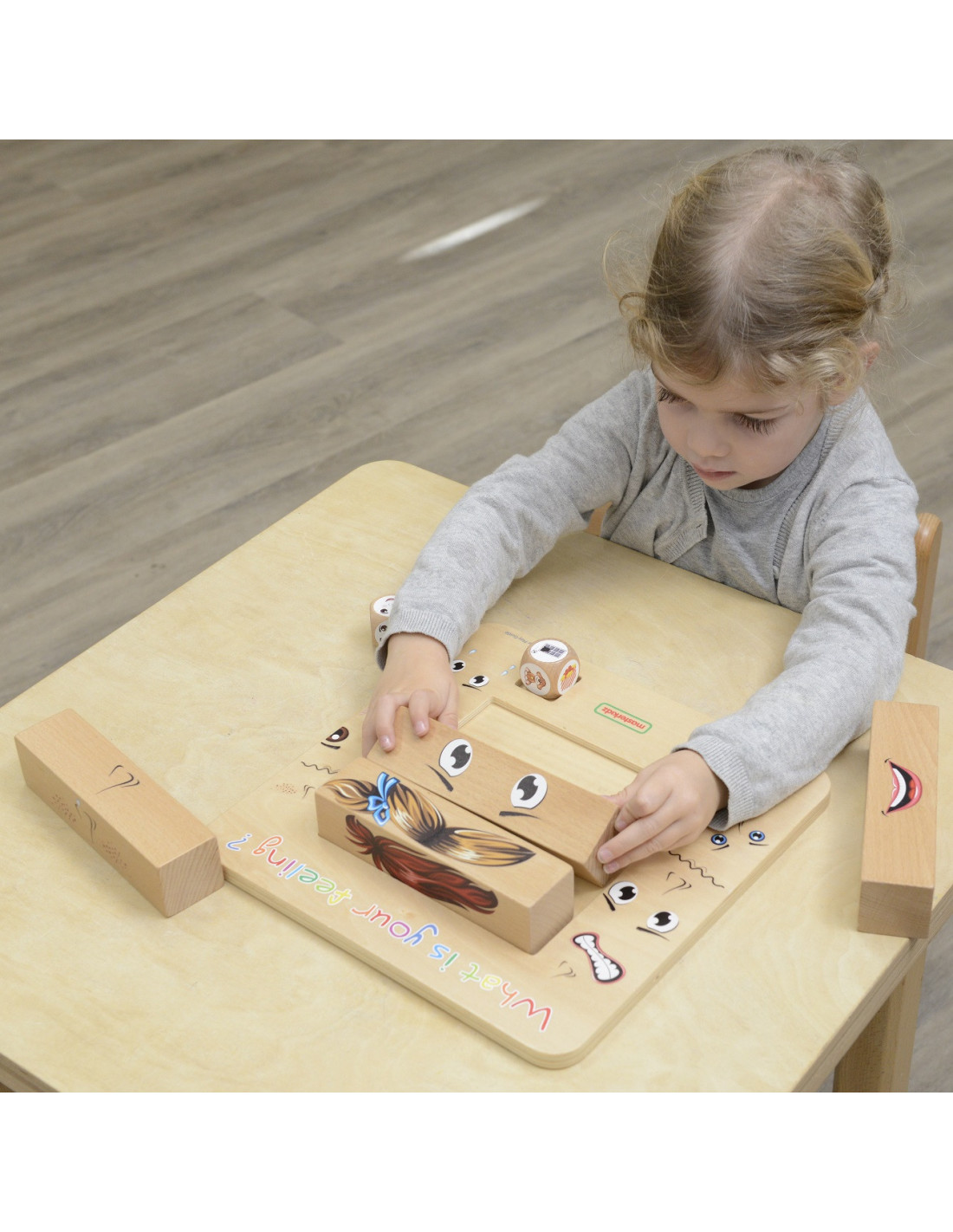 Tablica składa się z 4 bloków, za pomocą których dziecko może ułożyć aż 64 różne twarze wyrażające inne uczucia. Ćwiczenia wykonywane z pomocą tej tablicy dają ogromne możliwości nauczenia dzieci prawidłowego zarządzania emocjonalnego, jak sobie radzić ze swoimi emocjami, co one oznaczają. Produkt nadaje się do pracy indywidualnej, zarówno w domu, jak i w specjalistycznych gabinetach.