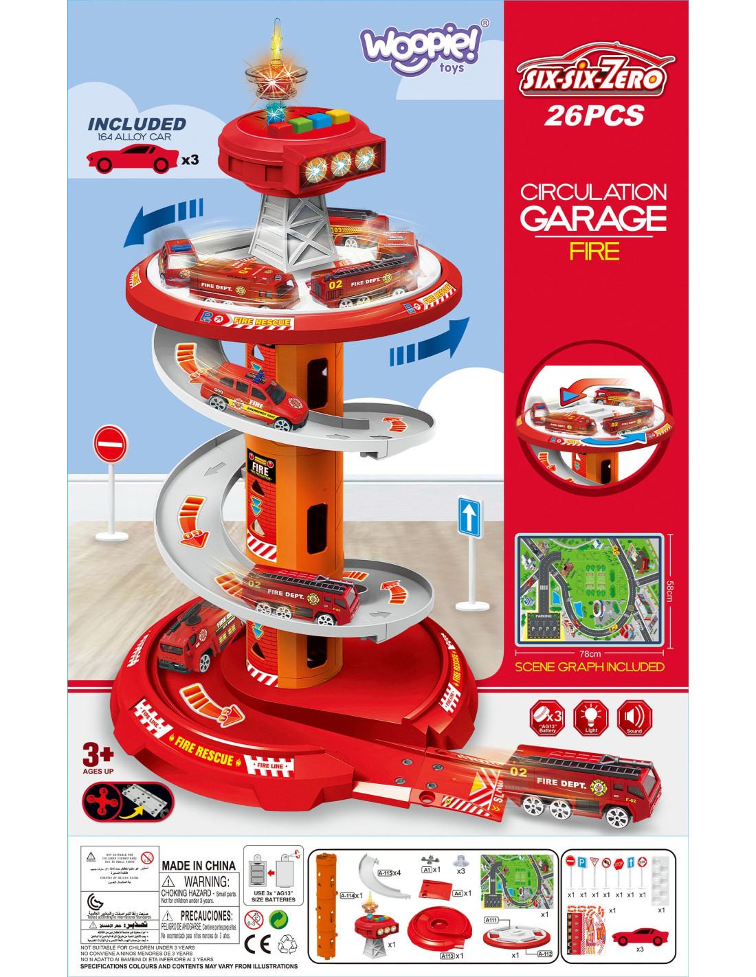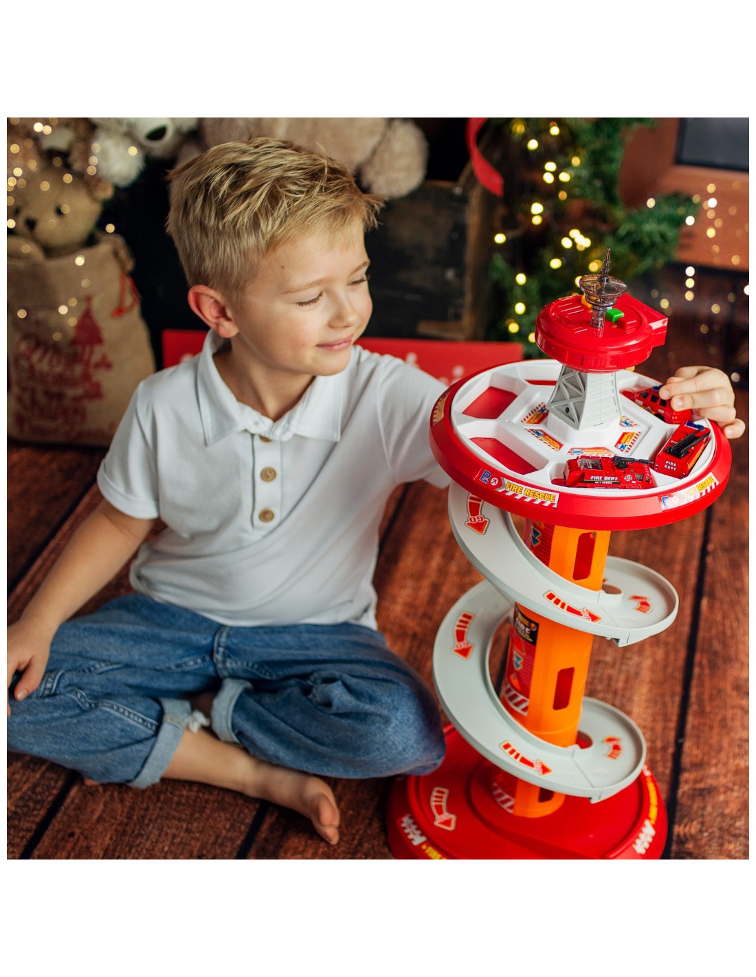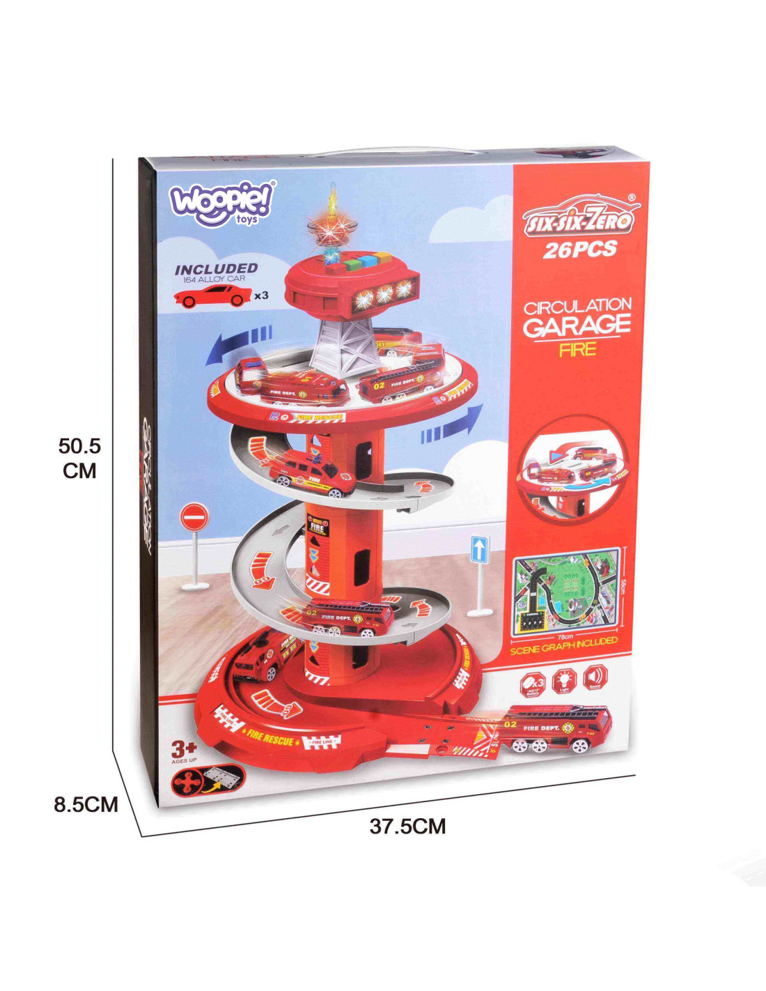 Rewelacyjny wielopoziomowy parking garaż obrotowy dla Straży Pożarnej od firmy Woopie na pewno przypadnie dziecku do gustu. Zabawka ta rozbudzi wyobraźnię każdego fana służb mundurowych która po wyjeździe z parkingu wkracza na załączoną do zestawu drogę. Szybki zjazd samochodów z poszczególnych poziomów umożliwia specjalny, kręty zjazd. Ponadto w zestawie znajdują się 3 różne samochody straży pożarnej.