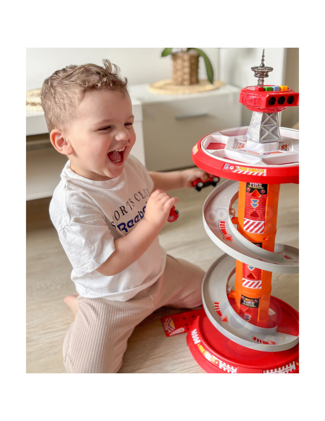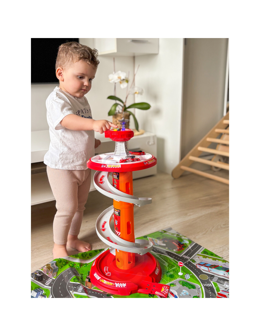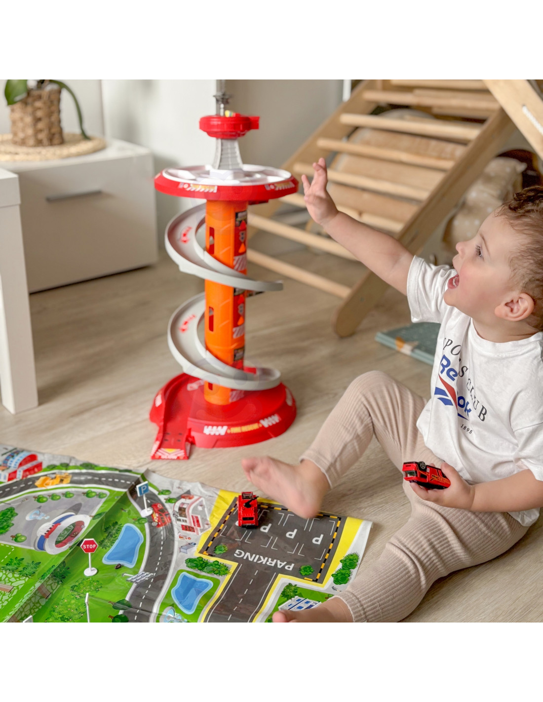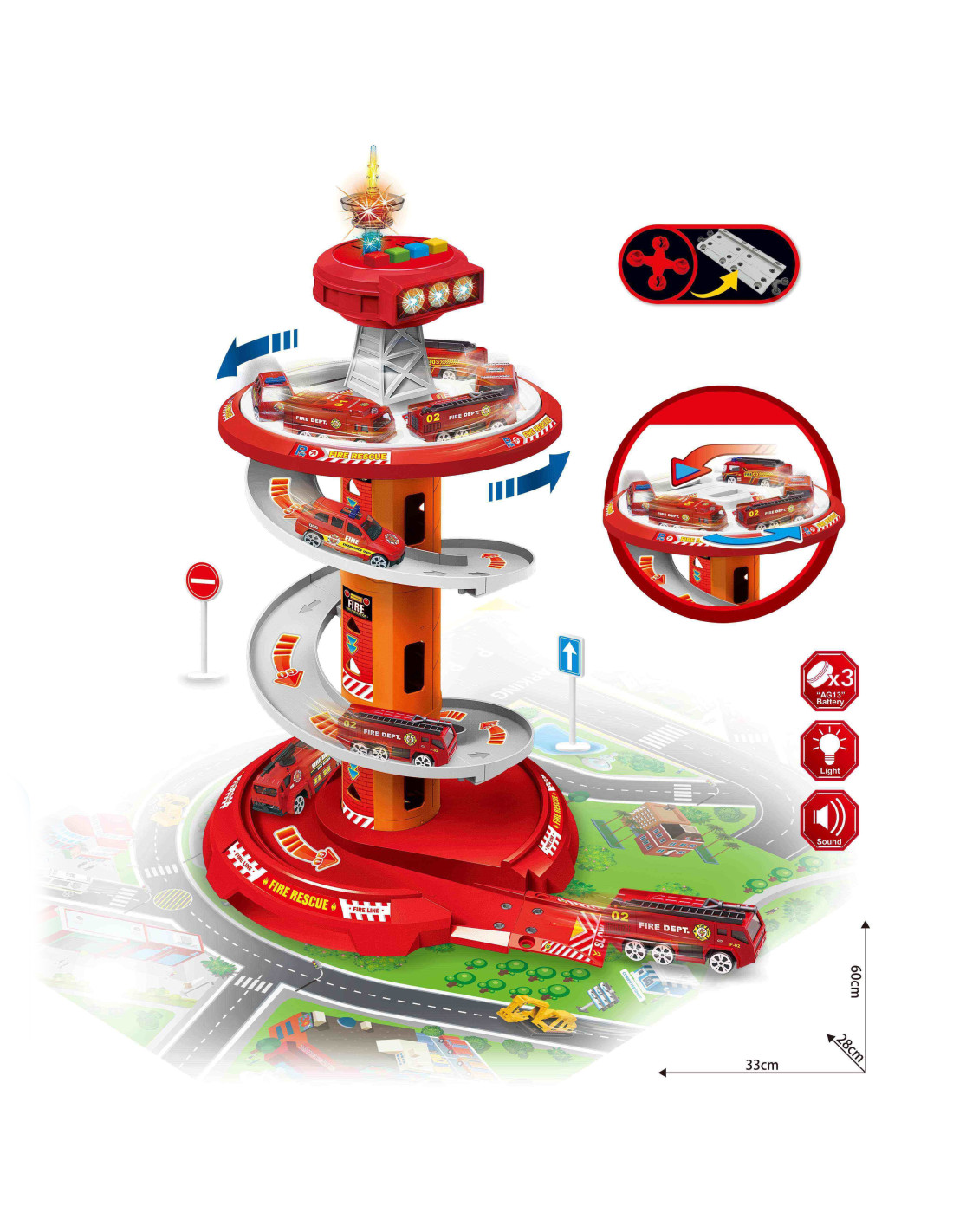 Rewelacyjny wielopoziomowy parking garaż obrotowy dla Straży Pożarnej od firmy Woopie na pewno przypadnie dziecku do gustu. Zabawka ta rozbudzi wyobraźnię każdego fana służb mundurowych która po wyjeździe z parkingu wkracza na załączoną do zestawu drogę. Szybki zjazd samochodów z poszczególnych poziomów umożliwia specjalny, kręty zjazd. Ponadto w zestawie znajdują się 3 różne samochody straży pożarnej.