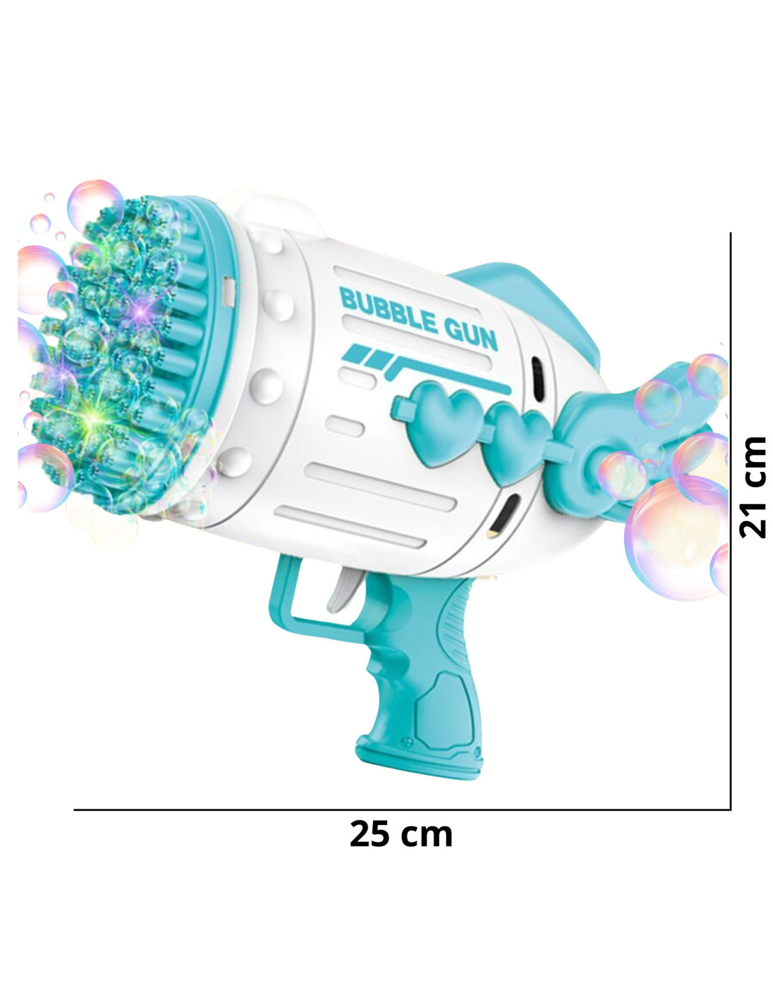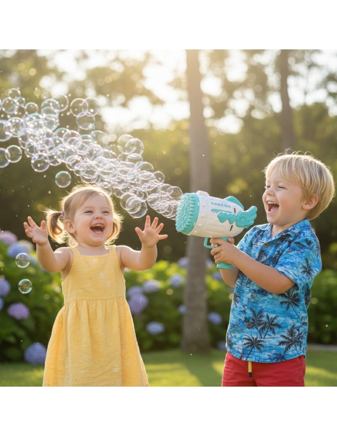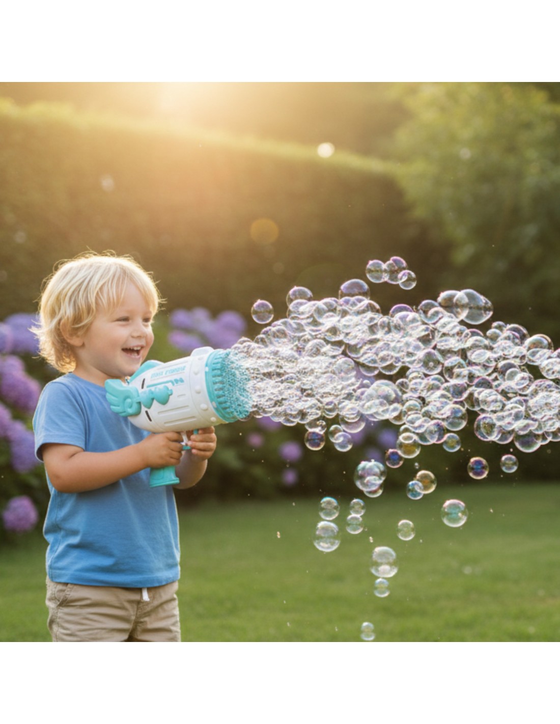 - Łatwy w użyciu i ładowaniu- ergonomiczny uchwyt pistoletu zapewnia wygodne trzymanie i precyzyjne celowanie. Wystarczy napełnić pojemnik płynem i nacisnąć spust, aby rozpocząć pokaz baniek.
