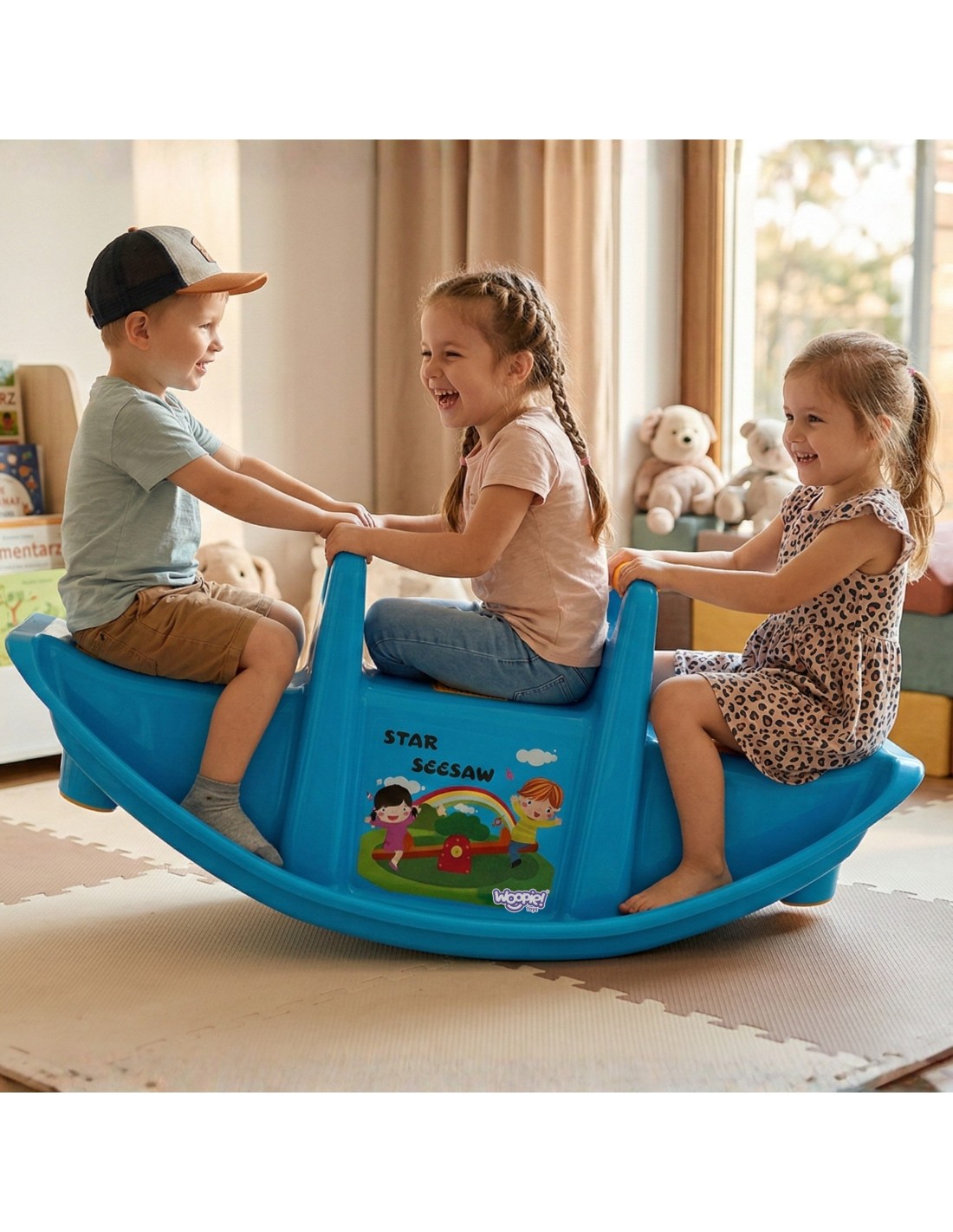 Bujak Wieloosobowy STAR Niebieski marki Woopie jest prawdziwą gwiazdą wśród dzieci! Z bujaka może korzystać maksymalnie troje dzieci jednocześnie, a nawet jedno będzie się świetnie bawić. Gdy dzieci bujają się we dwójkę to dodatkowo rozwija u nich zdolności do współpracy. Bujaczek posiada specjalne nakładki antypoślizgowe na siedzisko oraz chroniące rączki. Bujak sam w sobie dostarcza wiele korzyści dla dzieci. Bujanie samo w sobie uspokaja dziecko oraz rozwija zdolności motoryczne ciała, co jest idealne dla prawidłowego rozwoju. Z huśtawki można korzystać zarówno w domu jak, i na zewnątrz!