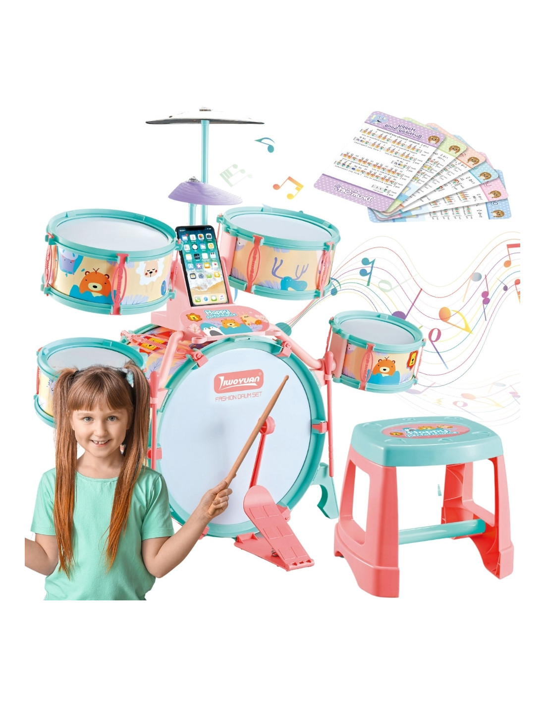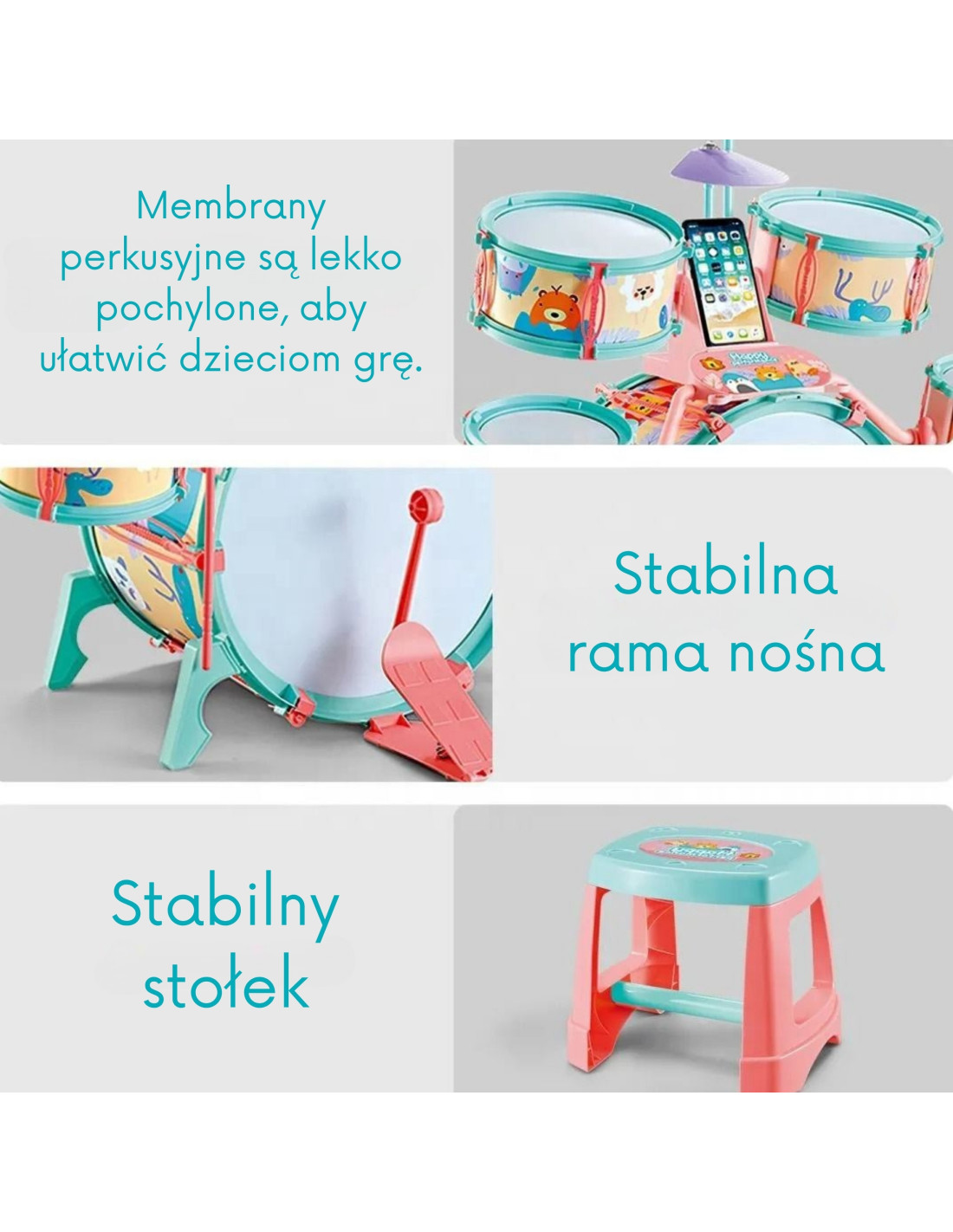 WOOPIE Perkusja Edukacyjna dla Dzieci 5 Bębnów 1 Talerz + Taboret z Motywem Zwierzątek